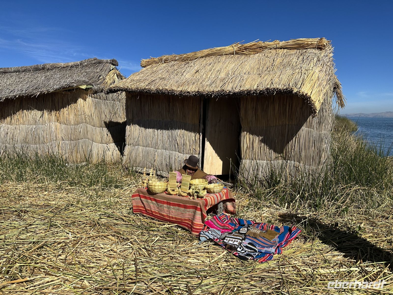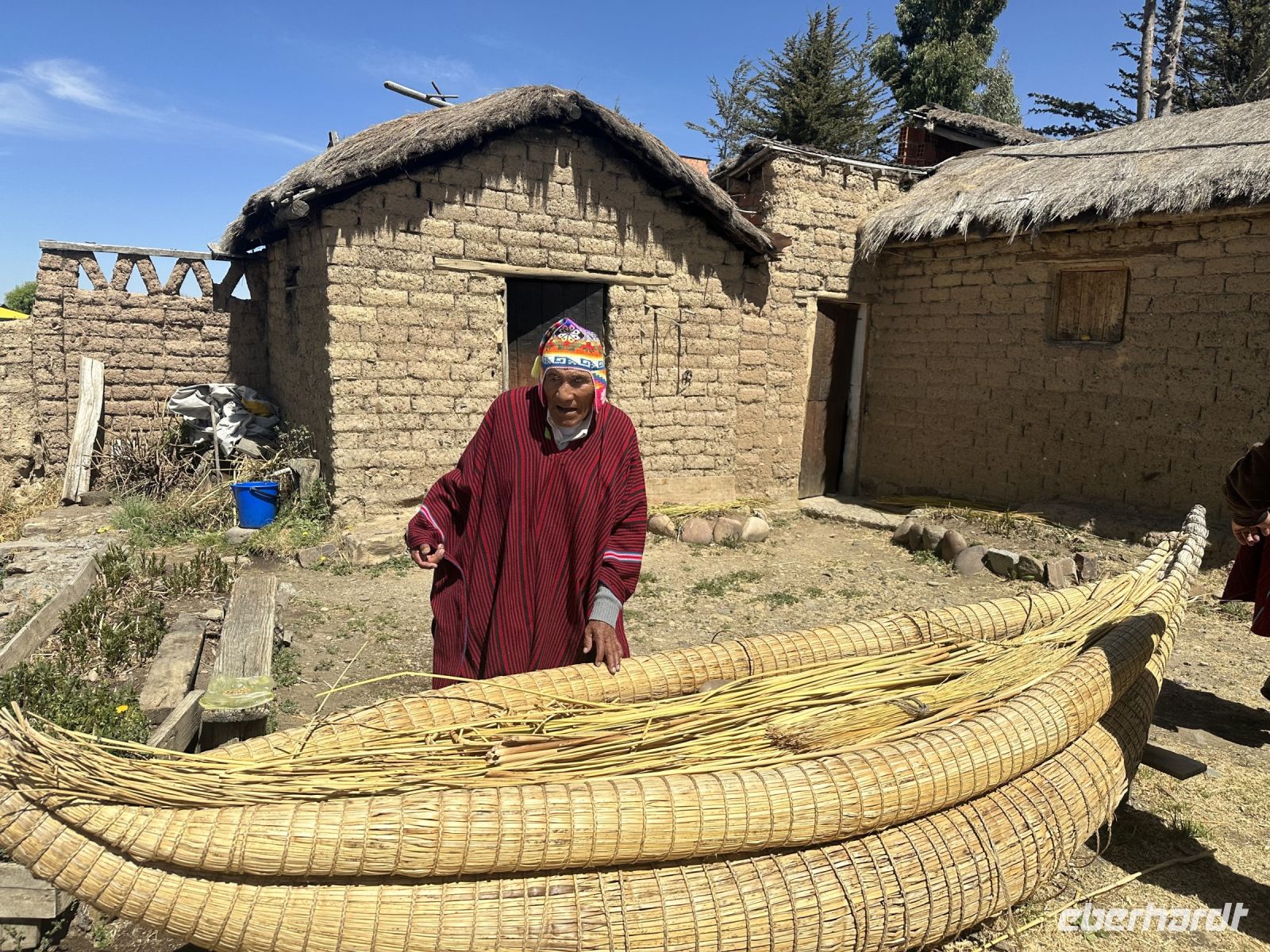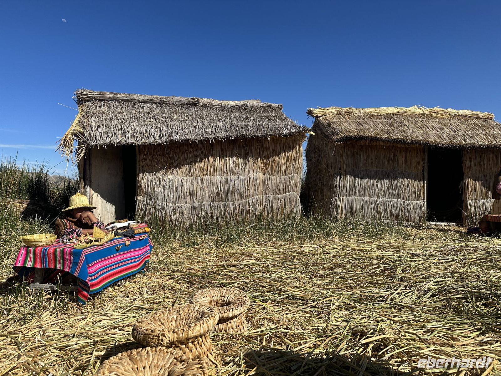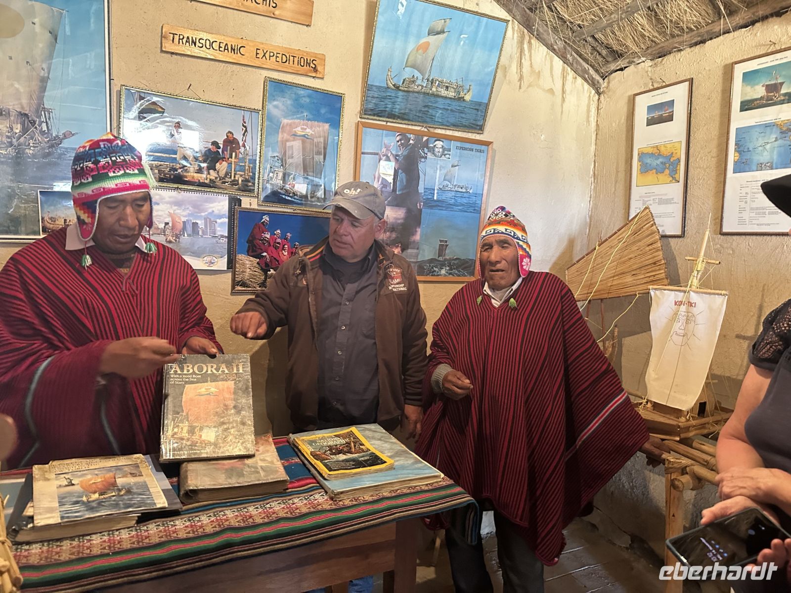 Der Tag beginnt um sieben Uhr mit dem Frühstück im Hotel. Die Koffer haben wir vor die Zimmertür gestellt und fleißige Helfer befördern sie hinab. Da wir die einzigen Gäste sind, ist das Frühstück genau auf uns abgestimmt. Es gibt für jeden einen Teller mit einer Banane und einer Scheibe Melone, frisch aufgebackene Brötchen, dazu Butter und Marmelade. Eier in Form von Omelette oder Spiegelei können bestellt werden. Eine Stunde später gehen wir zum Ufer des Titicacasees, wo uns bereits ein Schnellboot erwartet. Mitten auf dem See steigen wir in ein anderes Boot um. Ein echter Uru ist jetzt unser Steuermann. Er trägt einen farbenfrohen Poncho und lässt sich geduldig mit jedem von uns fotografieren. Kurze Zeit später legen wir an einer schwimmenden Insel an. Auf der Insel befinden sich mehrere Hütten und zwei Frauen verkaufen handgefertigte Souvenirs. Eine Bank in Form eines Schilfbootes und einige kleine Höckerchen laden zum Platz nehmen ein. Der Häuptling der Uru-Familie stellt sich vor und heißt uns herzlich willkommen. Er zeigt uns wie verschiedene Naturmaterialien von den Urus verwendet werden. Wir dürfen in die (bescheidenen) Hütten schauen und kaufen auch ein paar Souvenirs. Auf dem gleichen Weg, den wir gekommen sind, geht es wieder zurück. In Huatayata besuchen wir nun das Museum des Hotels. Wir erfahren, dass direkt hier die Schilfboote für zwei Expeditionen von Thor Heyerdahl gebaut wurden. Dabei handelte es sich um die Boote Ra - 1969 und Ra 2 - 1970. Das erste Boot ließ Thor Heyerdahl nach Bildern ägyptischer Reliefs und nach Tonmodellen, die als Grabbeigaben gefunden wurden, im Tschad bauen. Er war überzeugt, dass Völker aus dem Norden Afrikas mit Schilfbooten den Atlantik überqueren konnten. Aus verschiedenen Gründen gelang diese Expedition nicht. Nun wandte sich Heyerdahl an vier Aymara-Baumeister am Titicacasee und die Atlantiküberquerung gelang. Wir können einen Nachbau der Schilfboote besichtigen und beide Baumeister (Vater und Sohn) zeigen uns stolz Fotos und Zeitschriften, die über sie berichten. Noch immer gibt es Expeditionen, die mit Schilfbooten unternommen werden. Bekannt sind die ABORA 1 bis 4 Experimente des deutschen Abenteurers Dominique Götze, der von Thor Heyerdahl inspiriert wurde.