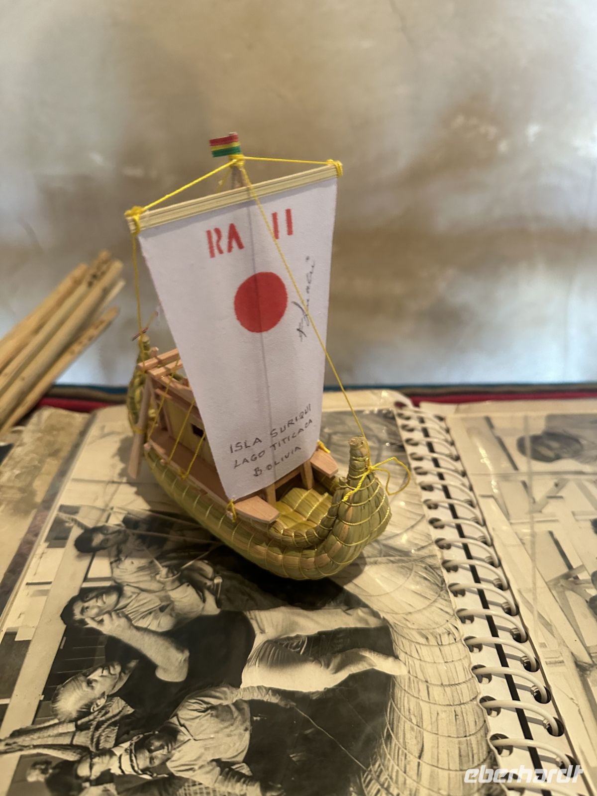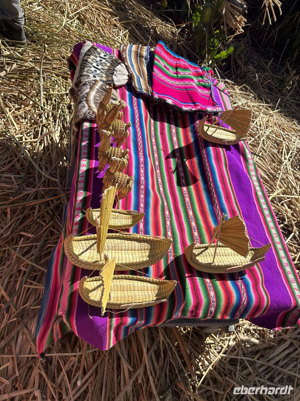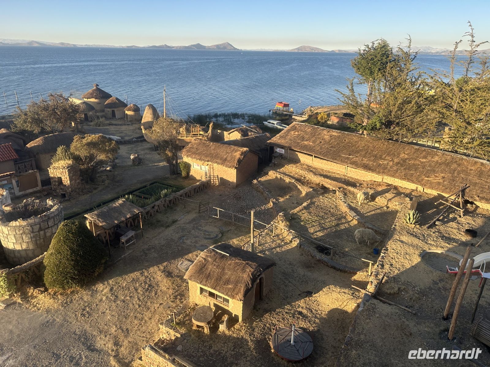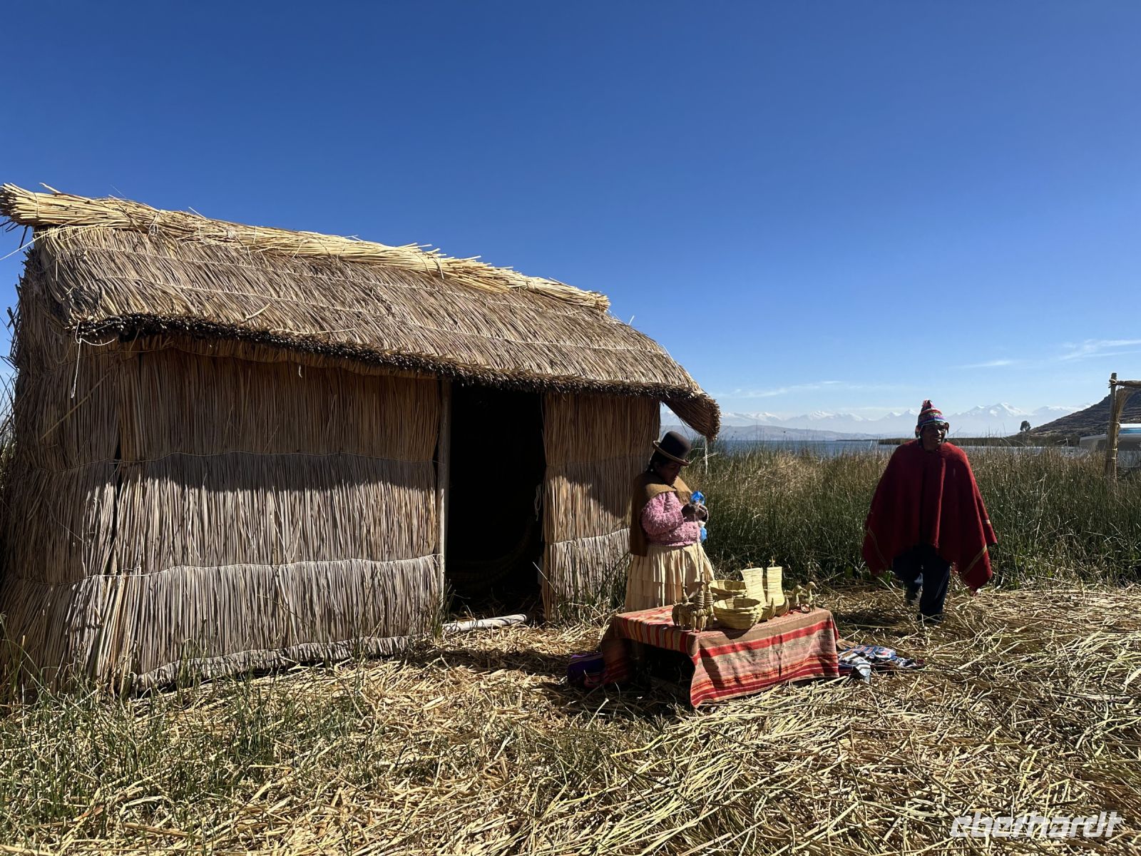 Der Tag beginnt um sieben Uhr mit dem Frühstück im Hotel. Die Koffer haben wir vor die Zimmertür gestellt und fleißige Helfer befördern sie hinab. Da wir die einzigen Gäste sind, ist das Frühstück genau auf uns abgestimmt. Es gibt für jeden einen Teller mit einer Banane und einer Scheibe Melone, frisch aufgebackene Brötchen, dazu Butter und Marmelade. Eier in Form von Omelette oder Spiegelei können bestellt werden. Eine Stunde später gehen wir zum Ufer des Titicacasees, wo uns bereits ein Schnellboot erwartet. Mitten auf dem See steigen wir in ein anderes Boot um. Ein echter Uru ist jetzt unser Steuermann. Er trägt einen farbenfrohen Poncho und lässt sich geduldig mit jedem von uns fotografieren. Kurze Zeit später legen wir an einer schwimmenden Insel an. Auf der Insel befinden sich mehrere Hütten und zwei Frauen verkaufen handgefertigte Souvenirs. Eine Bank in Form eines Schilfbootes und einige kleine Höckerchen laden zum Platz nehmen ein. Der Häuptling der Uru-Familie stellt sich vor und heißt uns herzlich willkommen. Er zeigt uns wie verschiedene Naturmaterialien von den Urus verwendet werden. Wir dürfen in die (bescheidenen) Hütten schauen und kaufen auch ein paar Souvenirs. Auf dem gleichen Weg, den wir gekommen sind, geht es wieder zurück. In Huatayata besuchen wir nun das Museum des Hotels. Wir erfahren, dass direkt hier die Schilfboote für zwei Expeditionen von Thor Heyerdahl gebaut wurden. Dabei handelte es sich um die Boote Ra - 1969 und Ra 2 - 1970. Das erste Boot ließ Thor Heyerdahl nach Bildern ägyptischer Reliefs und nach Tonmodellen, die als Grabbeigaben gefunden wurden, im Tschad bauen. Er war überzeugt, dass Völker aus dem Norden Afrikas mit Schilfbooten den Atlantik überqueren konnten. Aus verschiedenen Gründen gelang diese Expedition nicht. Nun wandte sich Heyerdahl an vier Aymara-Baumeister am Titicacasee und die Atlantiküberquerung gelang. Wir können einen Nachbau der Schilfboote besichtigen und beide Baumeister (Vater und Sohn) zeigen uns stolz Fotos und Zeitschriften, die über sie berichten. Noch immer gibt es Expeditionen, die mit Schilfbooten unternommen werden. Bekannt sind die ABORA 1 bis 4 Experimente des deutschen Abenteurers Dominique Götze, der von Thor Heyerdahl inspiriert wurde.