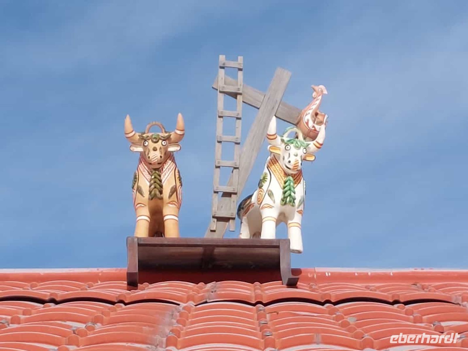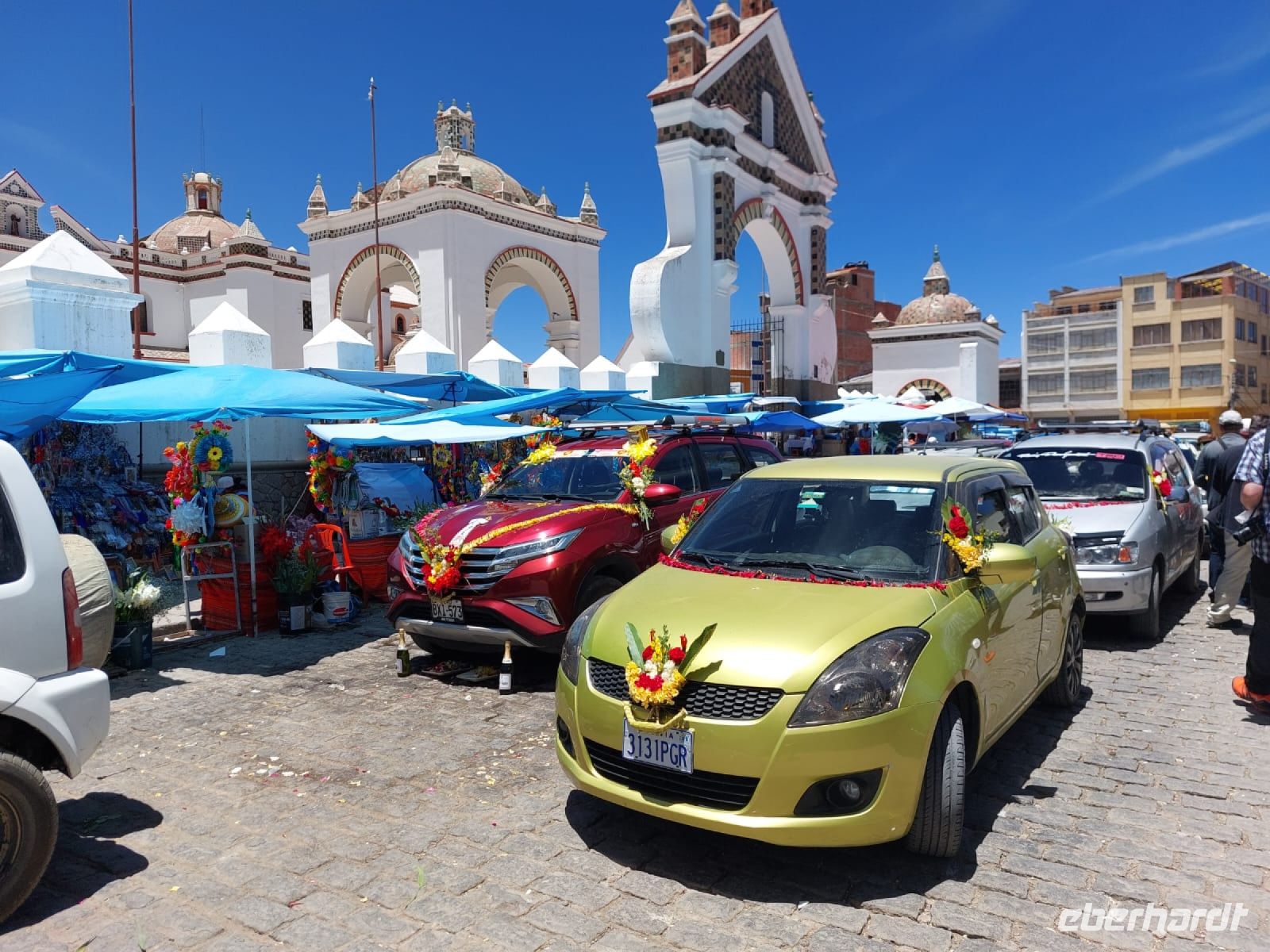 Am Grenzübergang nehmen wir unser Handgepäck mit, die Koffer werden von fleißigen Helfern über die Grenze gebracht. Wir sind zum Glück der erste Bus heute und haben keine Wartezeit. Als erstes begeben wir uns zur Passkontrolle. Anschließend WC und Wechselstube. Empfohlen sind 50 € pro Person, da Kreditkarten in Bolivien wenig bis gar nicht akzeptiert werden. Nachdem auch das erledigt ist, gehen wir die circa hundert Meter bis zur Grenze. Hier gibt es eine Plakette auf dem Boden, wo wir uns mit einem Fuß in Peru und einem Fuß in Bolivien fotografieren können. Benito putzt die Plakette sogar für uns und übergibt uns dann seinen Kollegen José, der unser örtlicher Reiseleiter in Bolivien sein wird. Unser Busfahrer heißt Ramiros und das Gepäck ist bereits verladen. Wir fahren nach Copacabana, einem der bedeutendsten Wallfahrtsorte Boliviens. Copacabana ist ein indigener Begriff und heißt eigentlich nur „Blick ins Blaue“. In Copacabana besuchen wir die Kathedrale, werden doch zunächst vom bunten Alltag der Bewohner überrascht. Die Autos sind mit bunten Hüten und Blumen geschmückt. José erklärt uns, dass die Autos hier gesegnet werden, damit der Fahrer sicher ist, dass ihm nichts zustoßen kann. An einem Marktstand zeigt uns José, was die Bolivianer alles segnen lassen können. Es sieht aus wie an einem Spielzeugstand, man kann Häuser, Autos, Schatztruhen und sogar Babypüppchen erwerben, je nachdem, was man sich für die Zukunft wünscht.