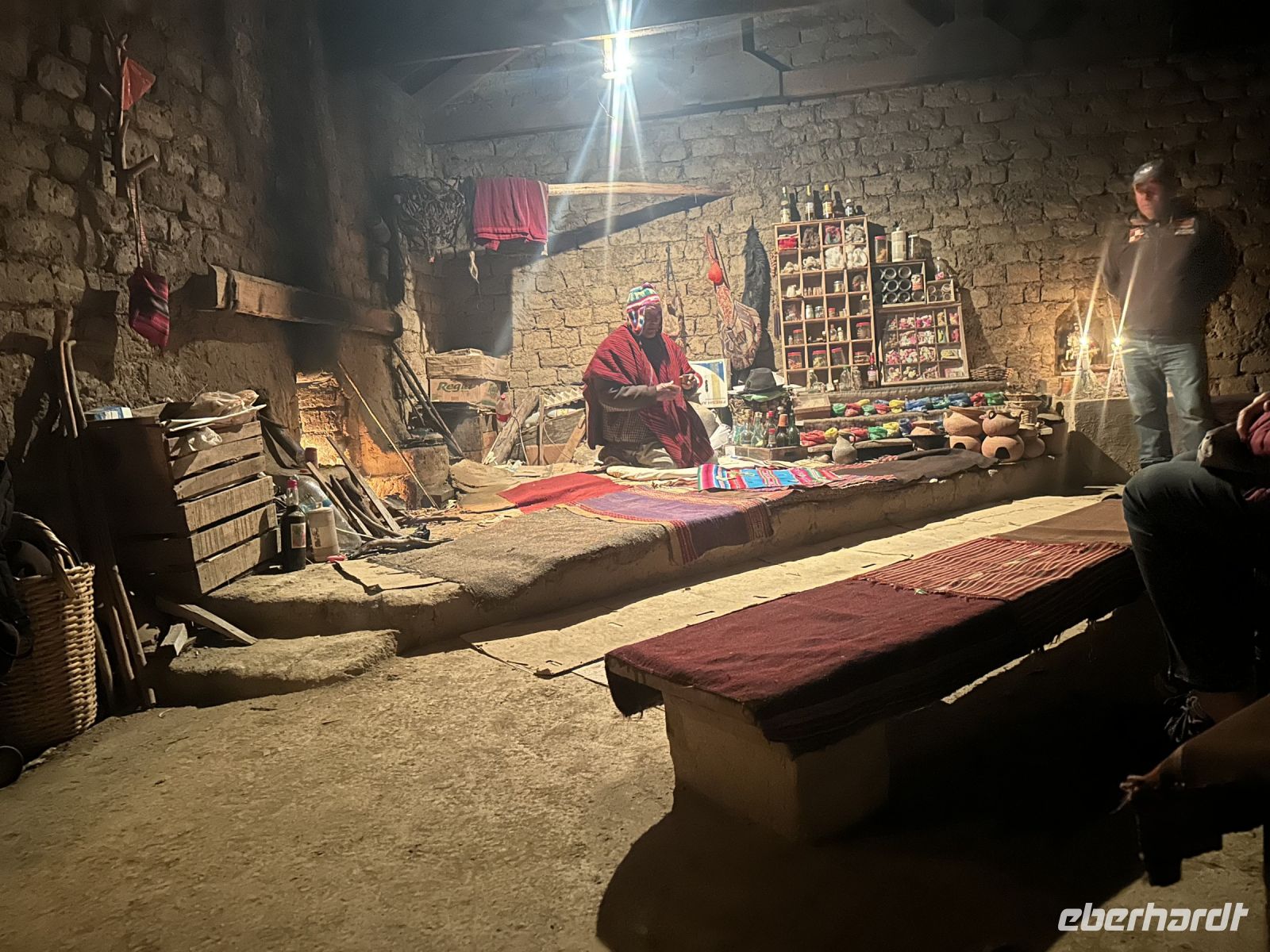 Weiter geht es nun durch eine im Dunklen verschwindend Landschaft bis zu unserem Hotel. Aber noch ist das Tagesprogramm nicht beendet. Bei einer kurzen Filmvorführung erfahren wir einiges über das Leben und Wirken der Schamanen am Titicacasee. Anschließend besuchen wir eine Ausstellung zu diesem Thema und letztendlich erwartet uns ein echter Schamane, der sich und sein Wirken vorstellt. Wir werden aufgefordert, ihm eine Frage zu stellen, deren Antwort er aus Kokablättern abliest, die er vorher in die Höhe geworfen hat. Jedes Blatt hat eine dunkle (negative) Seite und eine helle (positive). Je nachdem wie die Blätter fallen, fällt auch die entsprechende Antwort aus.