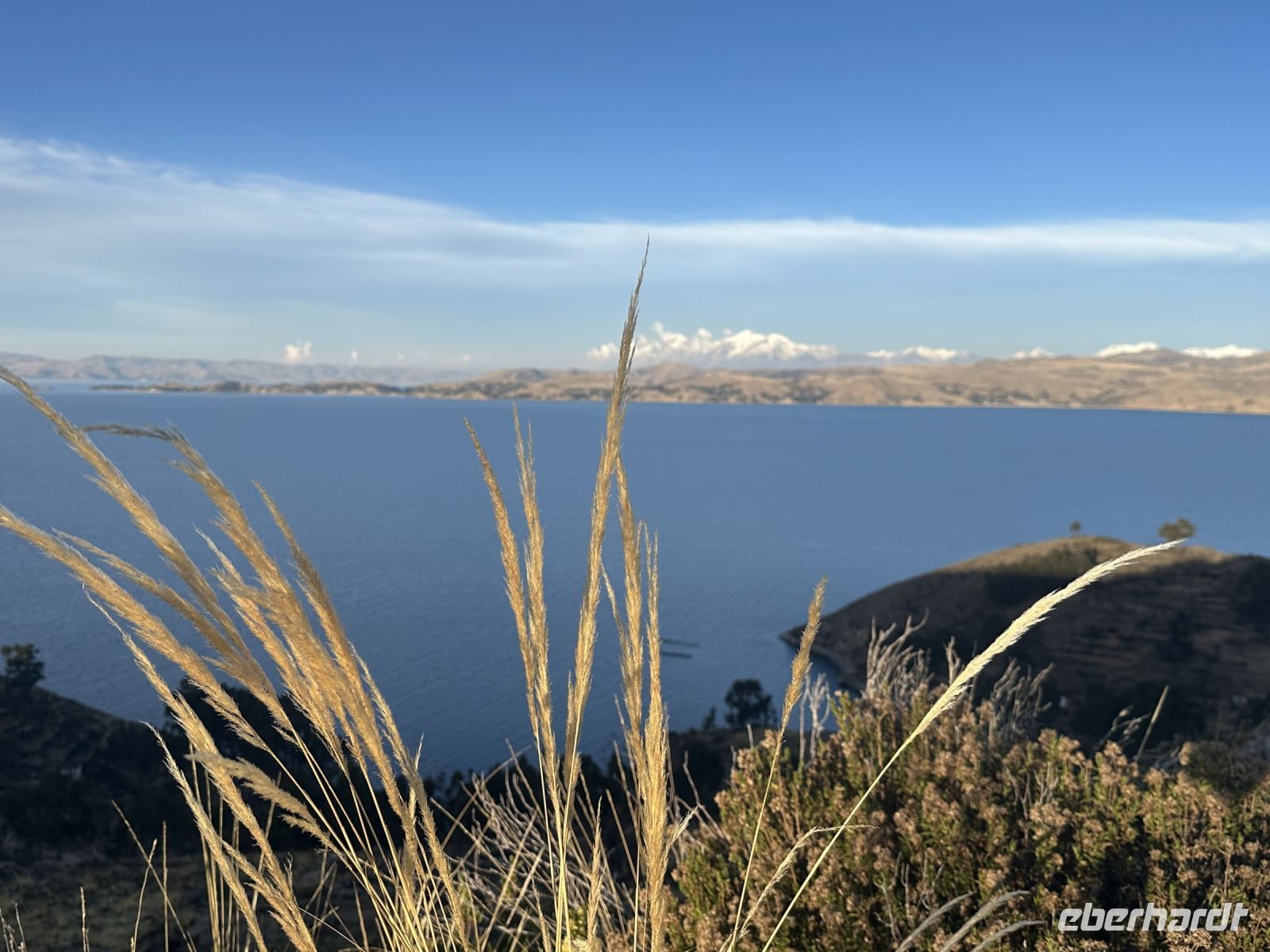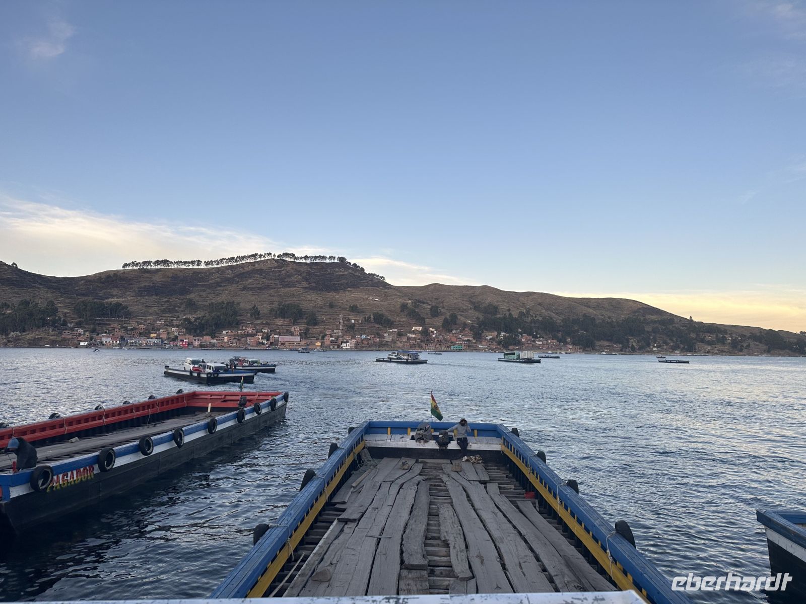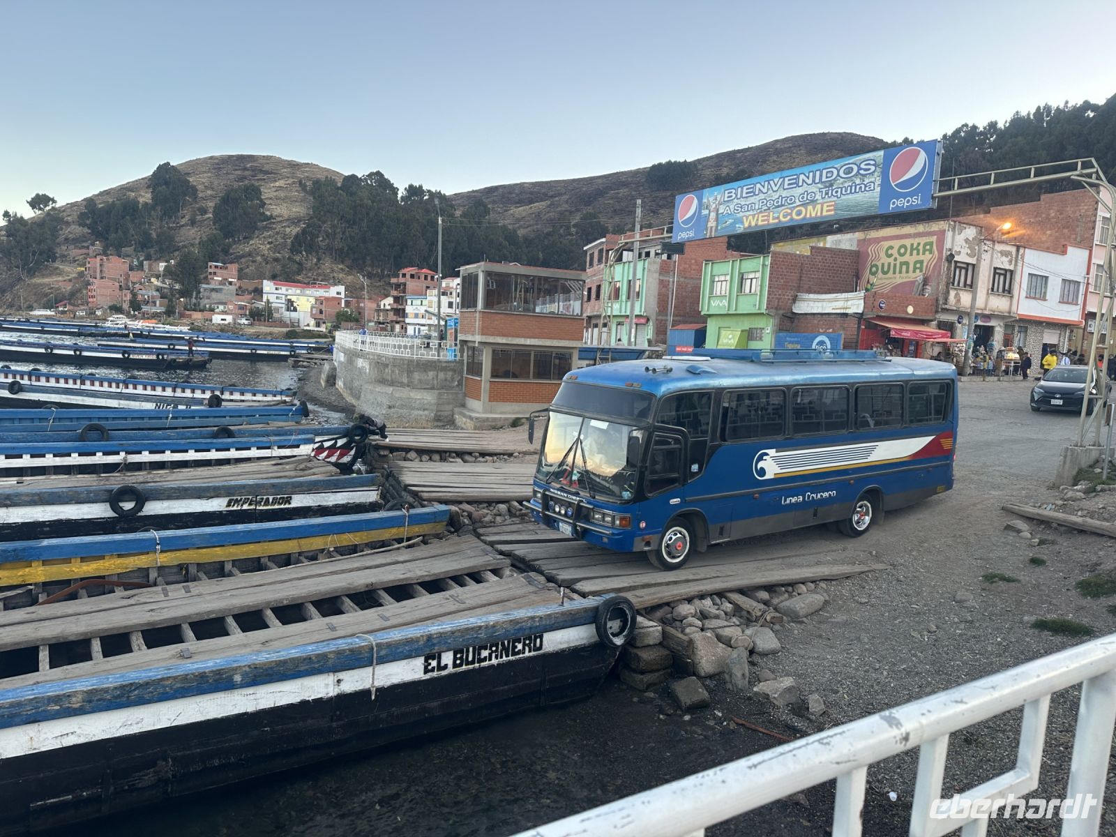 Zurück an Land geht es für uns mit dem Bus immer weiter höher bis auf über 4000 Meter. Wir legen einige Fotostopps ein und können uns an der Aussicht auf den Titicacasee kaum satt sehen. Im Hintergrund sind die Ausläufer der Kordilleren, Berge mit weißen Spitzen gut zu sehen. Am frühen Abend erreichen wir eine schmale Stelle des Titicacasees, die wir mit einer Fähre überwinden müssen. der Bus wird separat transportiert, es ist recht aufregend, zu beobachten, wie die kleinen Schiffchen, Busse und PKWs laden und zum anderen Ufer bringen. Wir werden in ein kleineres Boot verladen und warten am anderen Ufer, beim Sonnenuntergang auf unseren Bus.