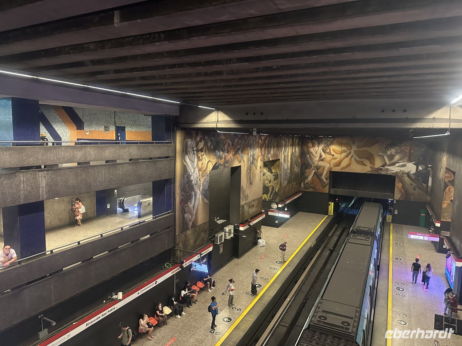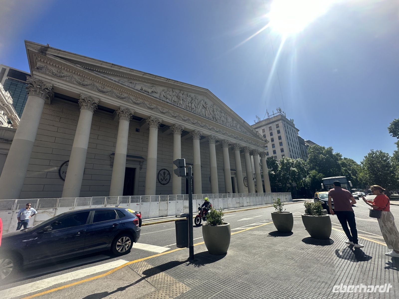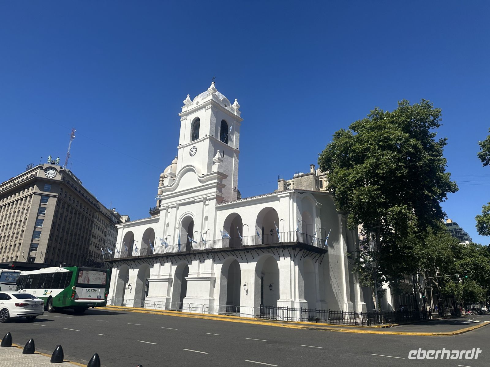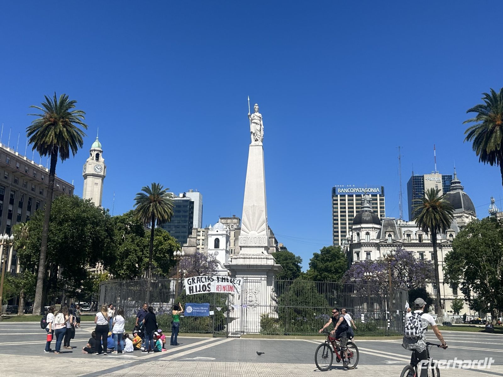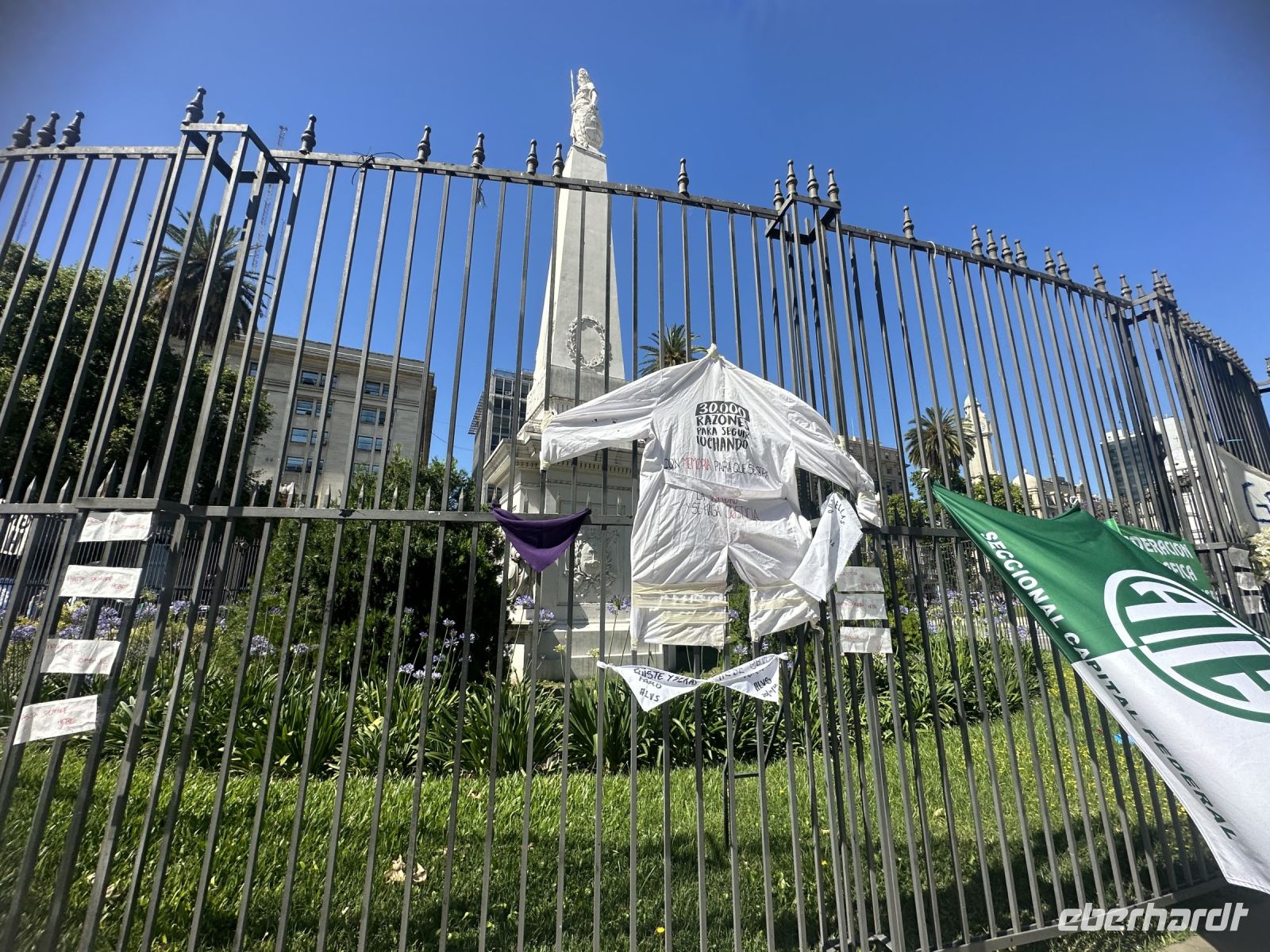 Die kleine Verspätung, mit der Isabel heute zur Stadtführung kommt, weil ihre U-Bahn nicht fährt, entpuppt sich kurze Zeit später für uns als Vorteil. Wir gehen zunächst zu Fuß, um in einem kleinen Laden Wasser zu kaufen. Weiter geht es bis zur Kathedrale, die wir just in dem Moment erreichen, wo es eine Wachablösung gibt. In der Kathedrale (bzw. außerhalb) befindet sich das Grabmal von General José de San Martin, der als Befreier Argentiniens gilt. Aus religiösen Gründen/Zwistigkeiten hätte er nicht in der Kathedrale seine letzte Ruhestätte finden dürfen, da man dies aber unbedingt wollte, fand man einen Kompromiss in einer Art Anbau und so ruht der General nun quasi in, aber auch außerhalb des Kirchengebäudes. Wir spazieren weiter, vorbei an den vielen Bügeleisenhäusern, die hier nicht so genannt werden, aber es dennoch sind. Wir kommen zum Plaza de Mayo, wo auf dem Boden viele weiße Kopftücher abgebildet sind, zur Erinnerung an die Mütter, die hier demonstrierten, weil ihre Kinder als Studenten während der Militärdiktatur spurlos verschwunden sind. Das Ganze ist inzwischen lange her, die Mütter sind alt oder verstorben. Gerade vor ein paar Tagen verstarb über 90 jährig Hebe, eine der führenden Frauen dieser Bewegung. Einige Transparente mit der Aufschrift Thank you Hebe, erinnern an diese starke Frau.