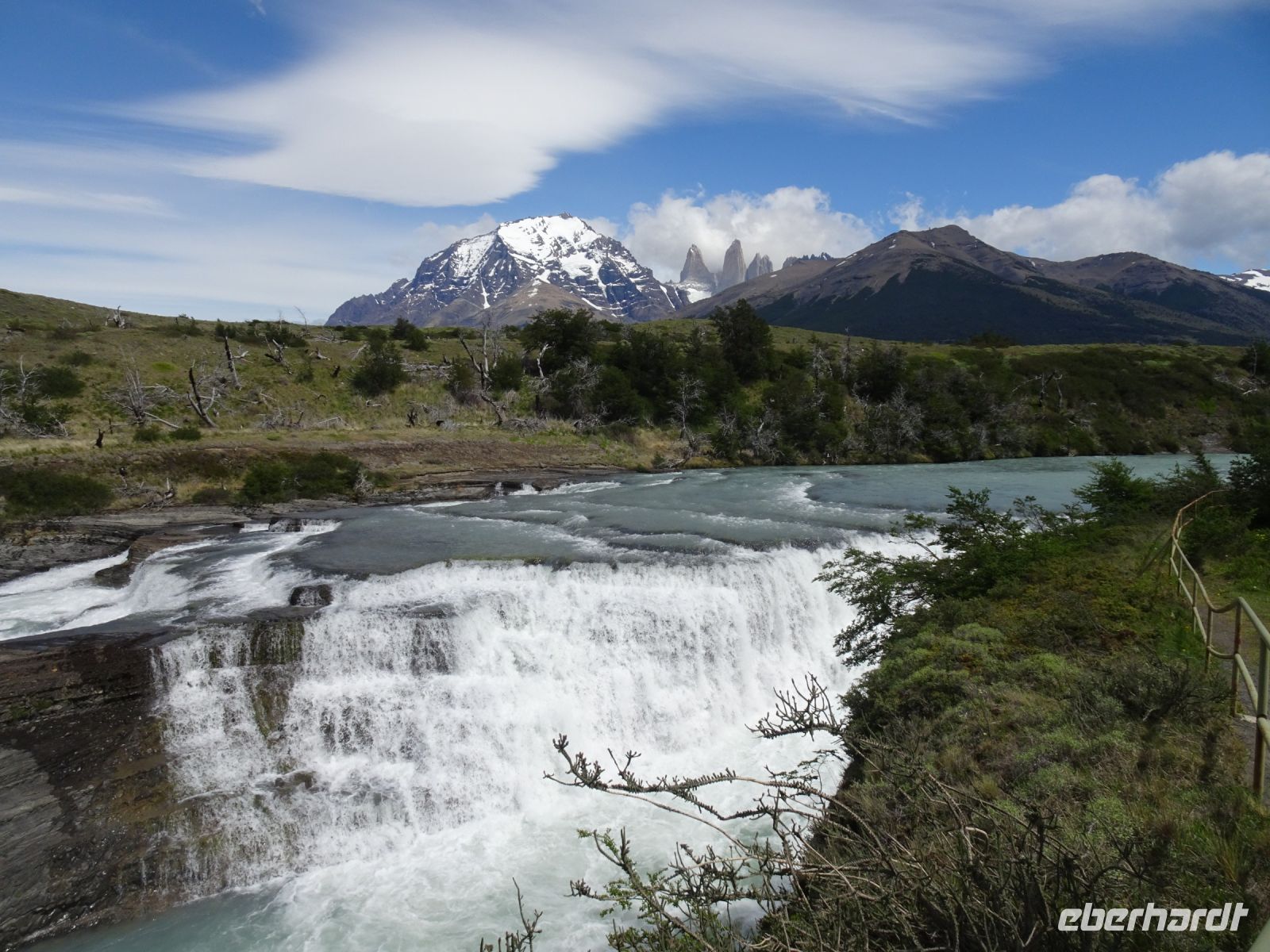 Gegen halb zwölf erreichen wir den Nationalpark. Parque Nacional Torres del Paine - das ist der offizielle Name des Parks. Von den zweitausendvierhundert Quadratkilometern werden wir nur wenig, aber dafür das Spektakulärste bewundern. Und das Wetter! ist uns wieder hold. Die imposanten Torres, also die Türme und die Cuernos del Paine - die sogenannten Hörner - zeigen sich in voller Pracht. 2200 bis 2600 Meter hoch sind sie. An der Laguna Amarga stürzt ein Fluss über Klippen und bildet so einen imposanten Wasserfall.