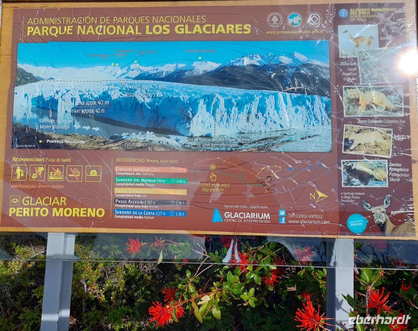 Wir starten gegen 9 Uhr und brauchen mit dem Bus etwa eineinhalb Stunden. Wir sind mit Lunchpaketen ausgestattet, feste Schuhe, Hut, Sonnenbrille und vor allem Sonnencreme sind empfohlen. Nach zehn Minuten Fahrt legen wir den ersten Fotostopp ein. Paramela heißt die gelbe Pflanze, die es hier zu bewundern gibt. Gegen zehn haben wir den ersten Blick auf den Perito Moreno Gletscher, der ein Teil des Patagonischen Eisfeldes bildet. Die Südwand, die wir sehen, ist zwei Kilometer breit und von hier aus sieben Kilometer entfernt, was wir kaum glauben können, so nah erscheint uns der Gletscher. In der Mitte bewegt sich das Eis laut Gerrard zwei Meter am Tag. Über Laufstege unternehmen wir einen Spaziergang, der uns immer näher an den Gletscher bringt. Ein lautes Knacken kündet vom Kalben des Gletschers, das wir zwar sehen und erleben, aber nicht fotografieren können, zu schnell und zu überraschend kommt es zu den kleinen Abbrüchen. Perito Moreno, nach dem der Gletscher benannt ist, war ein argentinischer Geograph und Entdecker. Er erforschte Patagonien und die hier vorhandene Tier- und Pflanzenwelt. Perito ist nicht sein Vorname, sondern bedeutet so viel wie Sachverständiger. Manchmal findet sich für den Gletscher auch die Bezeichnung "das Blaue Wunder von Argentinien" - das dieser Name angemessen ist, können wir nach eigenem Erleben bestätigen. Beim Sichten unserer vielen Fotos war ich nochmal richtig gerührt von der Schönheit dieser Landschaft, die uns von der Natur geschenkt wurde. Der Gletscher ist ziemlich groß - immerhin etwa 250 Quadratkilometer und ist damit nach der Antarktis das zweitgrößte Gletschergebiet der Südhalbkugel. Interessant ist auch, dass der Perito-Moreno-Gletscher nicht schrumpft. Wissenschaftler haben festgestellt, dass die Eismasse seit Jahrzehnten stabil ist. Gerrard hat auch von einem seltenen Naturereignis erzählt. Manchmal passiert es , dass die Eismassen den südlichen Arm des Lago Argentino abschneiden und sich eine gigantische Eisbrücke bildet. Irgendwann und niemand kann das voraussagen, bricht die Brücke wieder zusammen. Etliche Fotografen warten tage- und nächtelang auf dieses Spektakel. So auch unser Gerrard. Pech gehabt, am Tag, nachdem er seinen Aussichtspunkt verlassen hat, krachte die Brücke zusammen - ohne ihn. Wie schade.