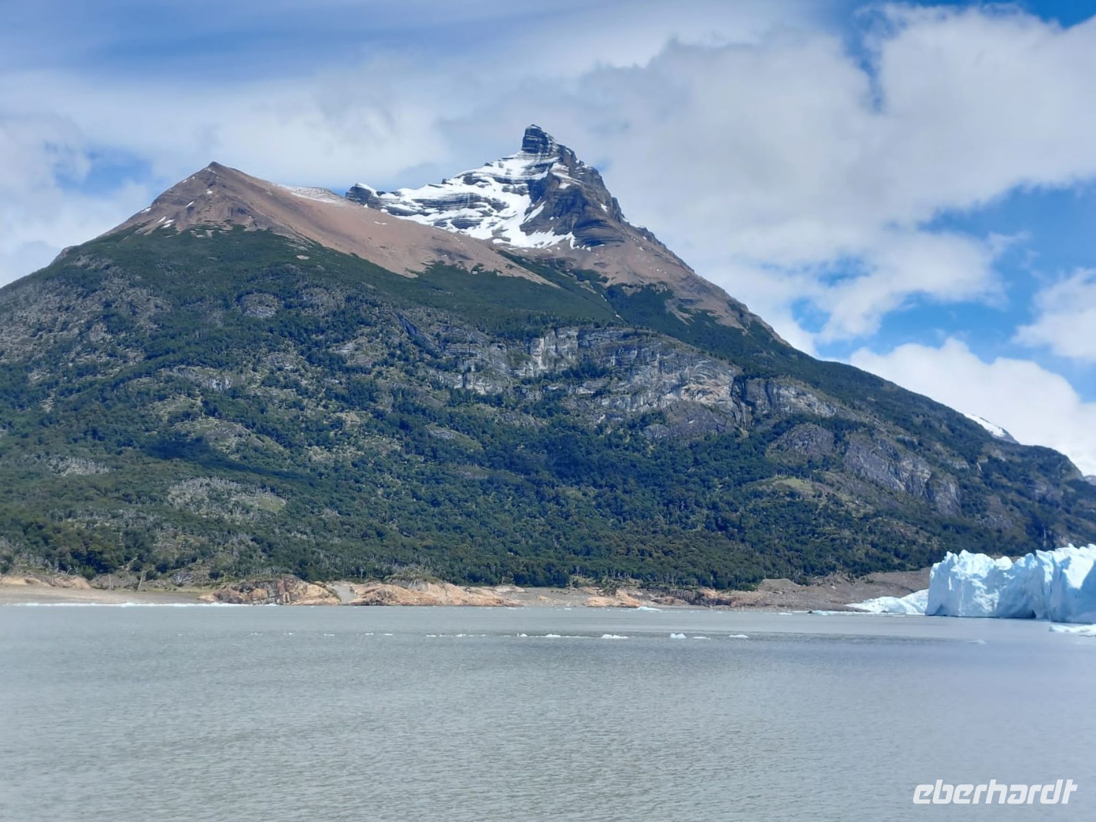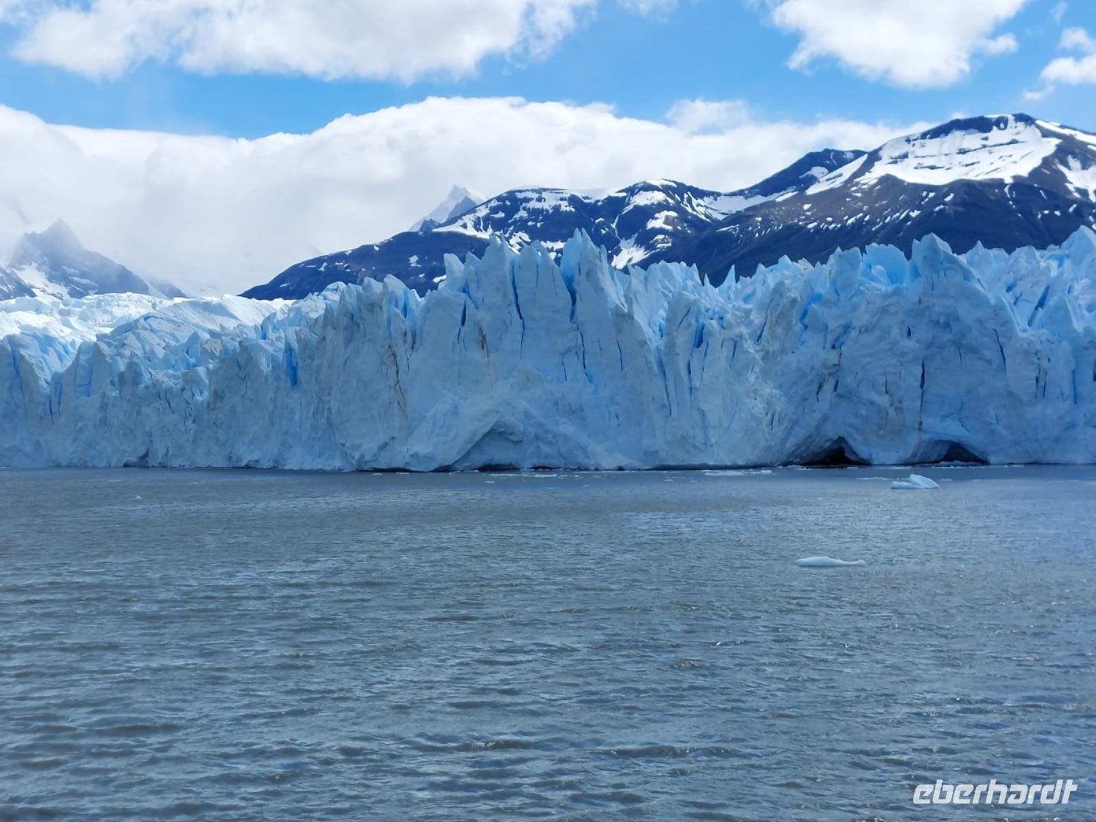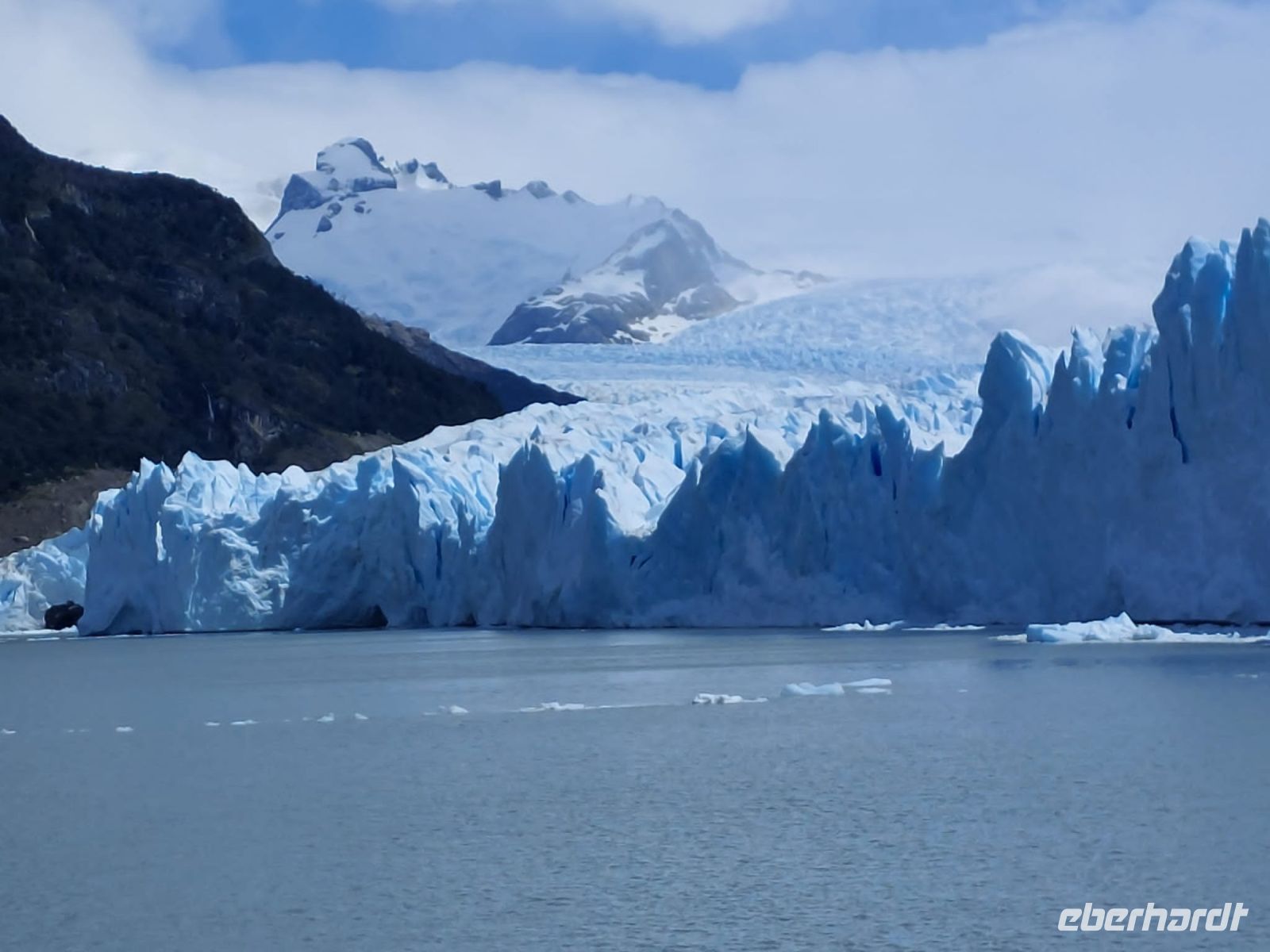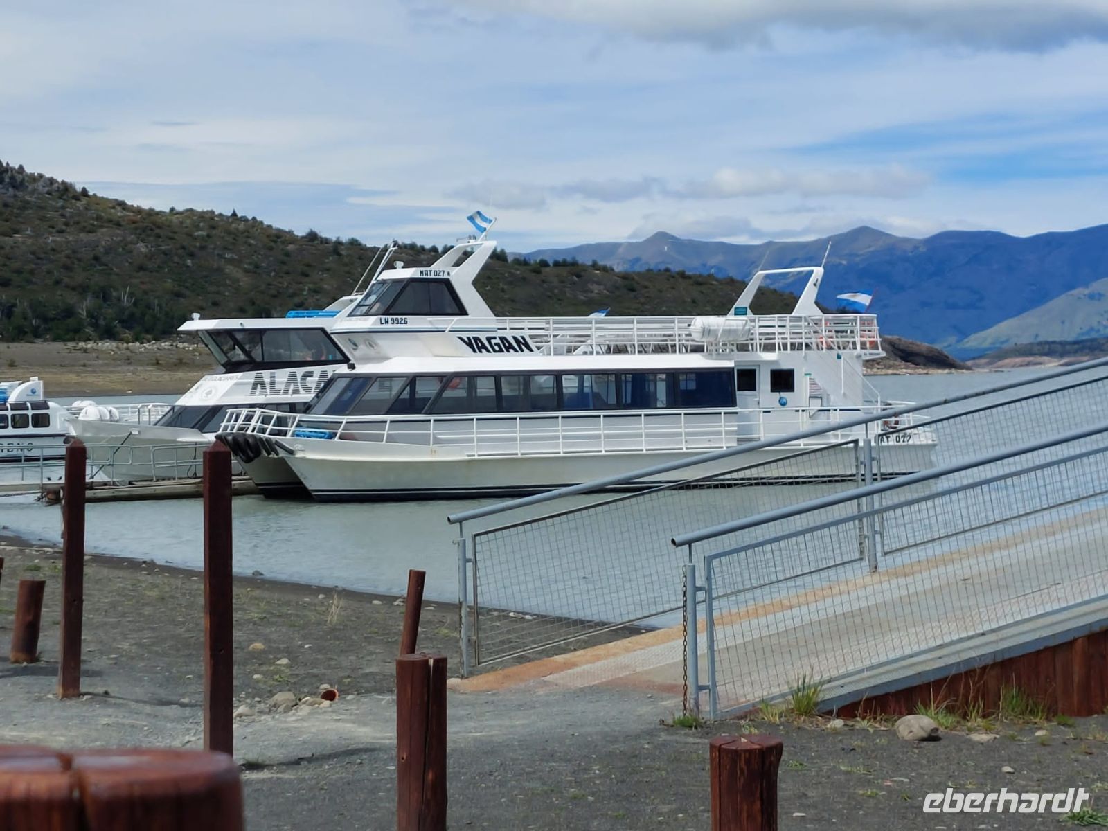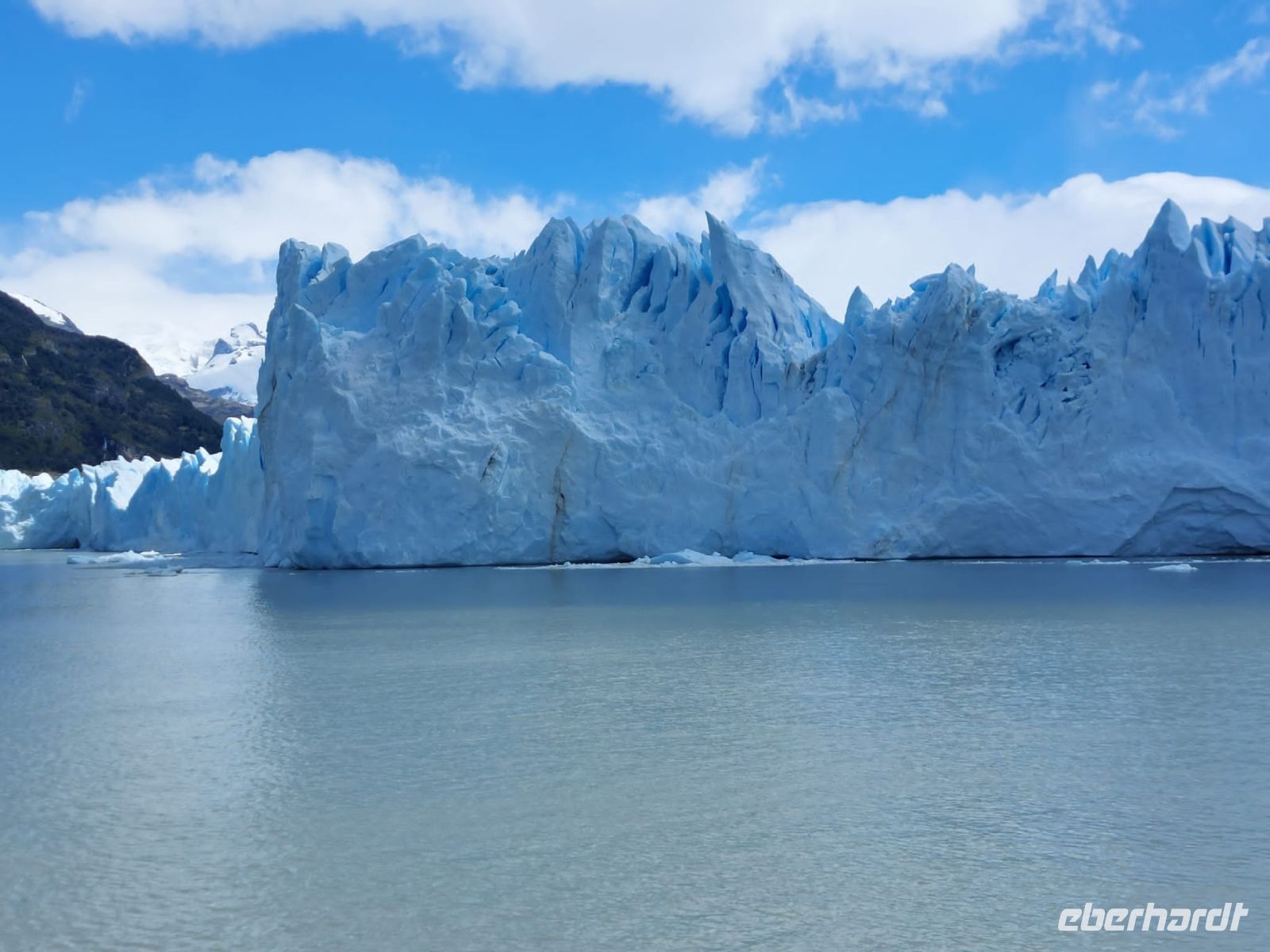 Der Jeep entpuppt sich später als Allrad-Bus, aber ansonsten war es ein himmlischer Tag. Nach einem frühen Frühstück werden wir halb acht von einem einheimischen Bus abgeholt. Heute sind wir ohne eigenen örtlichen Reiseleiter unterwegs. Bevor wir zum Hafen fahren, sammeln wir noch einige wenige fremde Gäste ein. Bis zum Hafen am Lago Argentino fahren wir etwa eine Stunde. Der See Lago Argentino ist gewaltig von seinen Ausmaßen - dreimal so groß wie der Bodensee und über fünfzehntausend Jahre alt. Sein Wasser kommt aus dem Uppsala- und dem Perito-Moreno-Gletscher.