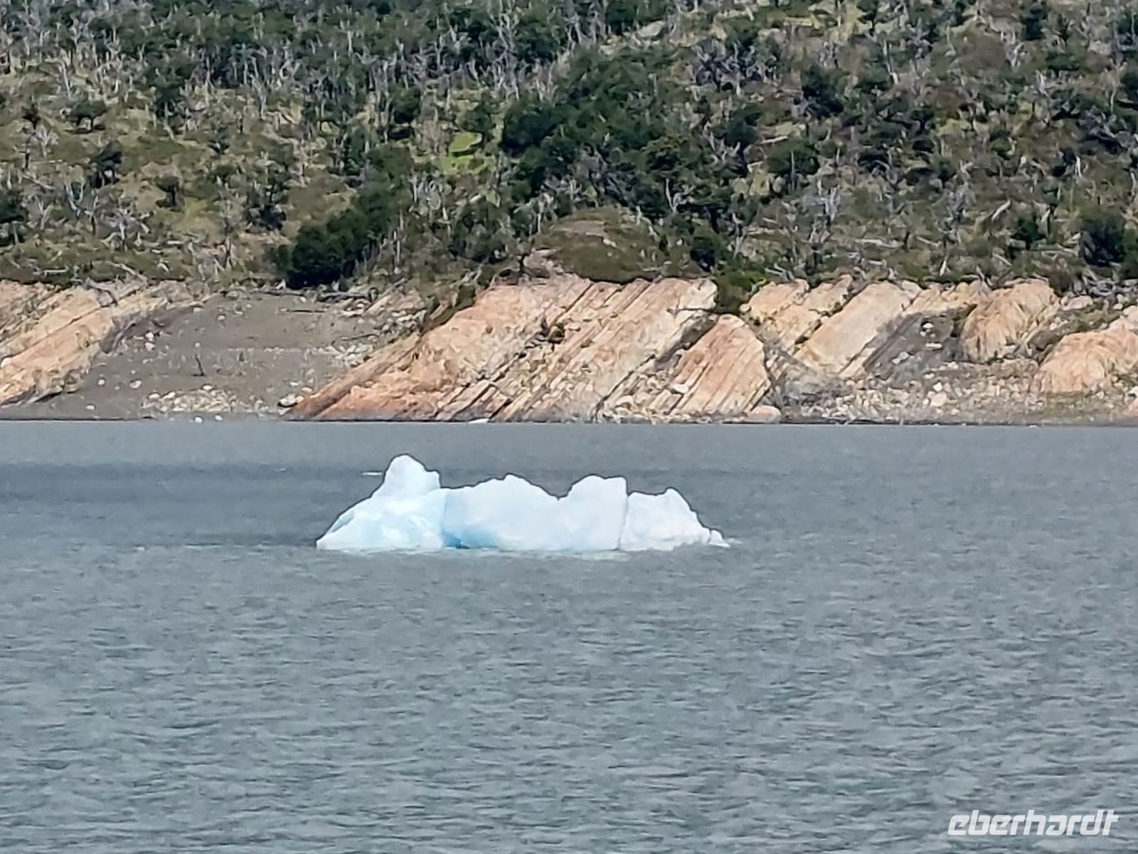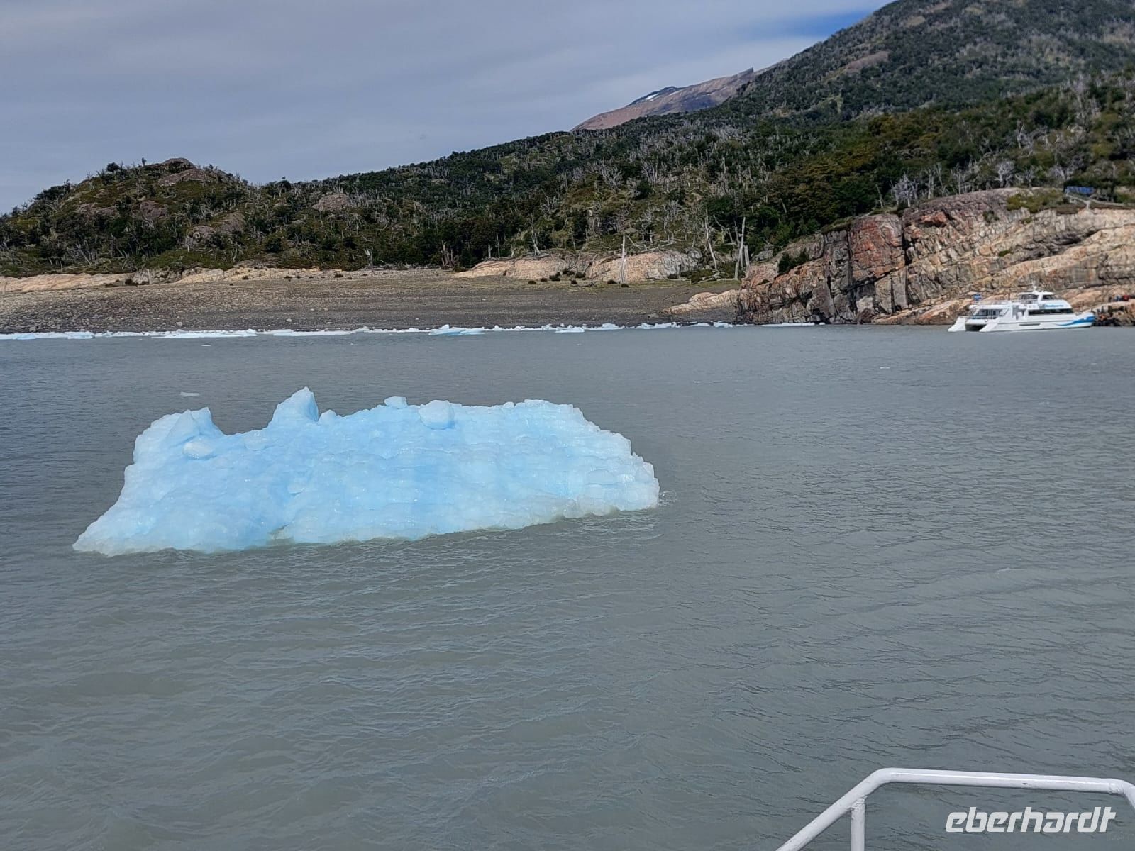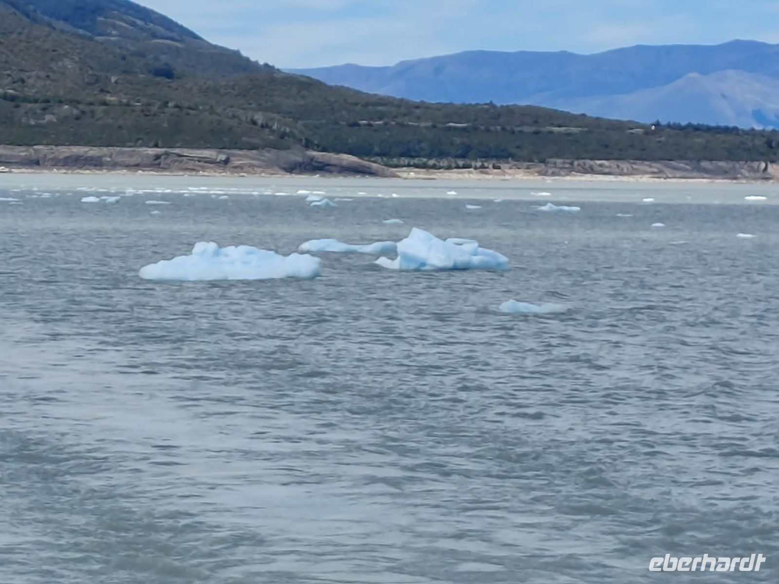 Am Hafen wartet bereits ein Katamaran auf uns. Fleißige Besatzungsmitglieder sind gerade dabei, die Fenster zu putzen. Die Kabine, in der wir Platz nehmen dürfen, ist geräumig, das Schiff ist nicht ausgebucht. An Bord gibt es einige Matrosen und Servicepersonal. Alle sind sehr bemüht und freundlich. Juan ist der Guide, der die Ansagen übernimmt. Kurz nachdem die Fahrt begonnen hat, gibt es Kaffee und einen Snack für alle. Bald kommen kleine Eisberge in Sicht, die uns bereits entzücken, wir wissen ja noch nicht, was uns erwartet. Diese Eisberge sind ein Zeugnis dafür, dass der Uppsala-Gletscher zu den schmelzenden Gletschern gehört.