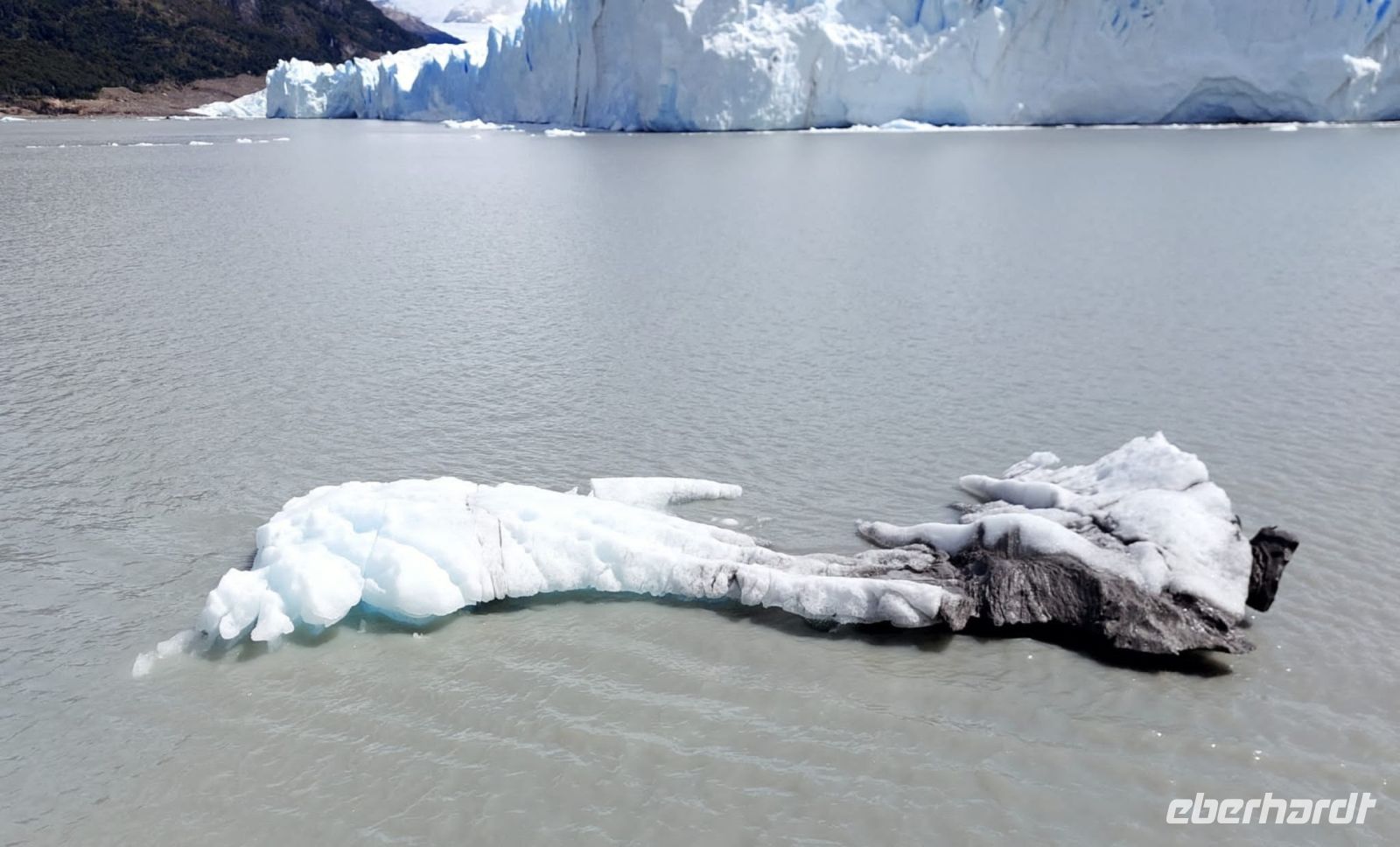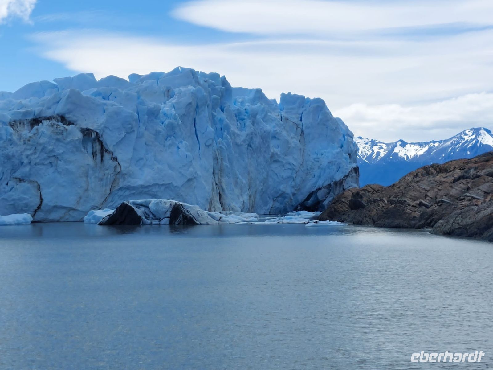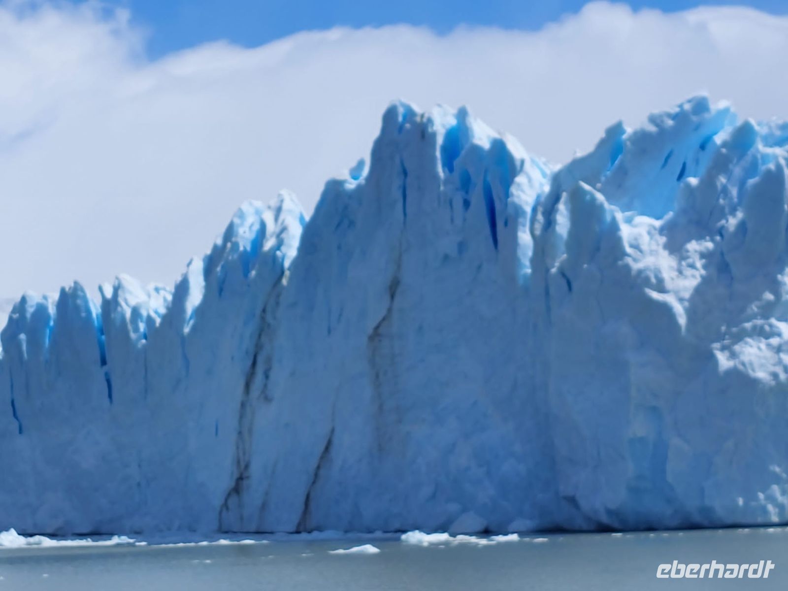 Am Hafen wartet bereits ein Katamaran auf uns. Fleißige Besatzungsmitglieder sind gerade dabei, die Fenster zu putzen. Die Kabine, in der wir Platz nehmen dürfen, ist geräumig, das Schiff ist nicht ausgebucht. An Bord gibt es einige Matrosen und Servicepersonal. Alle sind sehr bemüht und freundlich. Juan ist der Guide, der die Ansagen übernimmt. Kurz nachdem die Fahrt begonnen hat, gibt es Kaffee und einen Snack für alle. Bald kommen kleine Eisberge in Sicht, die uns bereits entzücken, wir wissen ja noch nicht, was uns erwartet. Diese Eisberge sind ein Zeugnis dafür, dass der Uppsala-Gletscher zu den schmelzenden Gletschern gehört.