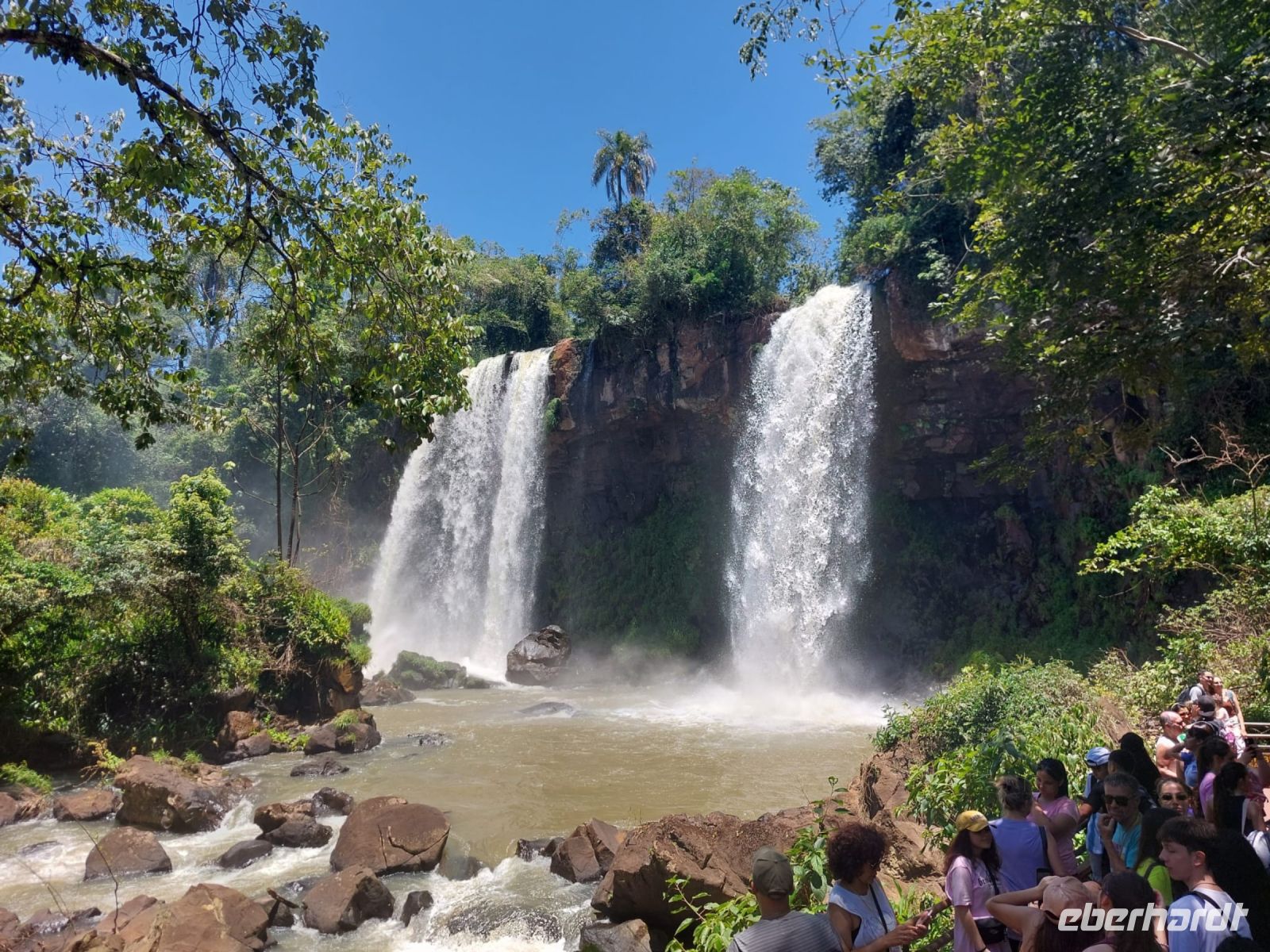 Wir spazieren am Anfang durch ein dschungelartiges Gelände und Max erklärt uns Bäume und Pflanzen. Die ersten Stromschnellen kommen in Sicht und bald auch Wasser, dass sich tosend in den Abgrund ergießt. Auf Brücken und Stegen können wir den atemberaubenden Anblick genießen. Der befestigte Wanderweg ist etwas mehr als einen Kilometer lang und bietet tolle Fotomotive. Am späten Mittag verlassen wir die Fälle und fahren zum Hotel Jardin de Iguazu. Den Nachmittag nutzen wir zum Ausruhen am kleinen Pool und so mancher macht auch ein Mittagsschläfchen.