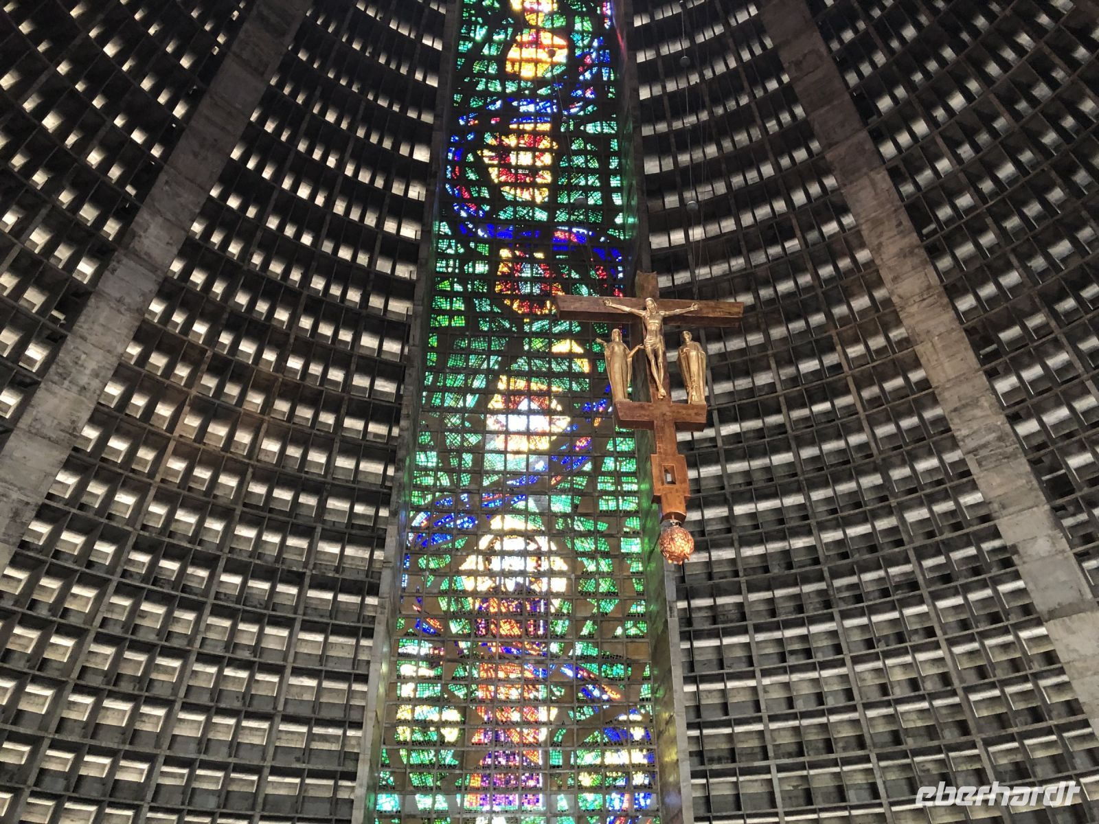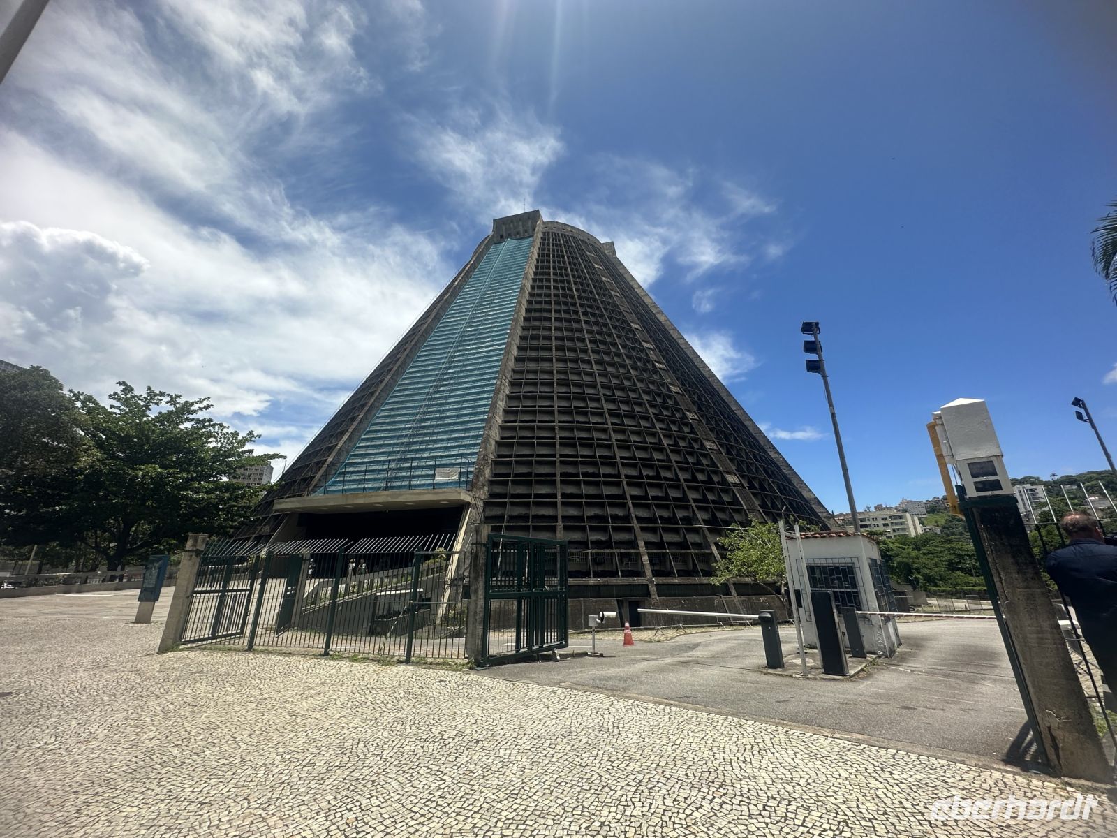 Weiter geht es für uns zur Kathedrale Metropolitana de Sao Sebastiao, benannt nach dem heiligen Sebastian, dem Schutzpatron von Rio de Janeiro. Das pyramidenförmige Gebäude hat eine imposante Größe von 75 Metern und bietet vielen Gläubigen Platz: es gibt 5.000 Sitzplätze und 20.000 Stehplätze. Bewundernswert sind die vierundsechzig Meter hohen Kirchenfenster, die in rot, grün, gelb und blau leuchten.