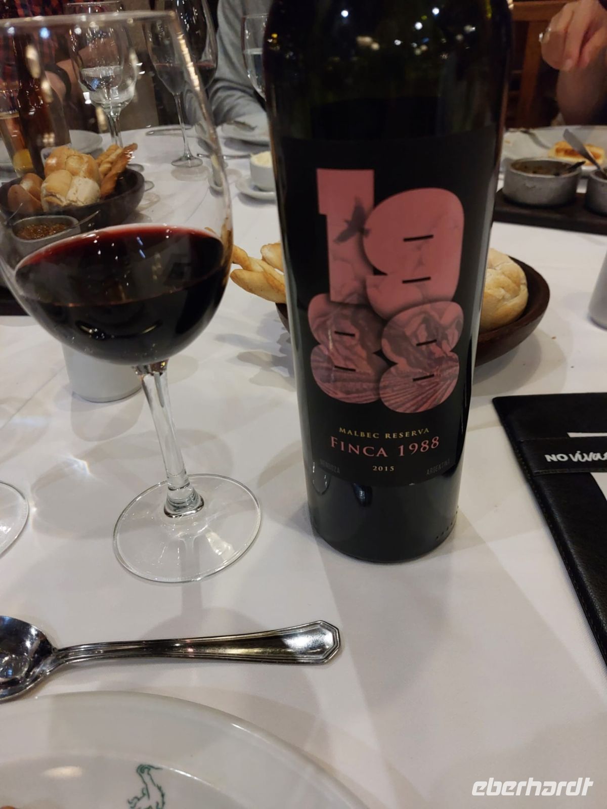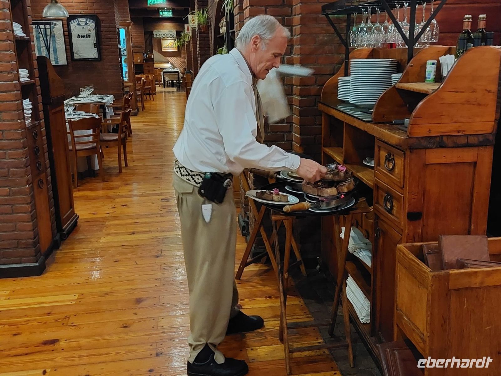 Das Restaurant Estillo Campo, wo wir zu Abend essen, ist nichts für Vegetarier. Über einem großen runden offenen Grill hängen saftige Lammspieße, die uns bald serviert werden. Ein köstlicher Rotwein der Sorte Malbec Reserva 1988 rundet das Mahl geschmacklich ab. Das Ambiente ist locker und ungezwungen und obwohl das Restaurant gut besucht ist, müssen wir nicht lange auf unser schmackhaftes Essen warten. Für den ersten Hunger stehen frische Brötchen und Knusperstangen sowie leckere Dips bereits auf dem Tisch. Dann gibt es einen gebackenen Käse und Blutwurst. Für den Hauptgang haben alle Steak bestellt, das hervorragend zubereitet und in gewaltigen Stücken serviert wird.