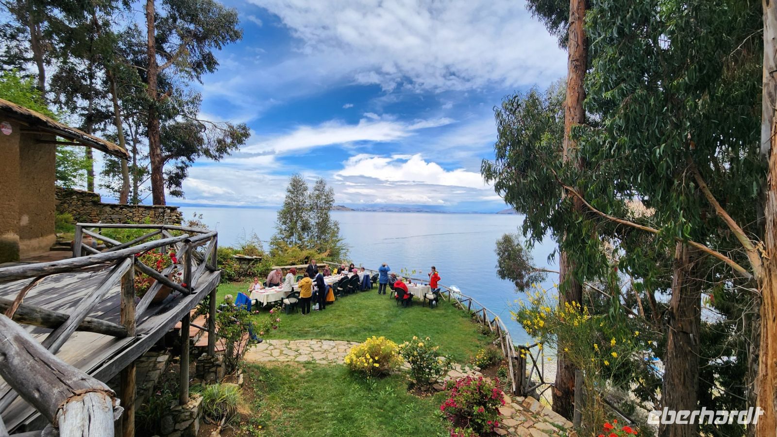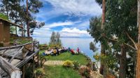 Auf der Sonneninsel sind wir Gast in einem Restaurant, welches eine einmalig schön gelegene Terrasse hat. An einer langen Tafel sitzen wir und genießen bei Sonnenschein den Blick auf den Titicacasee.