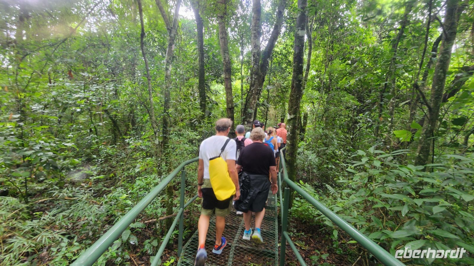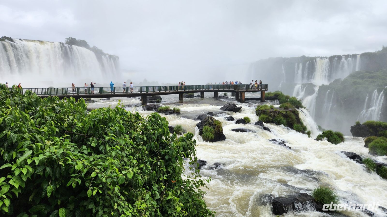 Noch einmal sind die Iguazu-Wasserfälle unser Ziel. Heute haben wir einen ganz anderen Blickwinkel. Wir schauen direkt auf die Wasserfälle und laufen die gesamte Länge über Laufstege ab, haben auf Plattformen immer wieder die Möglichkeit, tolle Fotos zur Erinnerung zu machen. An einer Stelle führt solch ein Steg sozusagen mitten in die Wasserfälle hinein. Man ist im Halbkreis umringt von dem tobenen Wasser, durch die Gicht wird man ziemlich nass, aber es ist sehr warm, daher ist das überhaupt nicht schlimm.