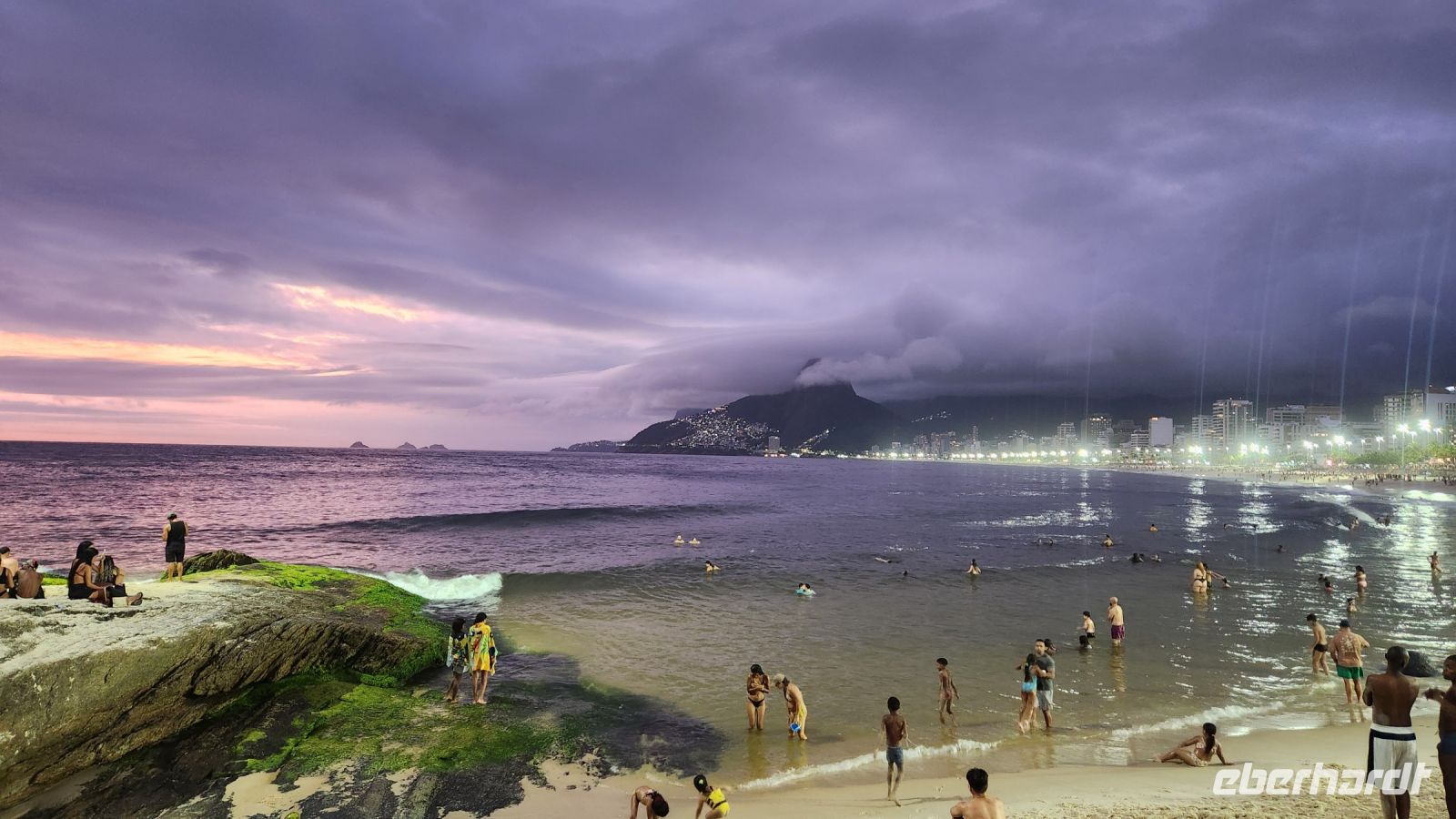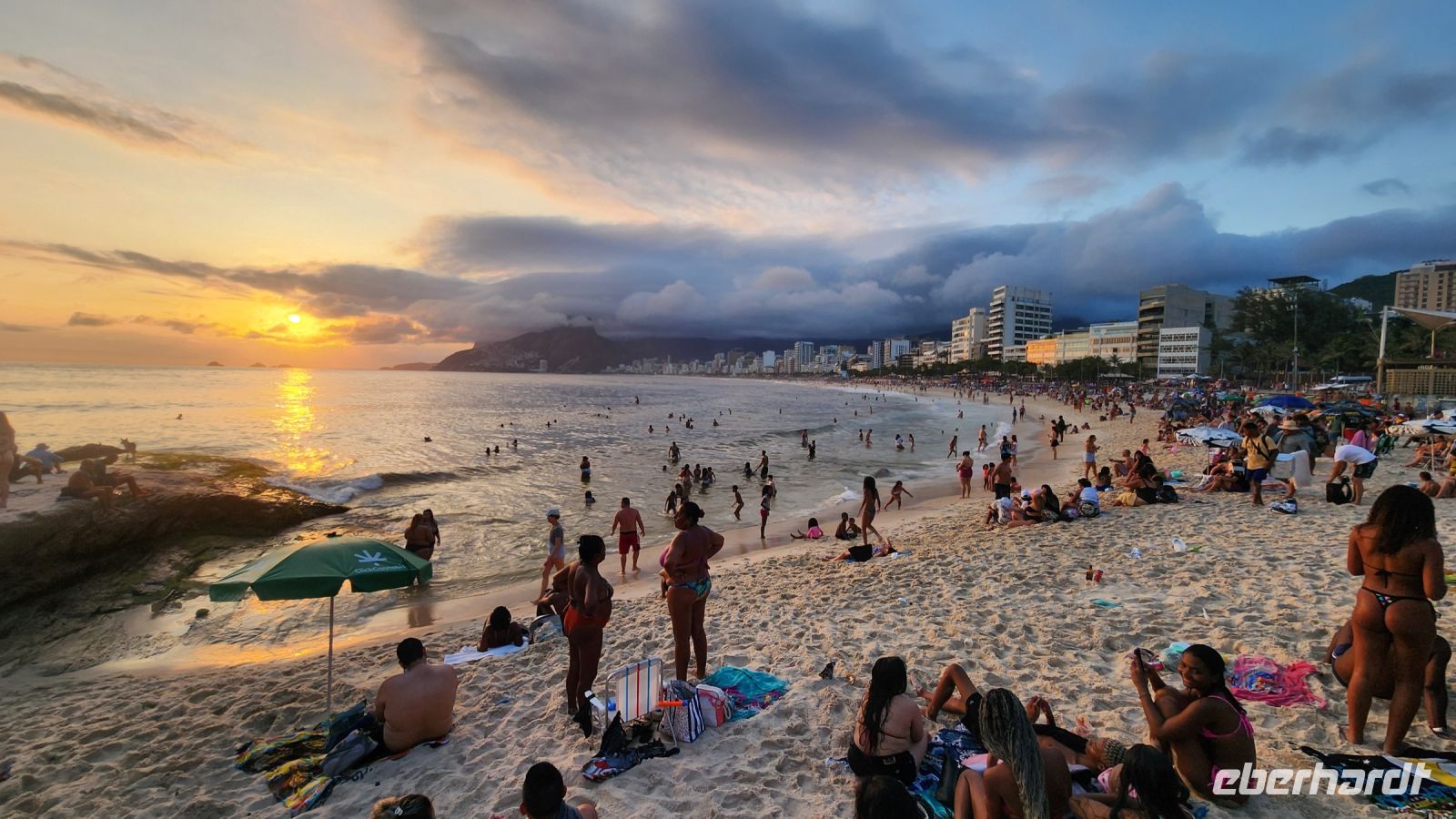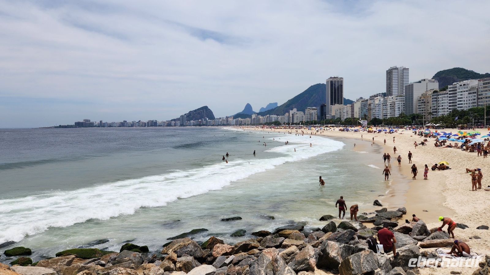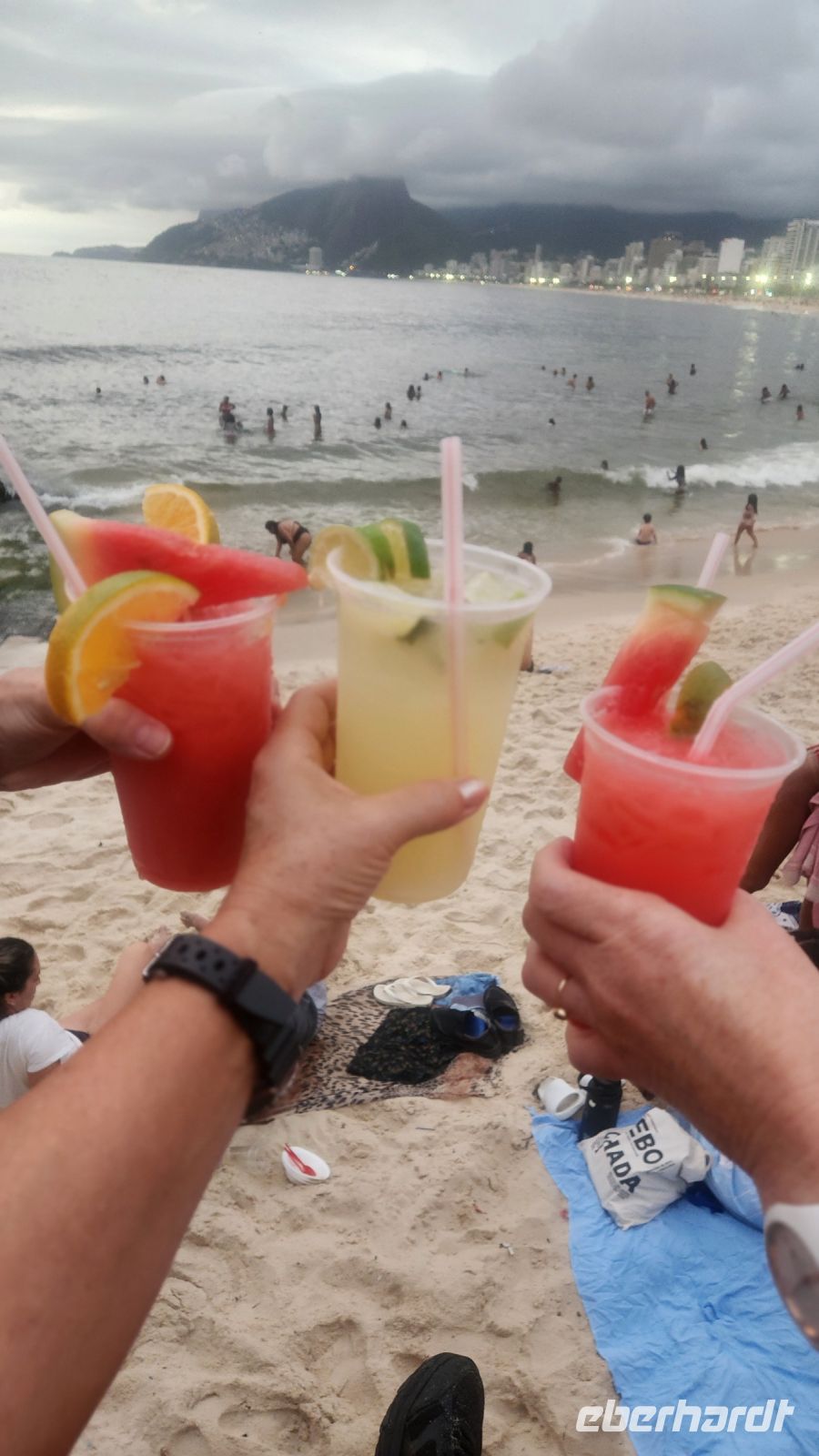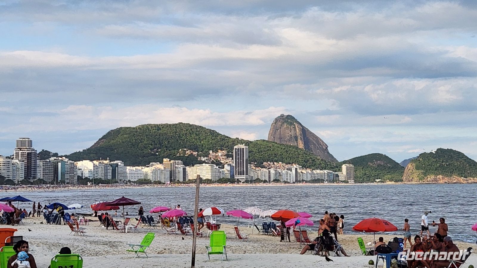 Am Nachmittag haben wir Freizeit. Die meisten genießen das Treiben an der Copacabana, unser Hotel liegt direkt an diesem weltberühmten Strand. Überall ist Musik zu hören, viele Strandbuden bieten Snacks, Cocktails und Live-Musik an, auch die Einheimischen genießen ihren Sonntag am Strand, Starßenverkäufer verkaufen jede Art von Souvenirs.
