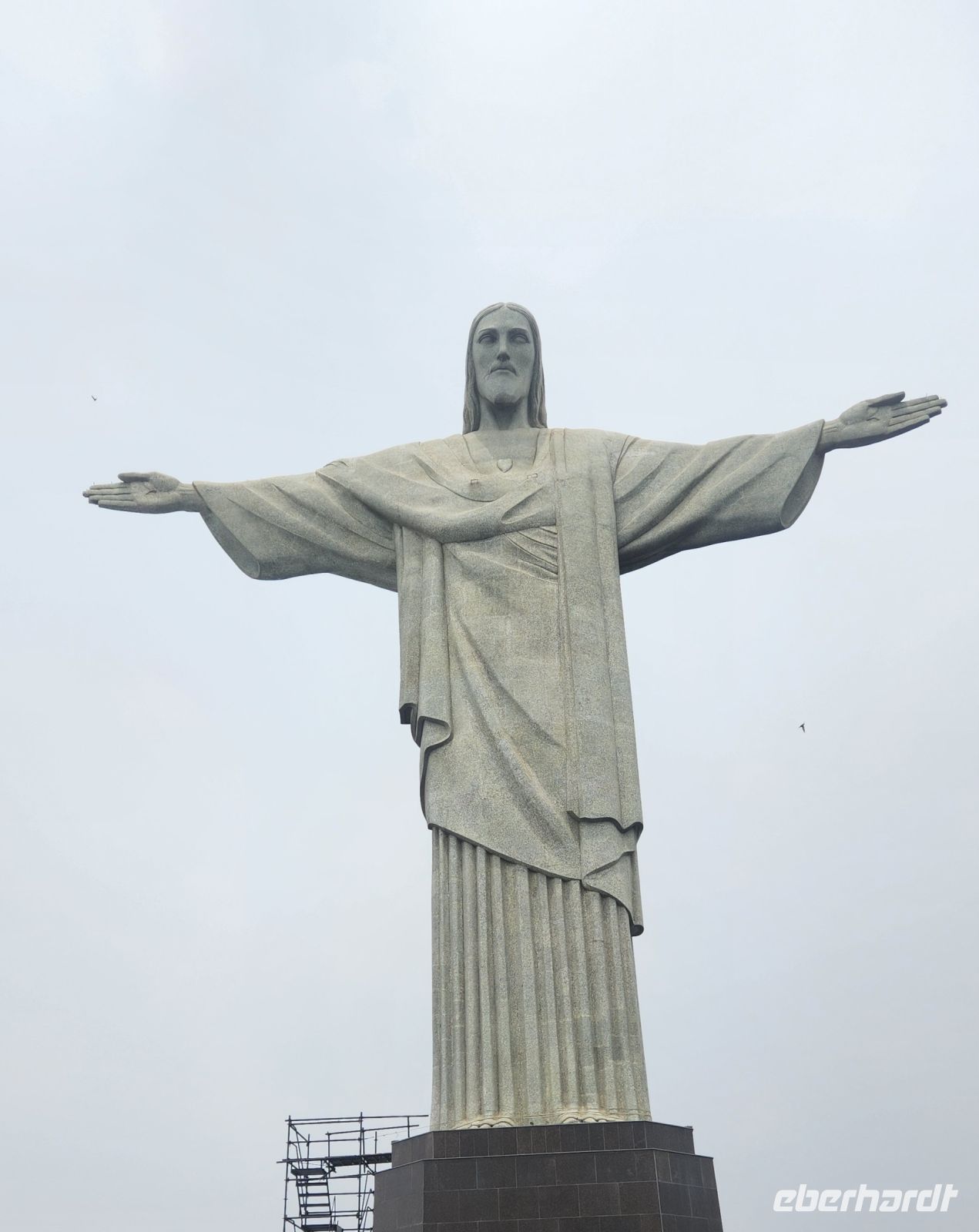 Dann sind es noch einige Stufen und 2 lange Rolltreppen, die hier irgendwie so gar nicht hinpassen, und dann stehen wir vor ihr !!! Die riesige Christus-Statue. Sie wacht hier oben über ganz Rio de Janeiro, eine sehr besondere Ausstrahlung geht von ihr aus. Sie ist an diesem Tage in eine Wolke gehüllt, aber erscheint immer wieder für uns. Einen Blick über die ganze Stadt haben wir heute nicht von hier oben, aber das stört uns in diesem Moment überhaupt nicht, die Christus-Statue zieht uns komplett in ihren Bann.