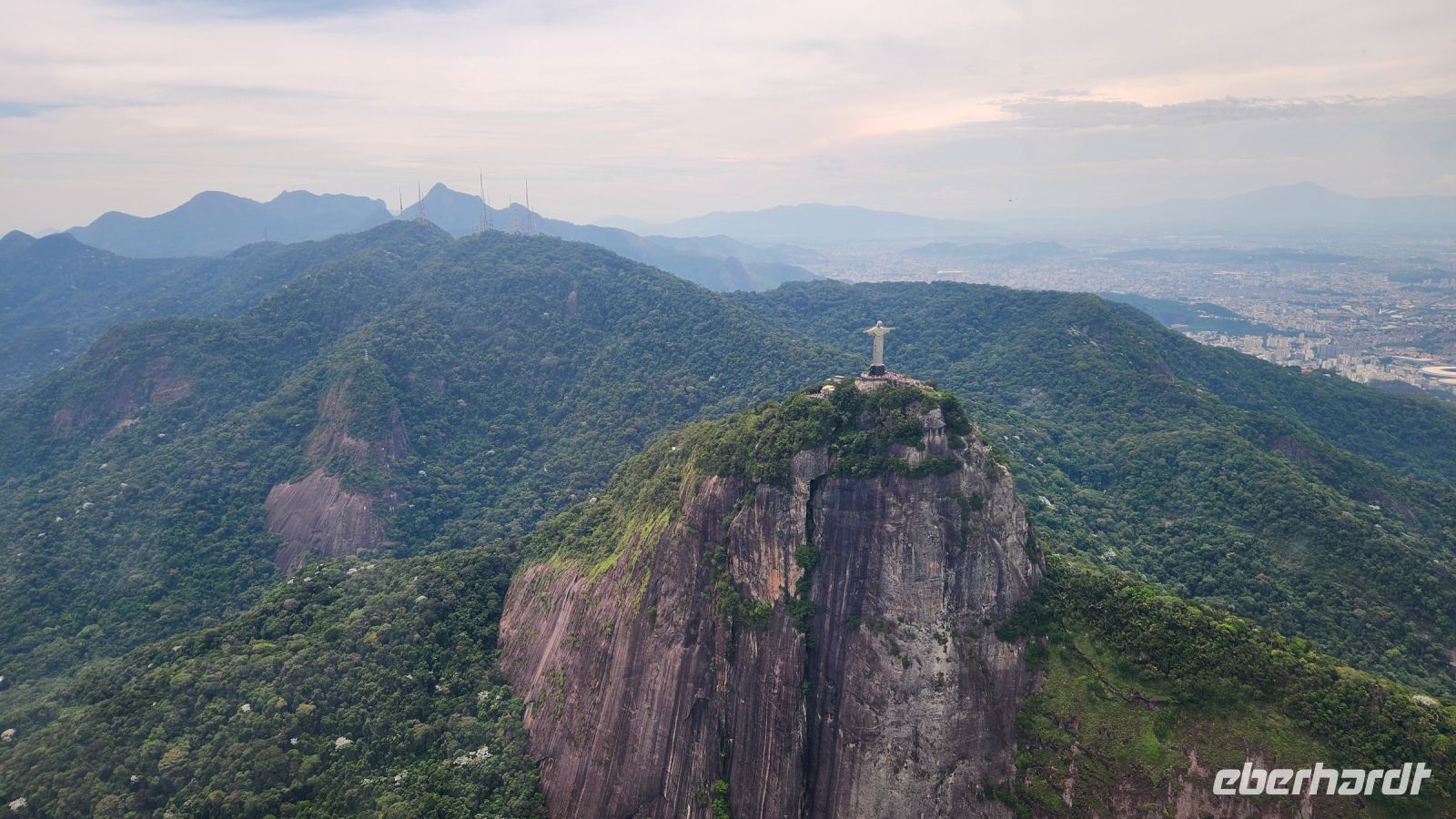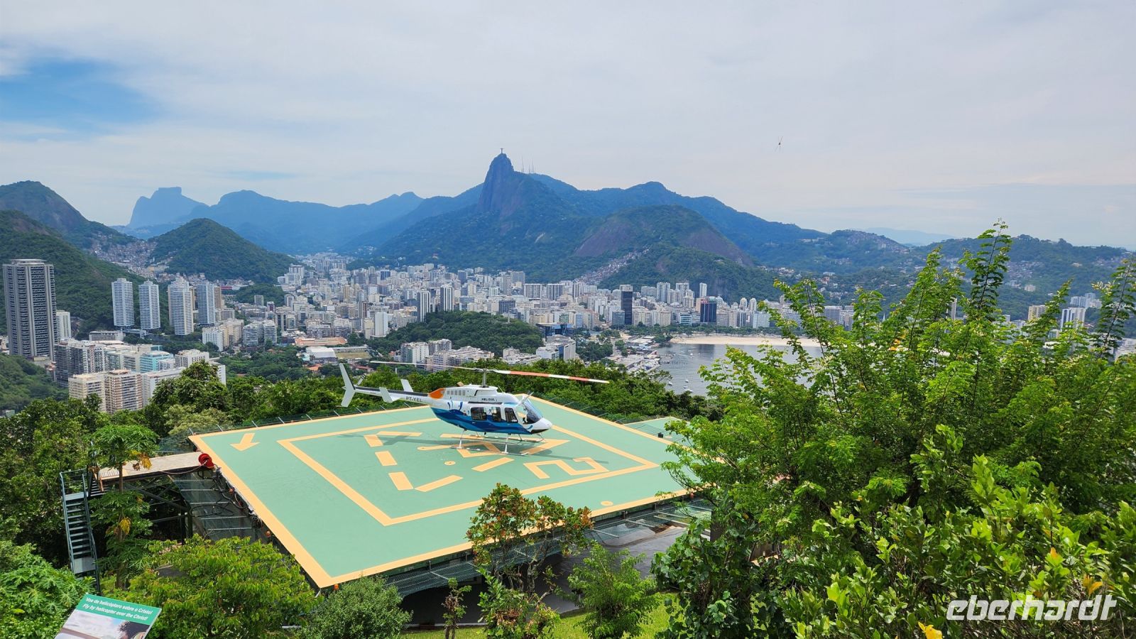 Einige Gäste entscheiden sich spontan für einen Helicopter-Flug, der Hubschrauber startet direkt von dort oben. Sie fliegen entlang der Copacabana und umkreisen zweimal die Christus-Statue!