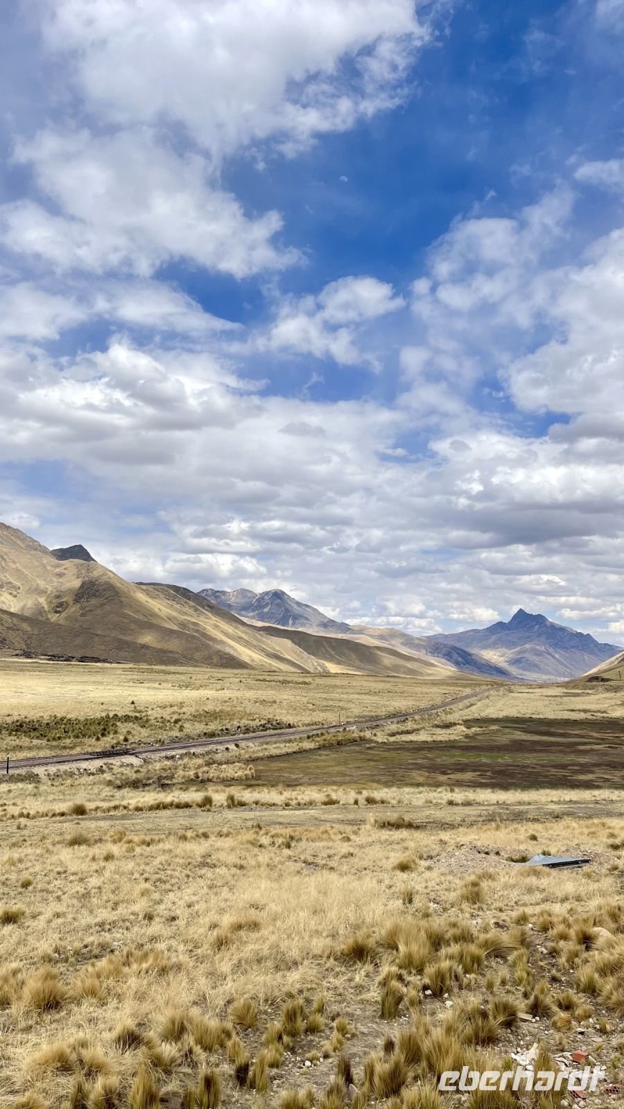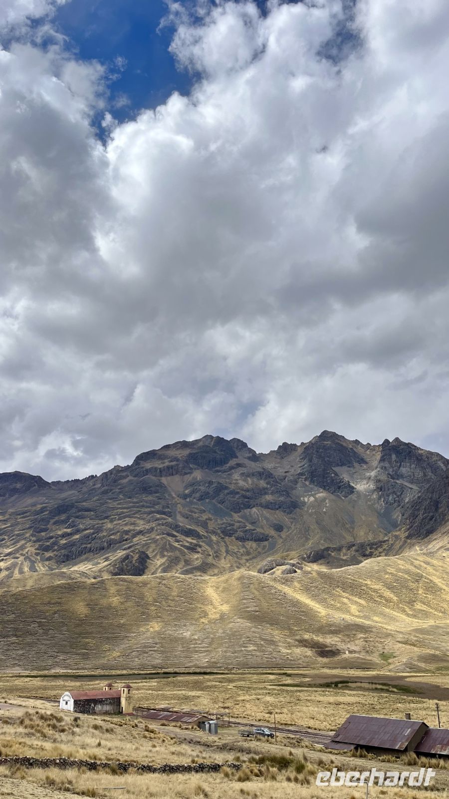 Auf dem höchsten Punkt zwischen den Bergen erreichten wir die nicht unbeträchtliche Höhe von 4.354 Metern über dem Meeresspiegel. Dort ist die Aussicht atemberaubend. In der Nähe und in der Ferne sind Berge zu sehen, einige mit schneebedeckten Gipfeln, und zu deren Füßen fast vegetationslose Ebenen. Hier und da haben wir einige Alpakas beobachtet, die unsere Aufmerksamkeit erregten. Und als zusätzliche Attraktion lagen die Eisenbahnlinien nicht weit von unserem Weg entfernt, ebenso wie ein kleiner Fluss.