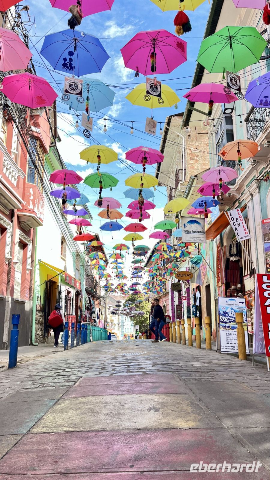 Wieder einmal lauerte das Abenteuer, und wir waren bereit, es bei den Hörnern zu packen. Der erste Halt war ein Zugang zum verzweigten Seilbahnnetz der Stadt, das übrigens von hervorragender Qualität ist. Von hier bis dort sahen wir alles oder fast alles, immer aus der Vogelperspektive. Wir staunten über die erstaunlichen „Cholets“, die mit ihrer Originalität und lokalen Exzentrik viel Aufmerksamkeit auf sich ziehen, oder über die dichte Bebauung in Tälern, an Hängen und Bergen. Anschließend begaben wir uns ins Tal des Mondes, das uns aufgrund der dortigen Sonneneinstrahlung an eine eventuelle Annäherung an die Sonne erinnerte. Später spazierten wir durch die Altstadt und über den Hexenmarkt, dessen Produkte wir so unterschiedlich und manchmal auch verrückt fanden, da sie fast jenseits allen Verständnisses sind... das macht es so toll.