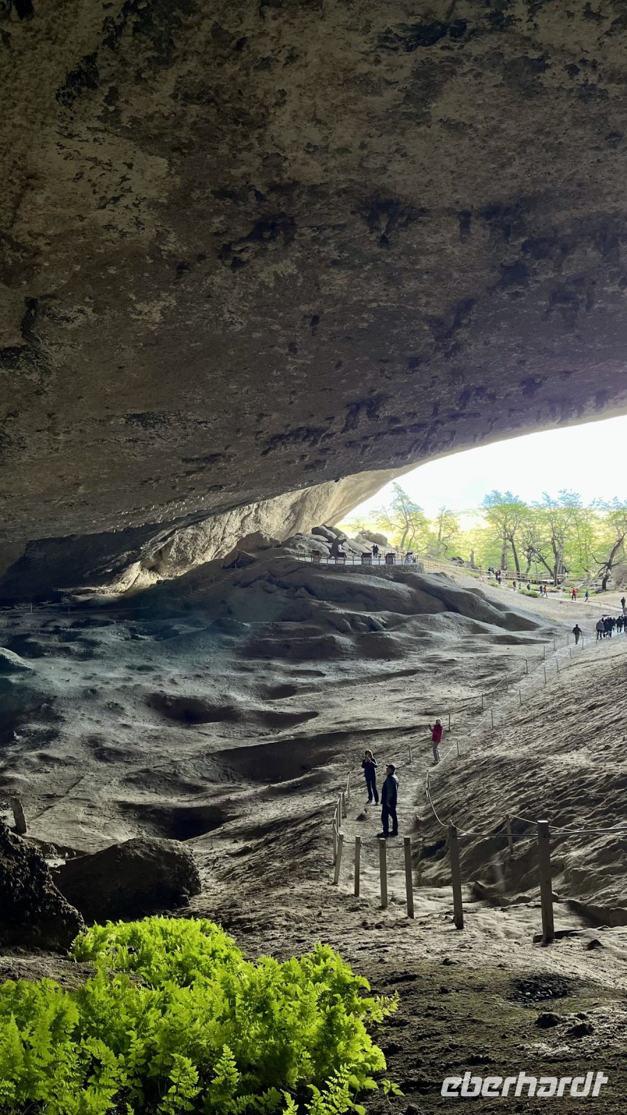 Die Straße mit den Bergen in der Ferne und das sporadische Auftauchen eines Kondors am Himmel erweckte stets unsere Aufmerksamkeit, was auf der anderen Seite der Fenster geschah. Kurz darauf hielten wir an der tausendjährigen Höhle des Milodon inne. Ein gewaltiger Eingang, ein riesiges Gewölbe, unter dem man einen kleinen Abstecher an einen Ort mit fast mondähnlichem Aussehen machen kann.