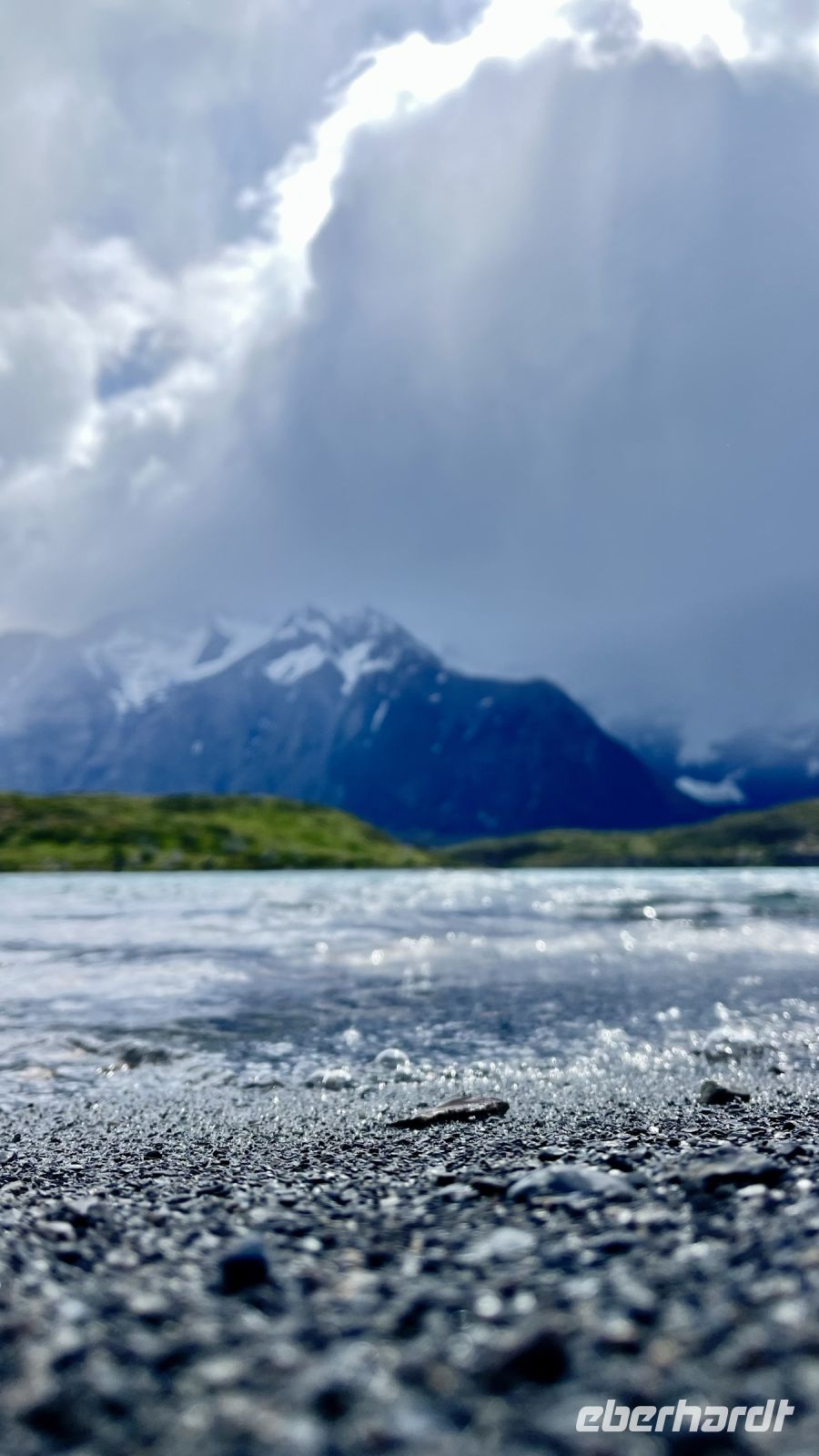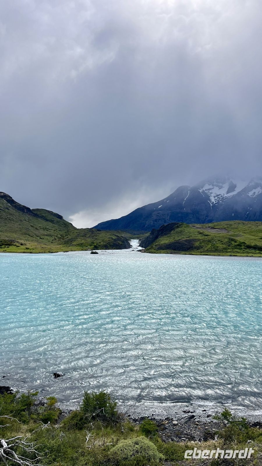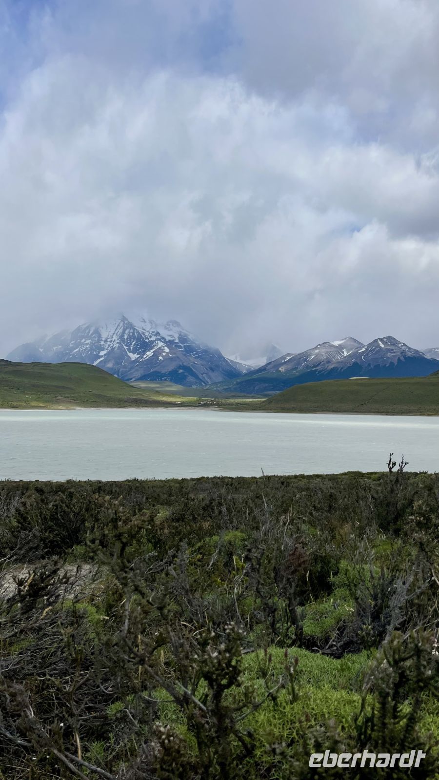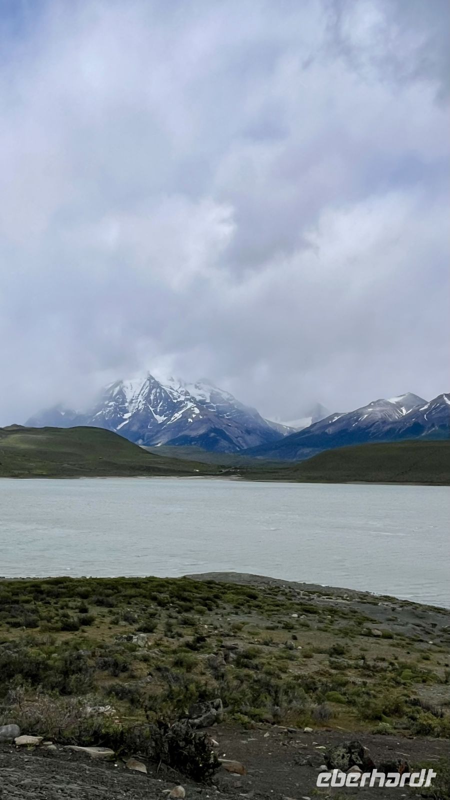 Es folgte eine Reihe von Landschaften, von denen jede einzelne eines Aquarells würdig war, bevor wir zu dem Bild gelangten, was zu einem Meisterwerk werden sollte: dem Nationalpark Torres del Paine. Dort fanden wir Flüsse, Seen, Wasserfälle und Berge von großer Schönheit, so schön, wie der Wind stark und die Brise frisch waren. Und als ob das alles noch nicht genug wäre, bot sich uns am Aussichtspunkt Los Cuernos ein Postkartenblick.