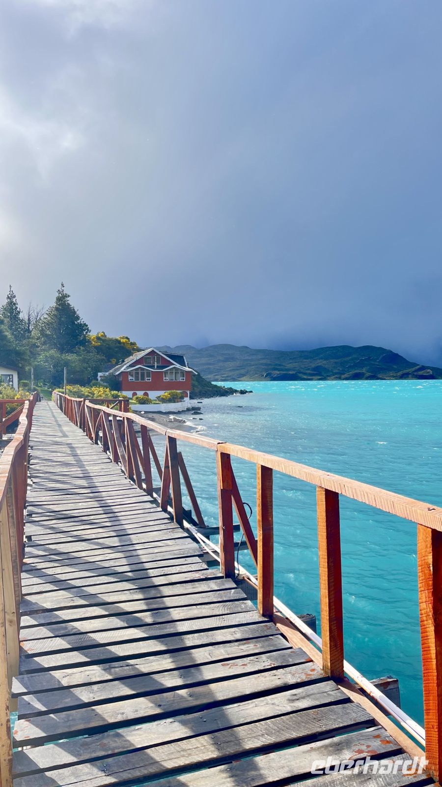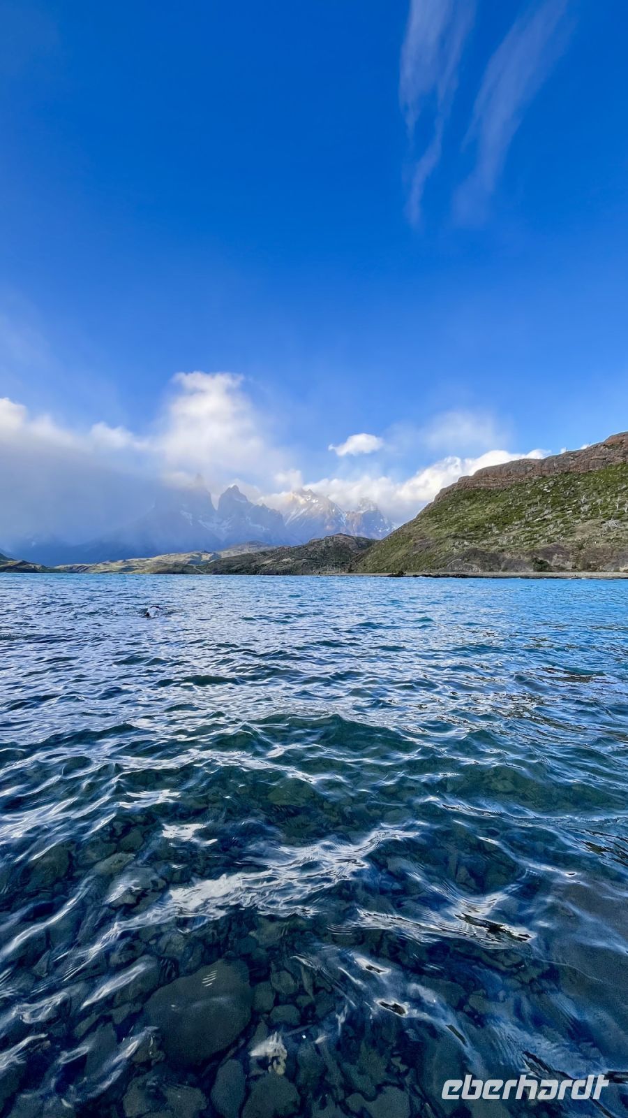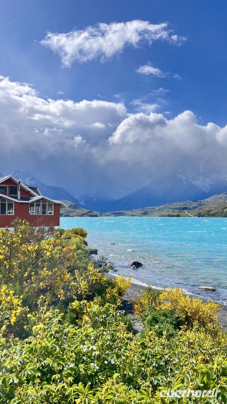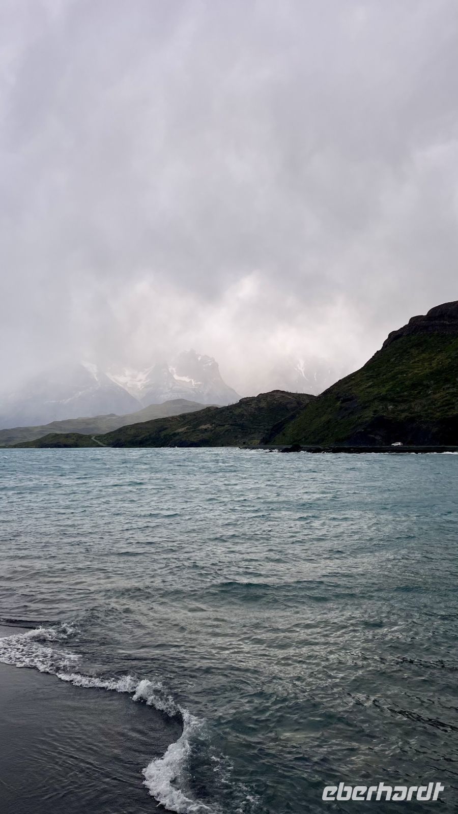 Wie kalt ist das Wasser im Pehoe-See? Sehr kalt, kann ich Ihnen sagen! Aber der Kamin in der Lounge knisterte fröhlich und erwärmte die Innentemperatur so sehr, dass es sehr angenehm war. Wir lebten immer noch in diesem Traum, die Landschaft war eine totale visuelle Begeisterung inmitten der vorherrschenden Stille, vor unseren Augen. Sie lud uns ein, vielleicht noch ein wenig zu bleiben, aber wir mussten weiter.