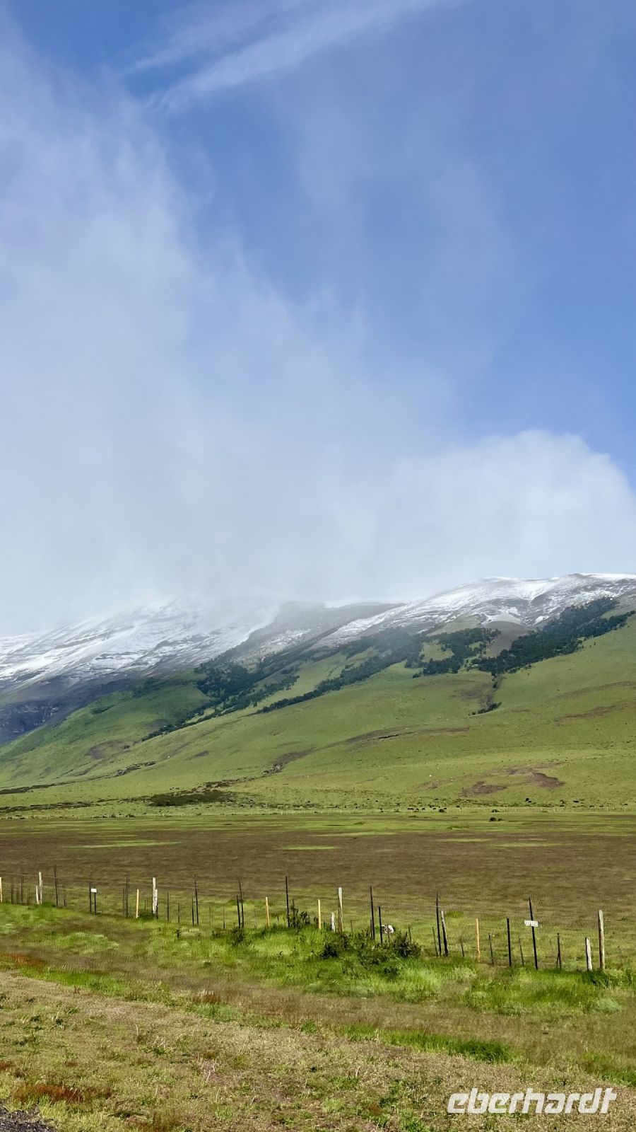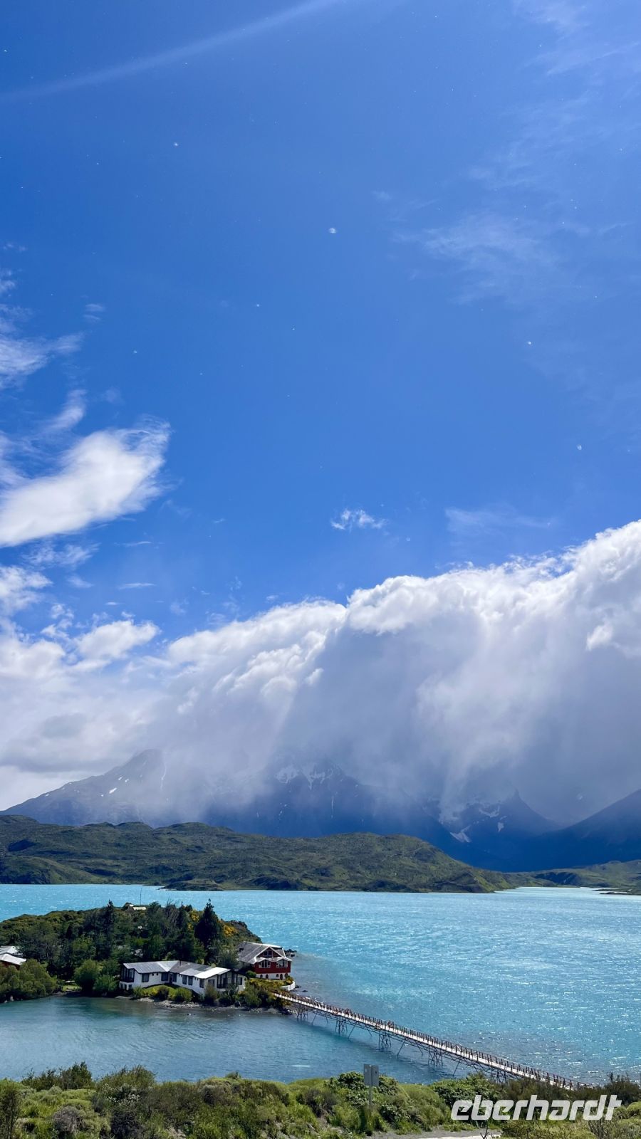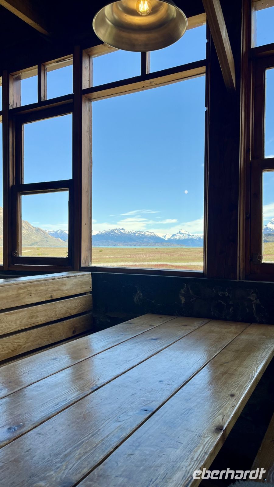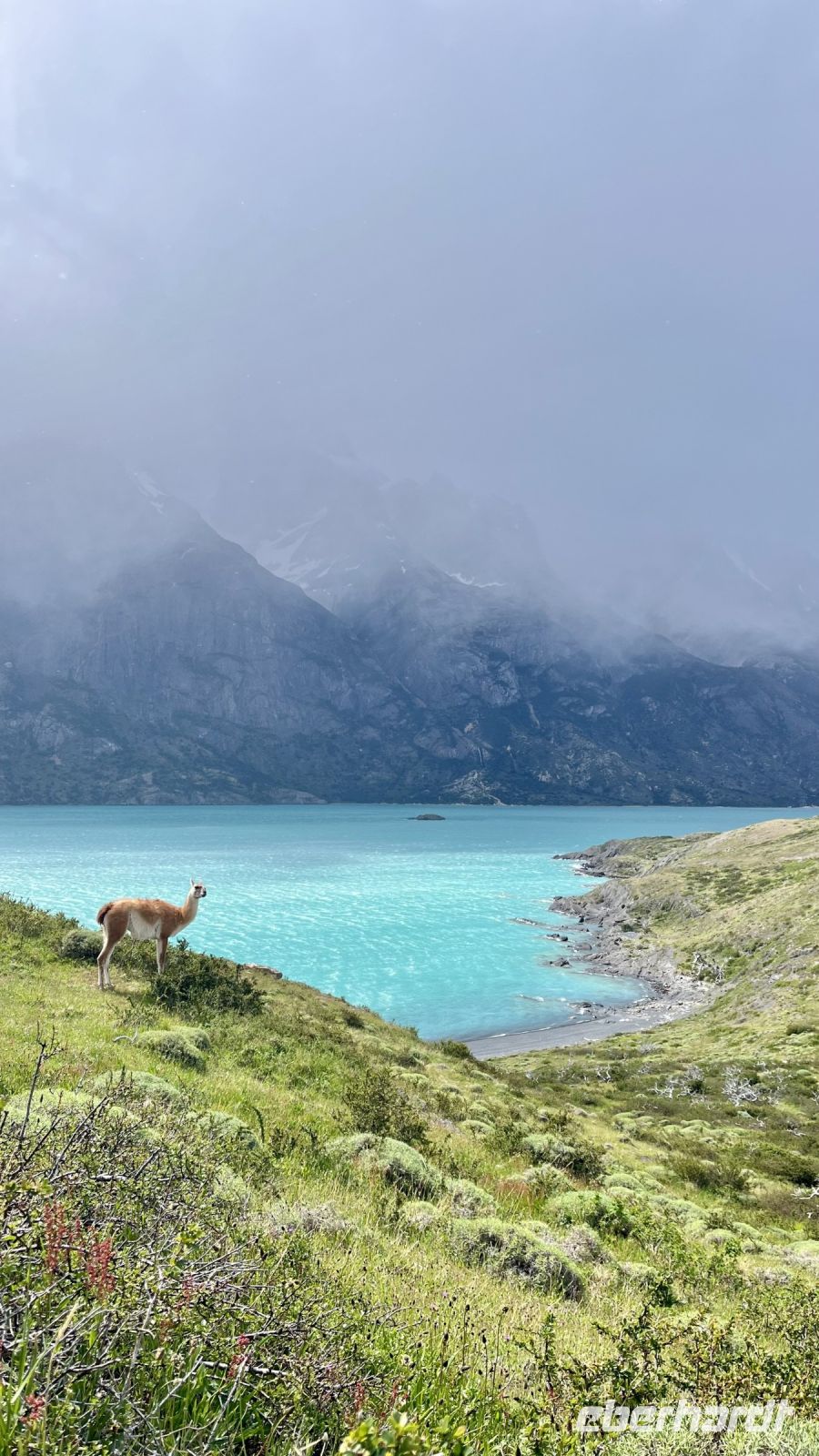 Wie kalt ist das Wasser im Pehoe-See? Sehr kalt, kann ich Ihnen sagen! Aber der Kamin in der Lounge knisterte fröhlich und erwärmte die Innentemperatur so sehr, dass es sehr angenehm war. Wir lebten immer noch in diesem Traum, die Landschaft war eine totale visuelle Begeisterung inmitten der vorherrschenden Stille, vor unseren Augen. Sie lud uns ein, vielleicht noch ein wenig zu bleiben, aber wir mussten weiter.