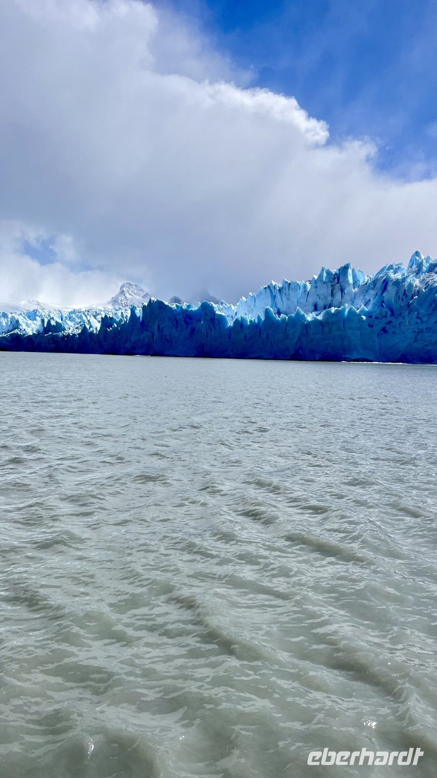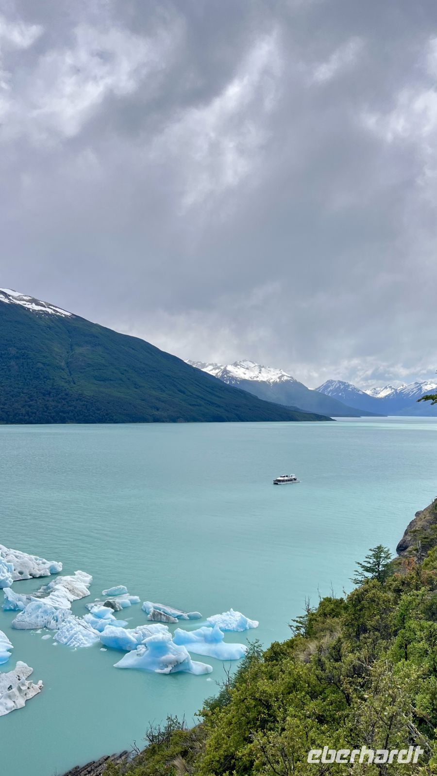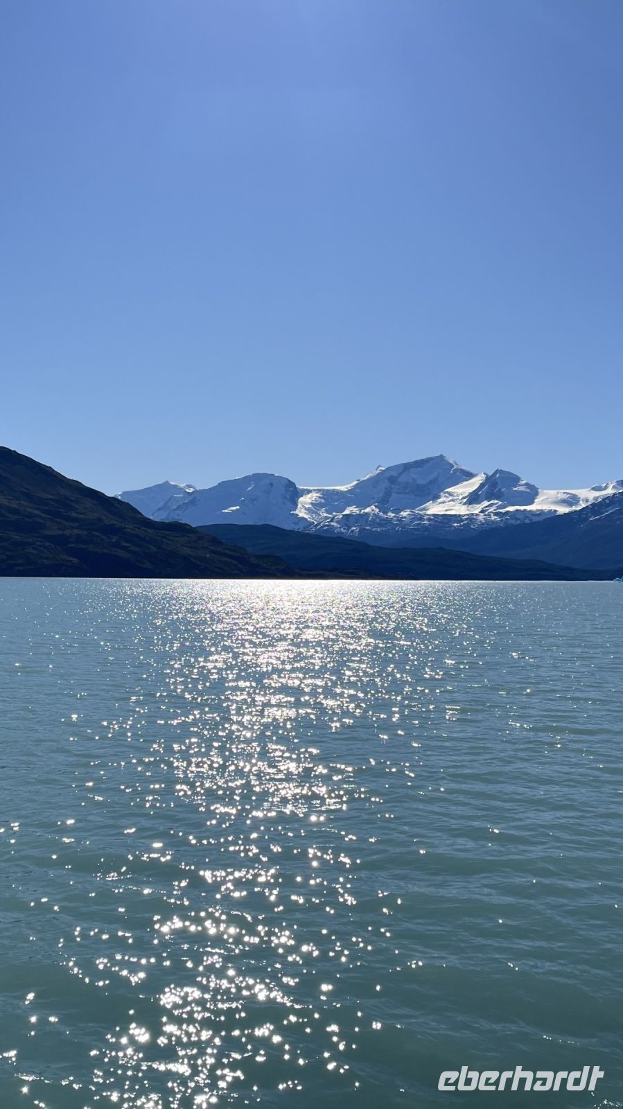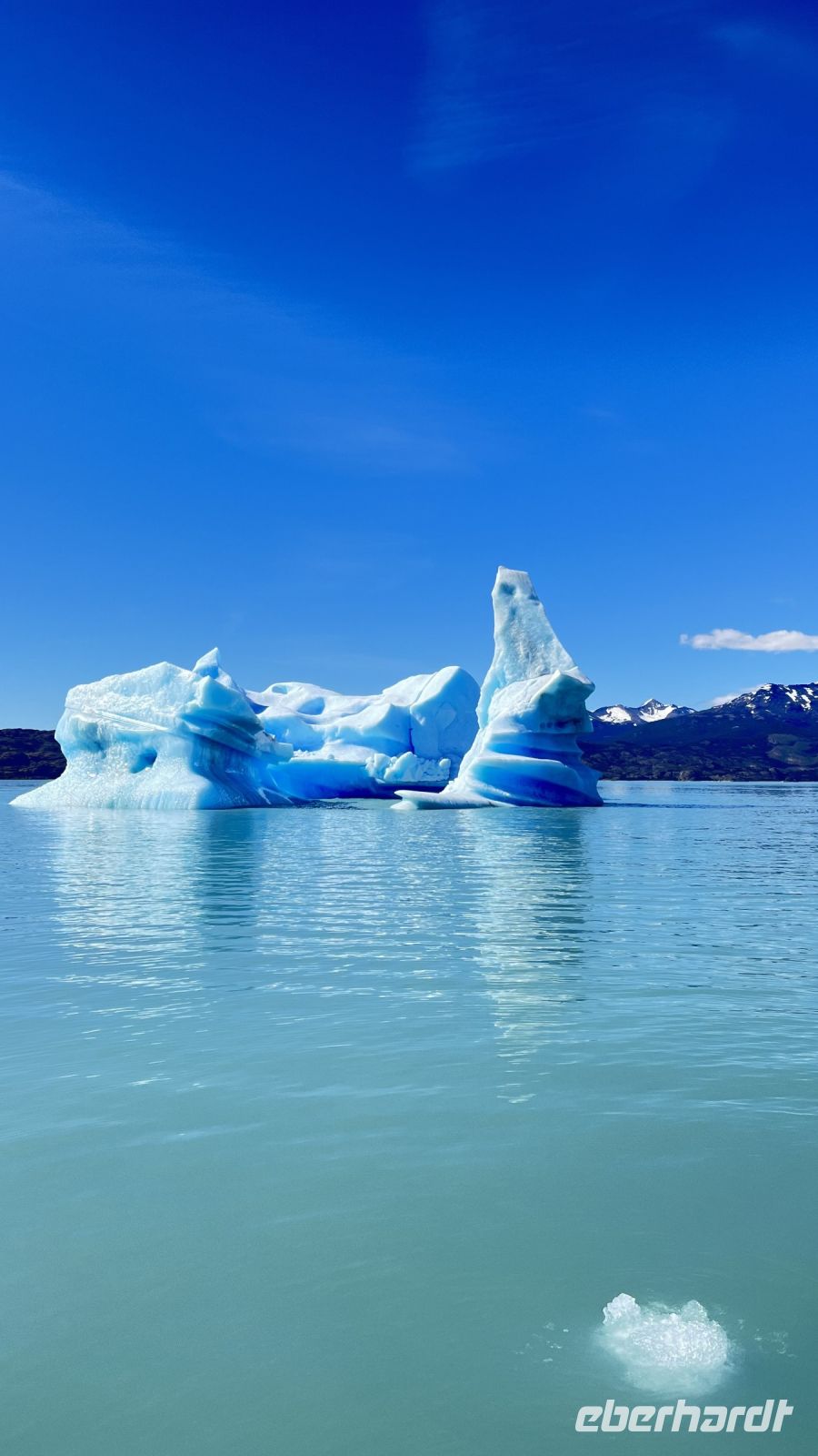 Der Kontrast zwischen der Farbe des Wassers und der Berge mit dem tiefen Blau dieser großen Eisblöcke, die langsam mit der Strömung nach unten treiben, ist schon ein Erlebnis für sich. Auf dem Deck des Bootes erinnerte uns die kalte Brise an unsere Nähe zum Gletscher und unsere südliche Lage.