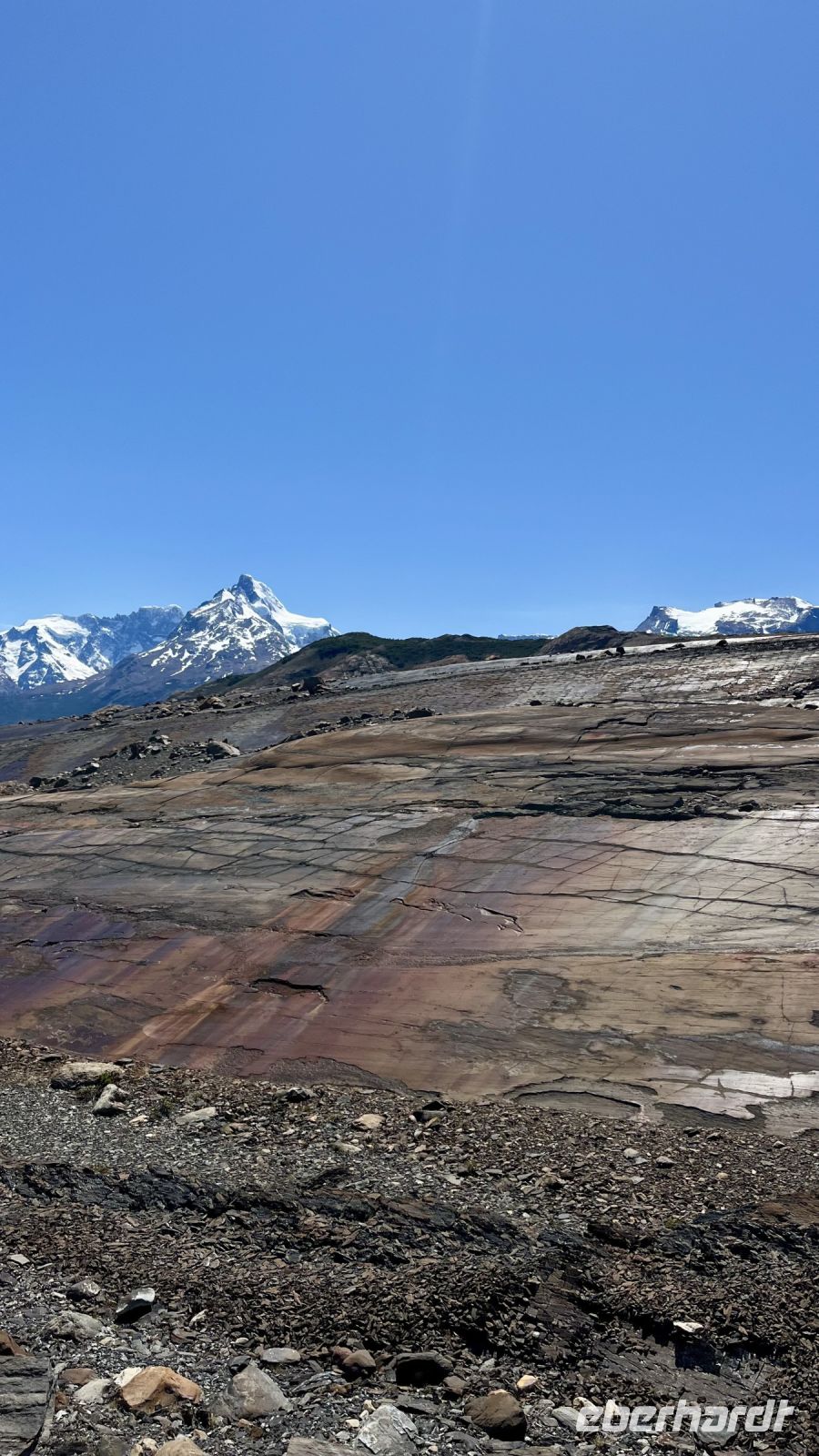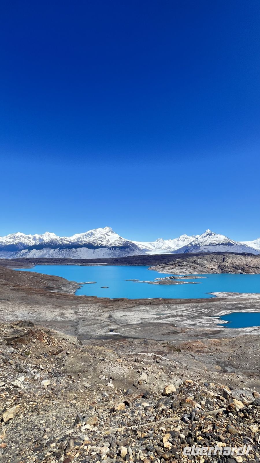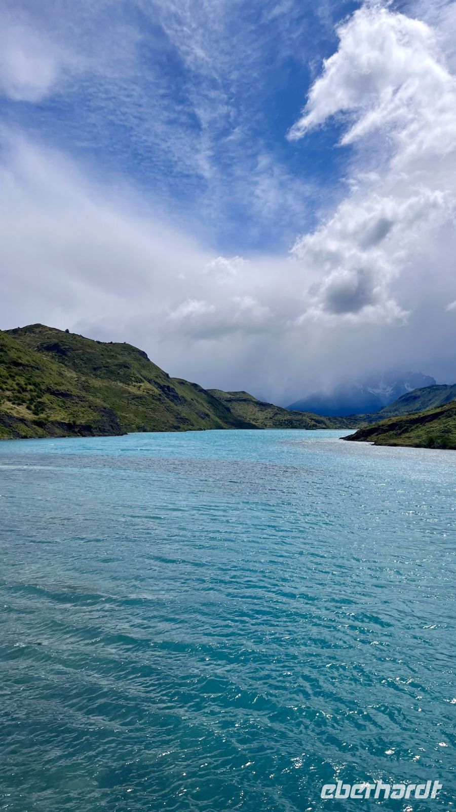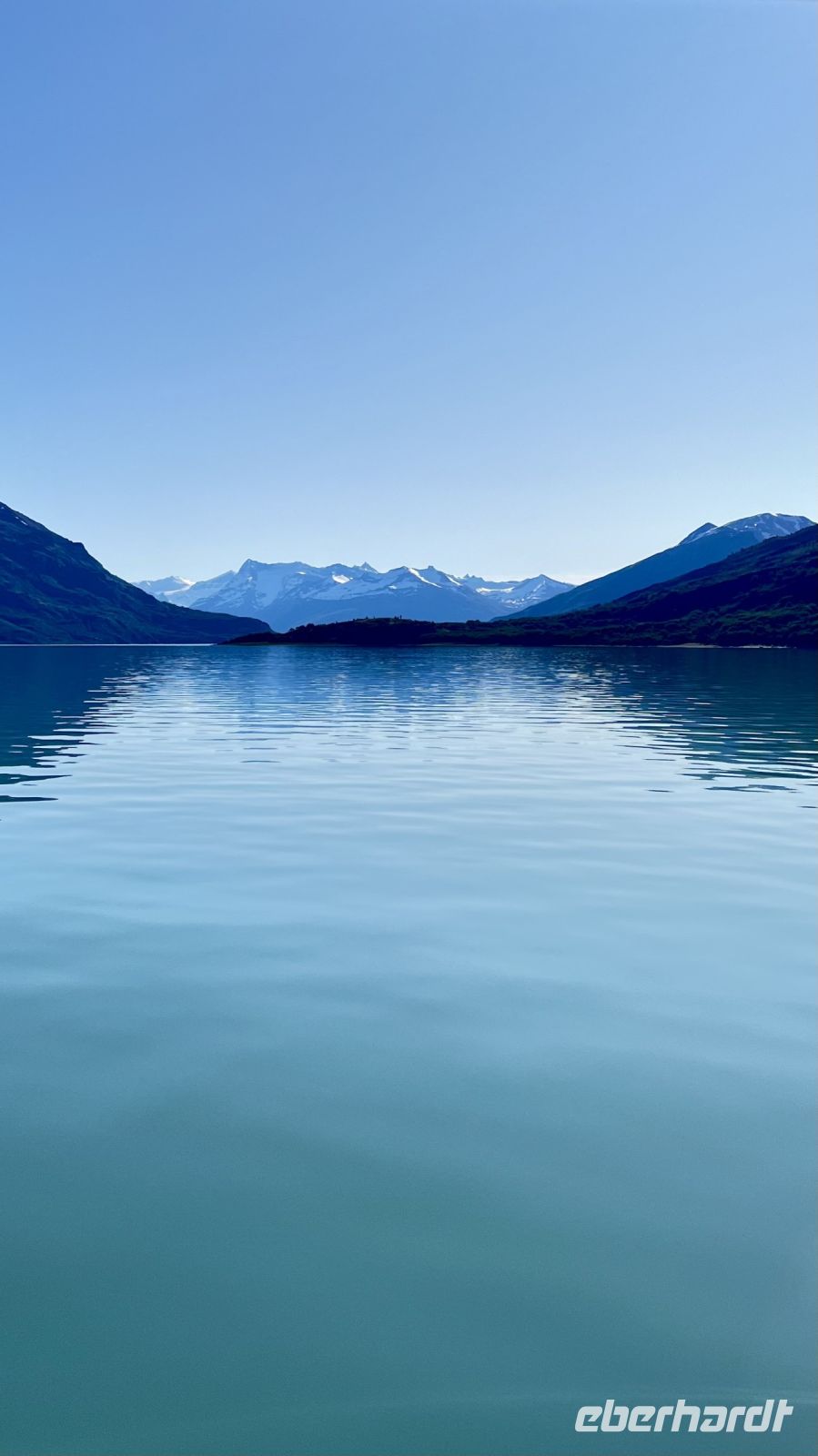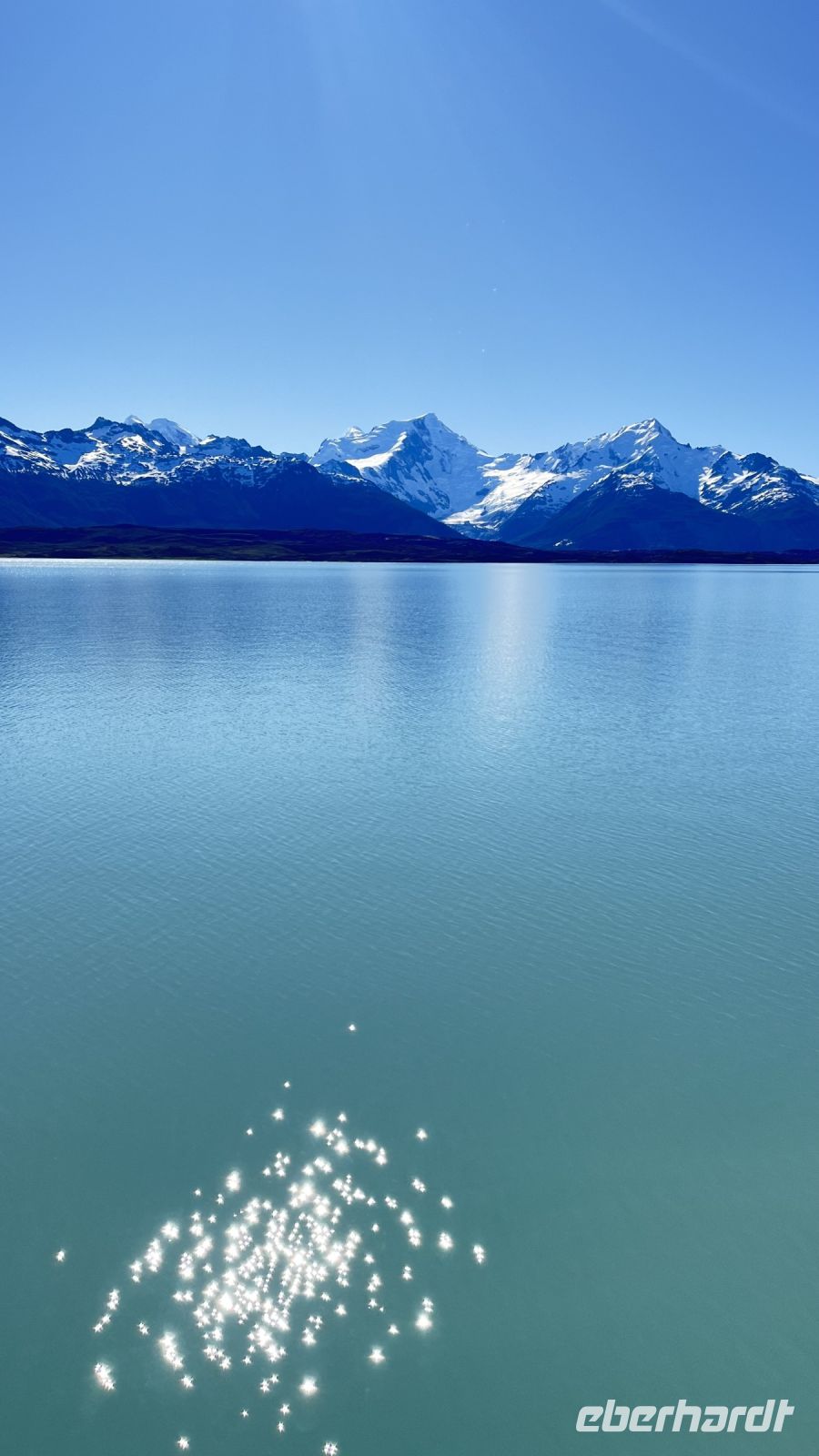 Der Kontrast zwischen der Farbe des Wassers und der Berge mit dem tiefen Blau dieser großen Eisblöcke, die langsam mit der Strömung nach unten treiben, ist schon ein Erlebnis für sich. Auf dem Deck des Bootes erinnerte uns die kalte Brise an unsere Nähe zum Gletscher und unsere südliche Lage.