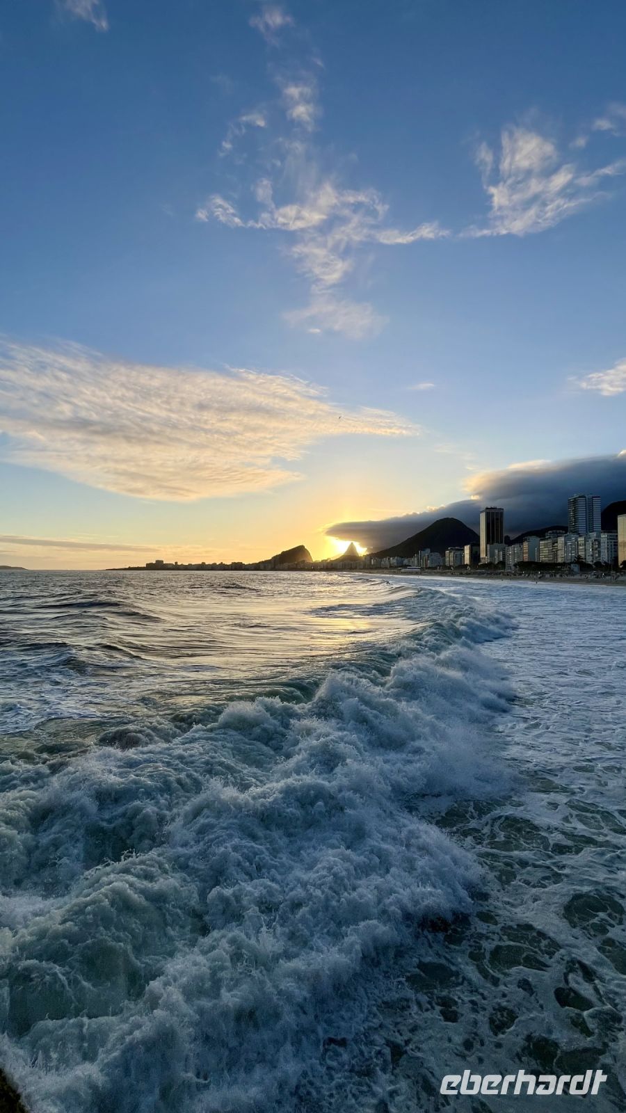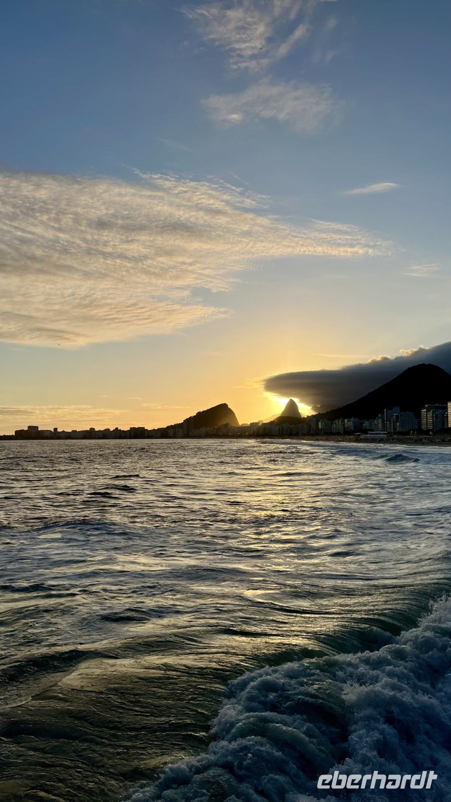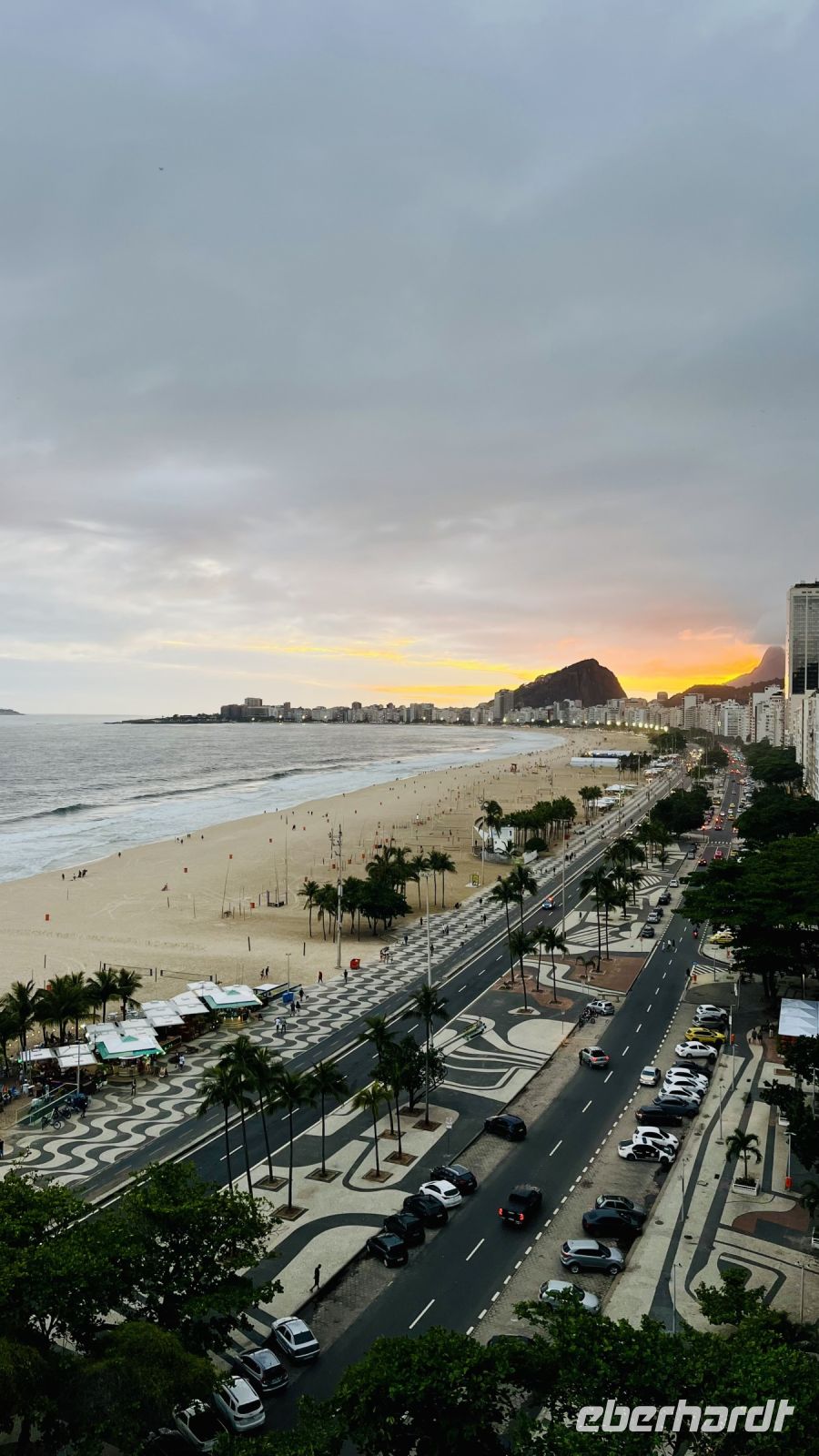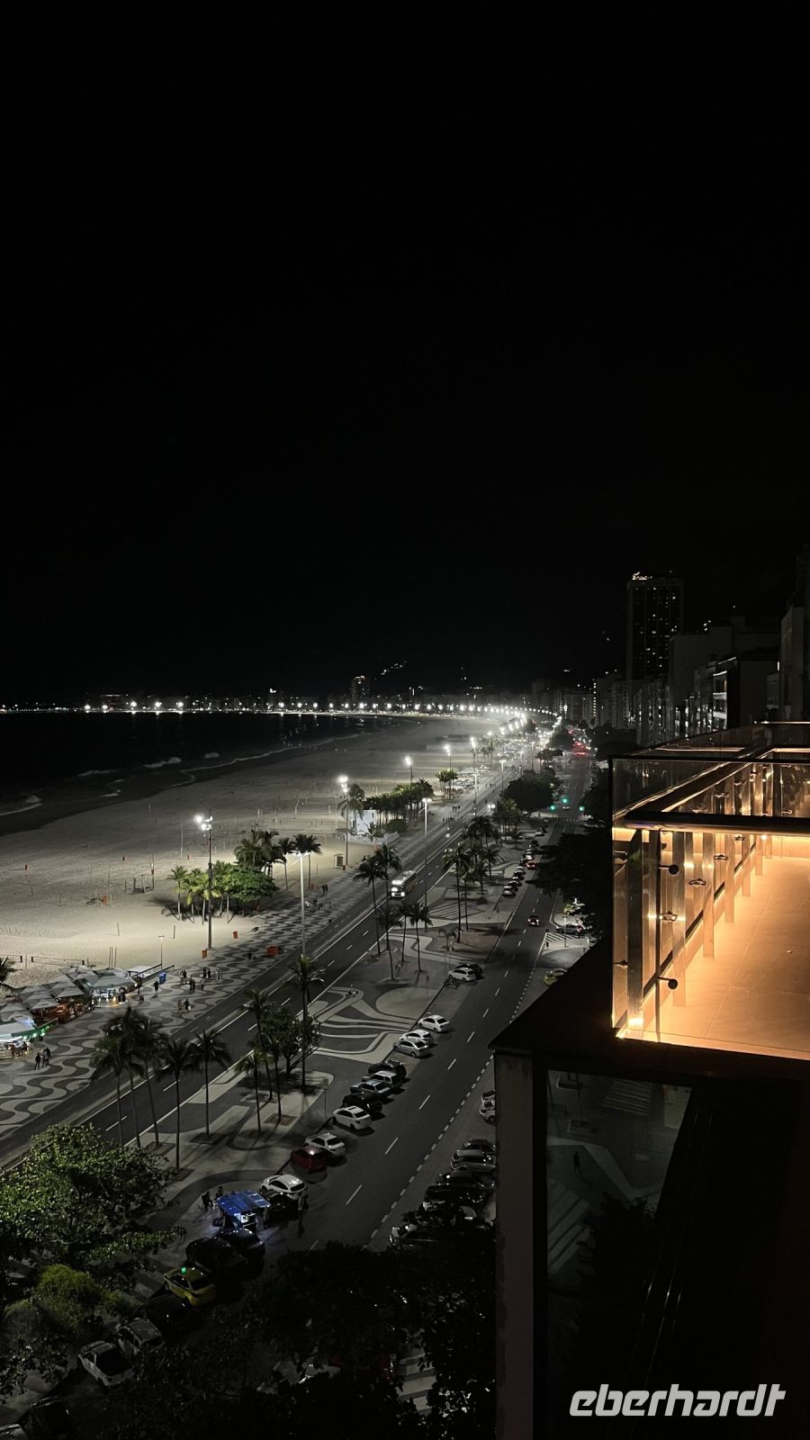 Auf dem Weg vom Flughafen zu unserem Hotel an der weltberühmten Copacabana vorbei, führte uns der Weg direkt zu einem traditionellen brasilianischen Churrasco. Wir aßen nach Herzenslust und stärkten uns für einen Spaziergang an der Copacabana-Promenade. In dieser Fußgängerzone herrschte an diesem Abend bei schönem Wetter reges Treiben. Viele Menschen, die Sport trieben, tanzten, Kunsthandwerk verkauften, feierten oder einfach nur den Sonnenuntergang genossen, waren dort versammelt, jeder auf seiner eigenen Mission.