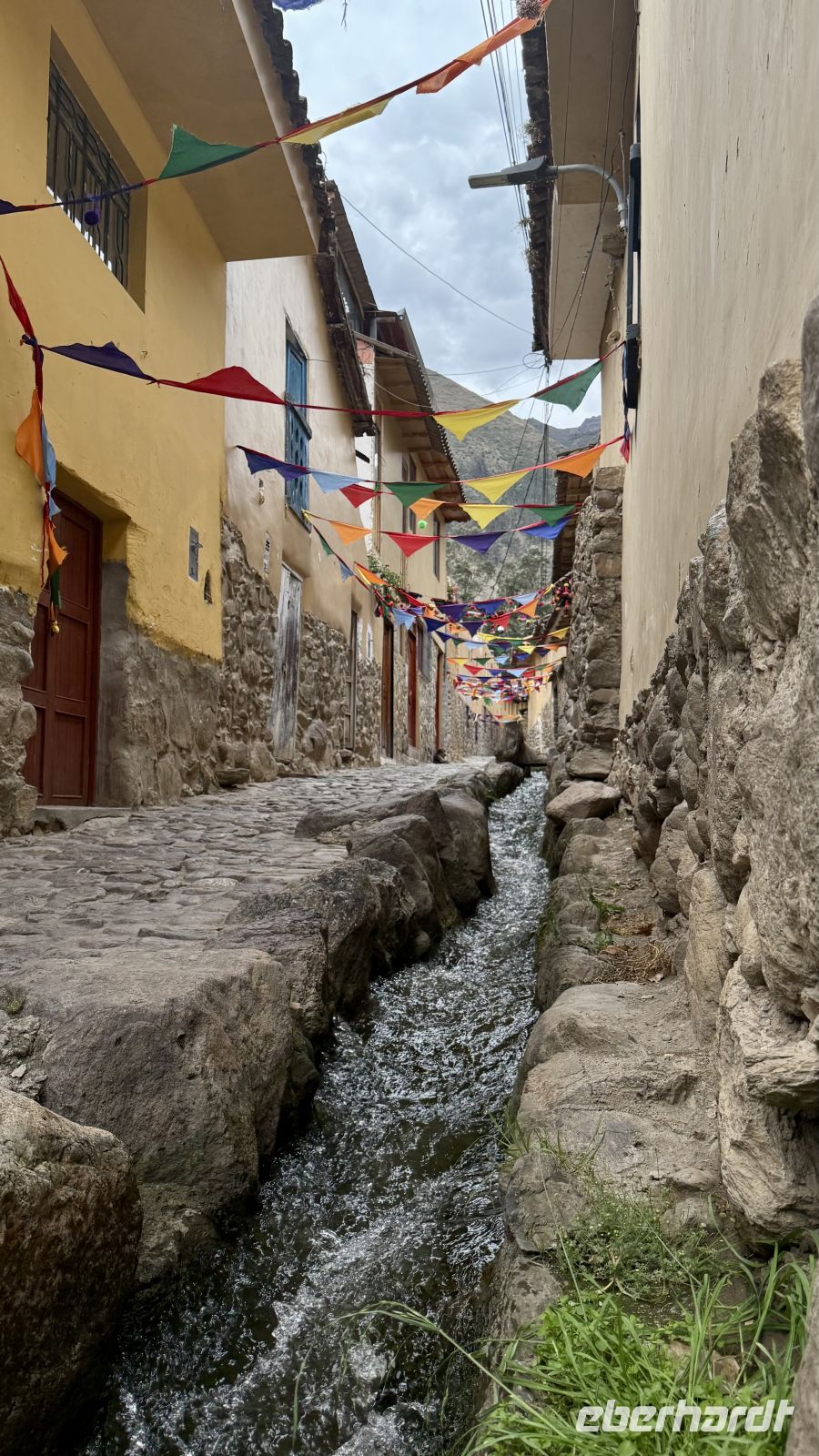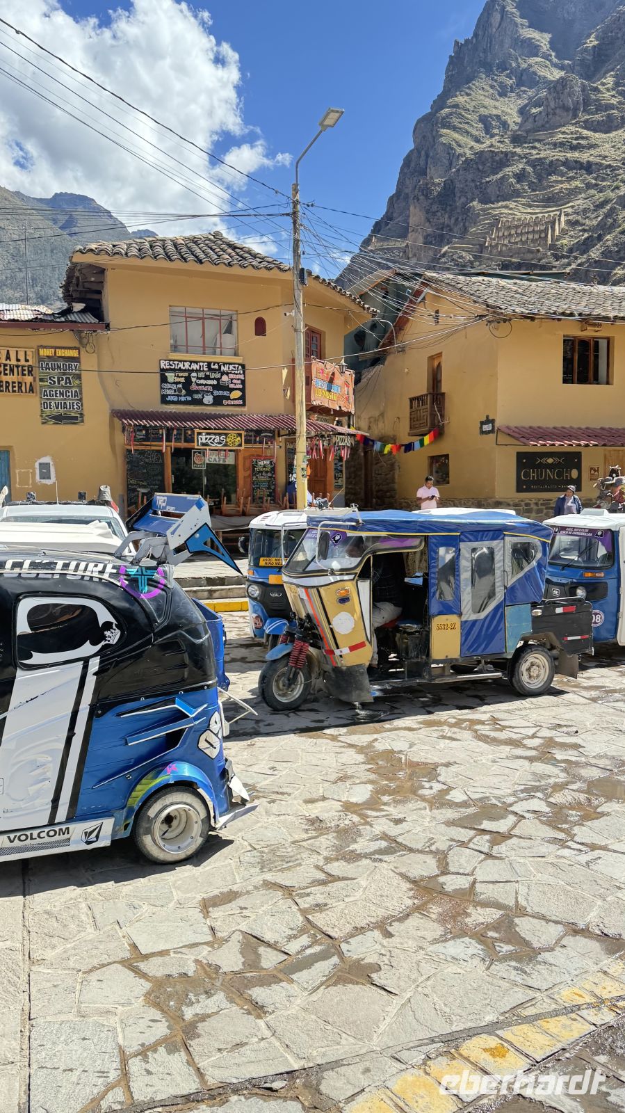 Von dort war es nur ein Sprung zum Bahnhof in Ollantaytambo. Unterwegs konnten wir ein wenig vom Alltag der Einheimischen beobachten: da waren die Motorrad-Taxis, die durch die Straßen schwärmen, aber auch die berühmten Träger des Inka-Trails, sei es mit ihren großen Bündeln auf den Schultern gehend oder die Ausrüstung waschend und vorbereitend, bevor sie wieder von ihnen transportiert wird: ein ganz eigener Alltag.