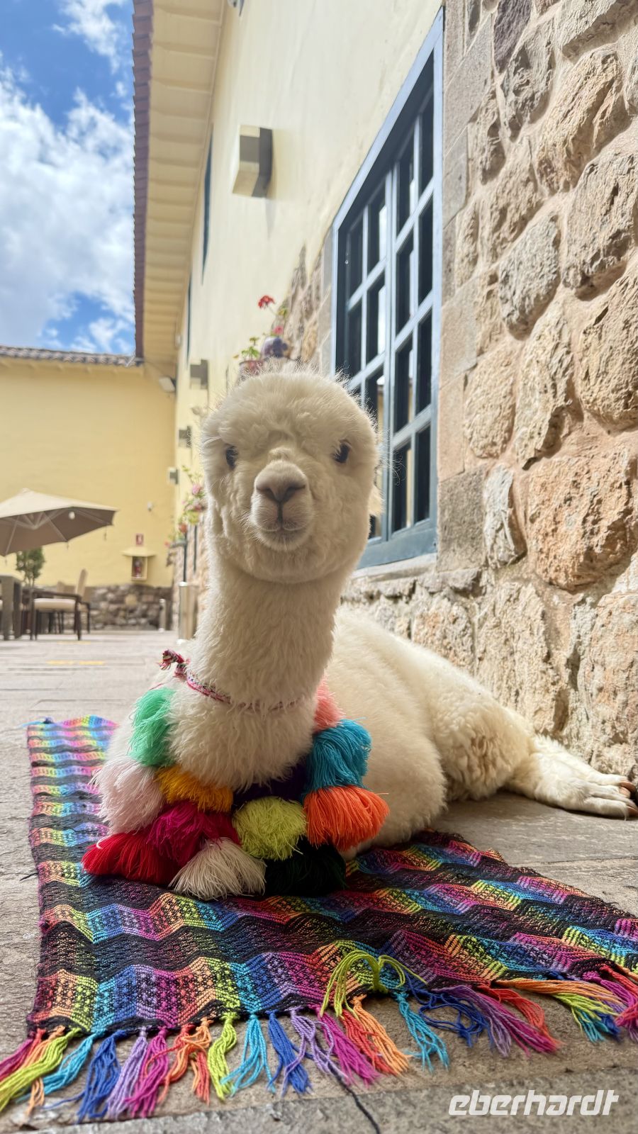 Gutes Wetter erwartete uns an diesem Morgen. Die Morgendämmerung war großartig vom wunderschönen Innenhof des Hotels im Kolonialstil anzuschauen. Bevor wir aufbrachen, um die Stadt zu erkunden, begrüßten wir noch Panchita, das hübsche junge Alpaka, das zu Besuch ins Hotel kam.