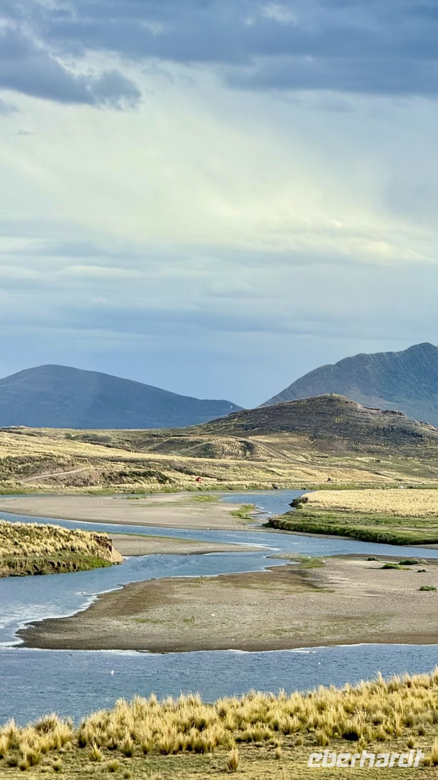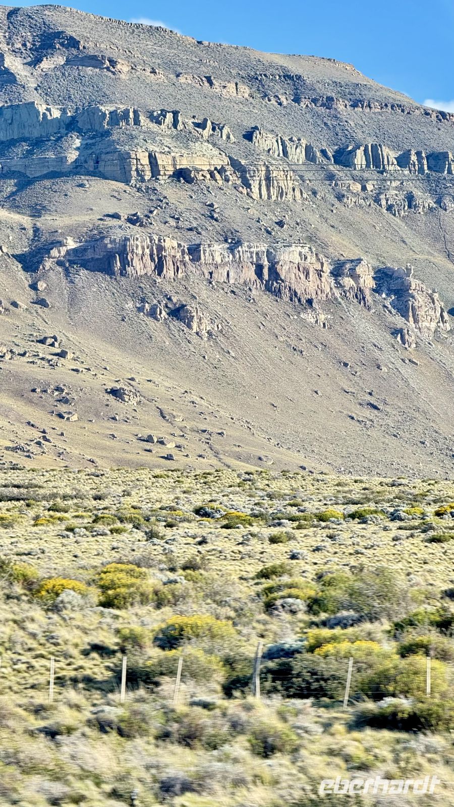 Nach und nach fuhren wir weiter, bis wir nahe der Grenze waren. Dort in der Ferne, auf beiden Seiten, scheint sich ein Tsunami aus Stein und Erde auszudehnen: imposante Formation von großer Höhe, auf der wir fast gleiten könnten, wenn sie Wasser hätte. Der Wind, die Kälte und sind die Sonne gleichzeitig dort, ebenso wie das unerwartete Warten, das wir mitten in der Pampa durchstehen mußten.