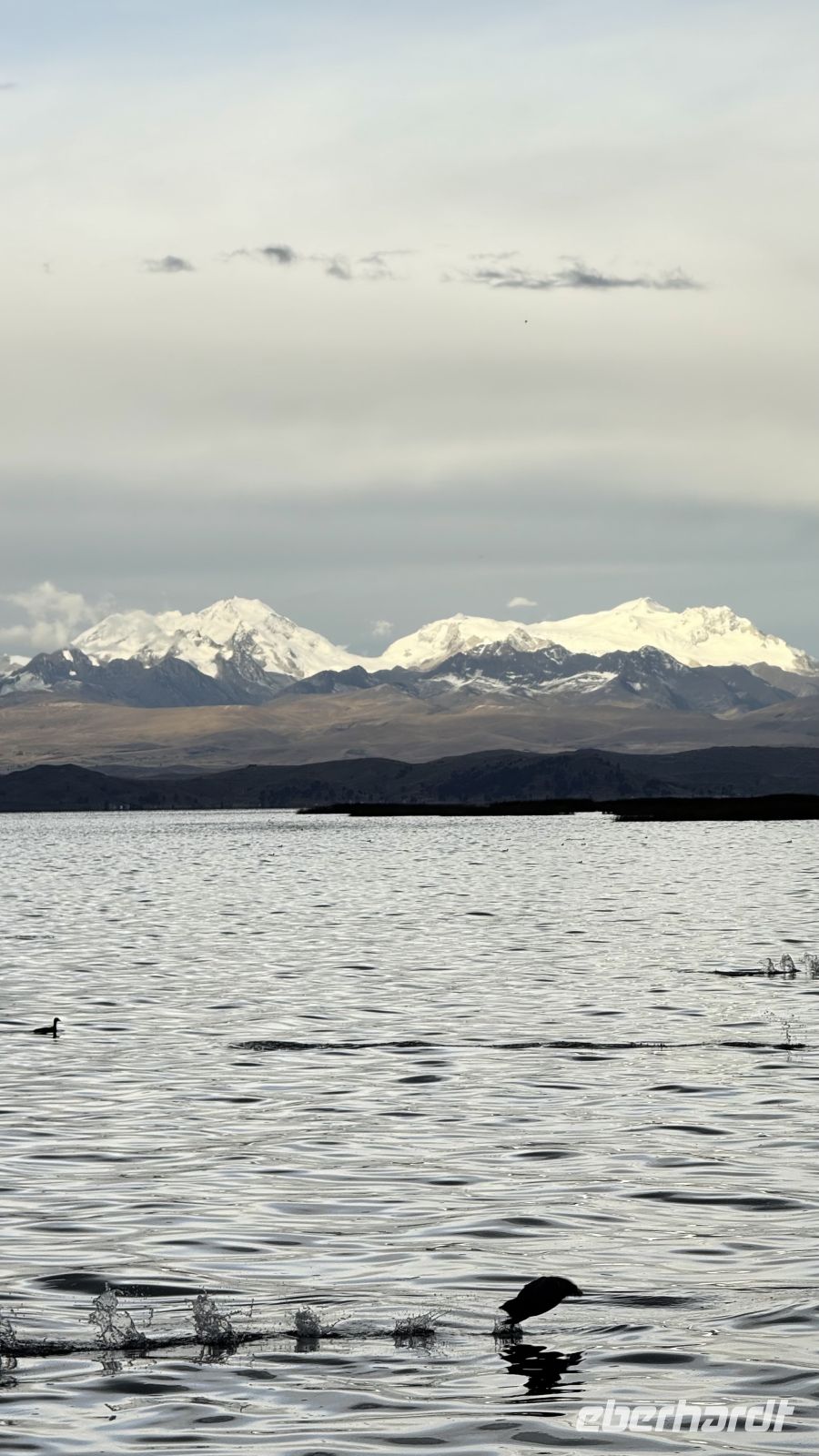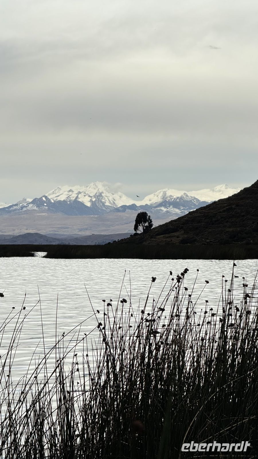 Unsere Tour des Tages, die noch weit davon entfernt war zu enden, brachte uns noch zur Mondinsel mit ihren Ruinen und ihrer Musik, und dann die schwimmenden Inseln, die bis zum Rand mit den guten Gefühlen ihrer Bewohner gefüllt waren. Zu diesem Zeitpunkt verschwand die Sonne schon langsam, aber nicht ohne uns vorher ein perfektes Bild zu schenken: der See, die schneebedeckten Berge im Hintergrund, beleuchtet von den letzten Sonnenstrahlen.