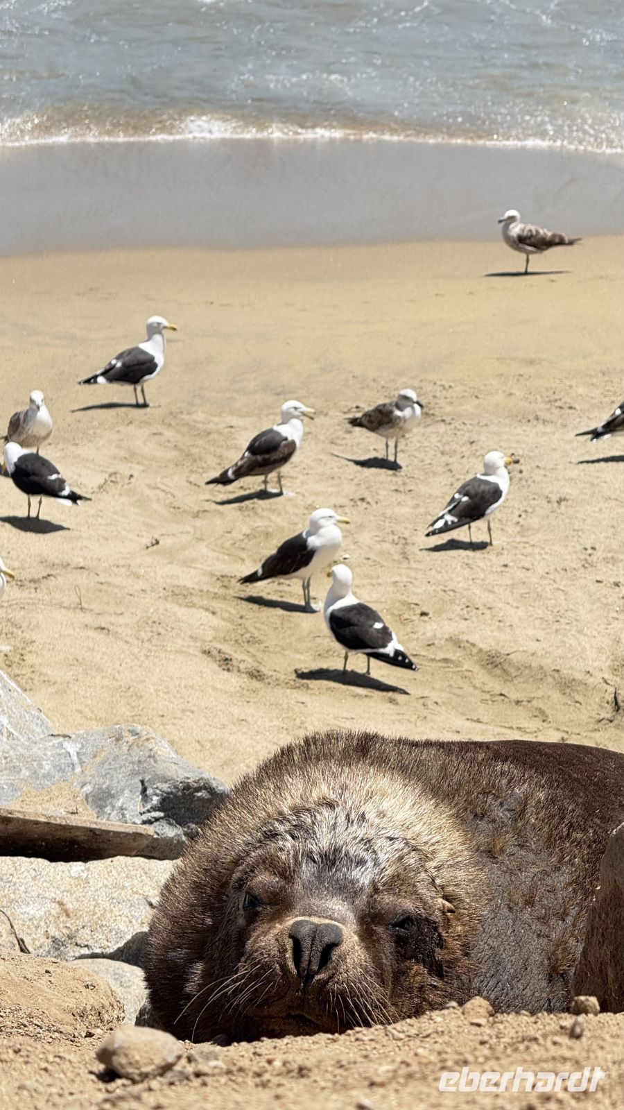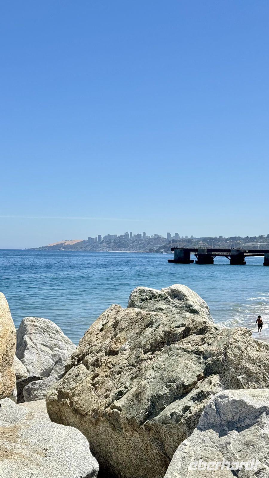 Der Moai, ernst wie eh und je, erwiderte unseren Blick – denn so sind er und all seine Artgenossen. Wir hatten das Starr-Duell verloren, also setzten wir unseren Weg fort.Und genau dort, als wir Valparaíso erreichten, sahen wir riesige Seelöwen, die sich im Sand, im Wasser wälzten, und ein paar von ihnen praktisch am Straßenrand, als wären sie Touristen, die die köstliche Sommersonne genossen, die mit dem blauen Meer und Himmel strahlte. Einfach blau, denn mehr kann nicht sein.