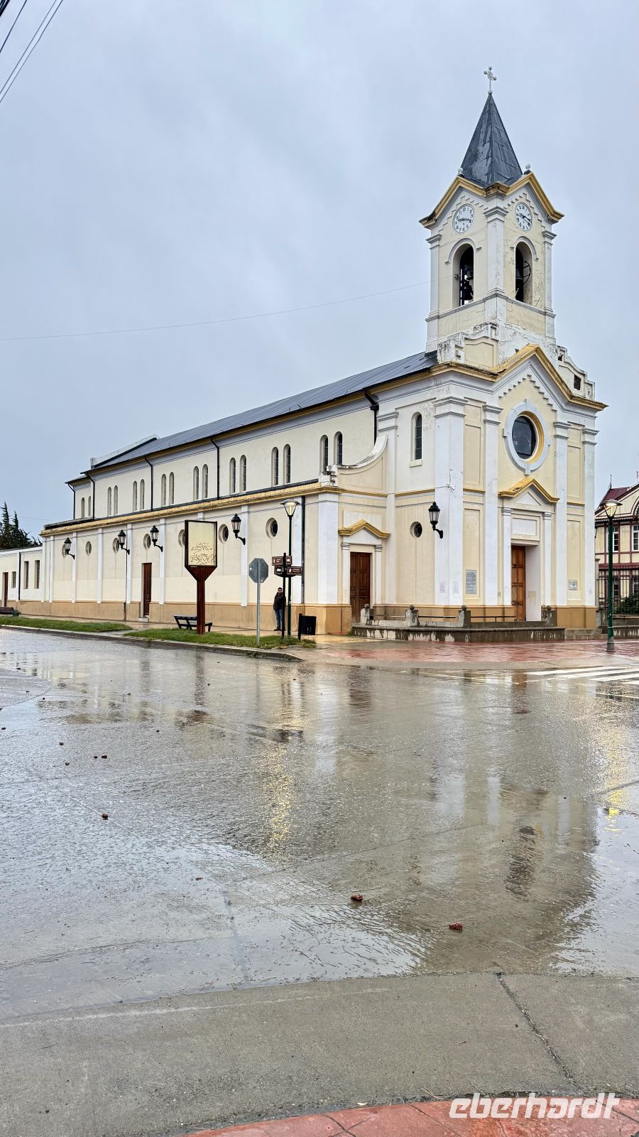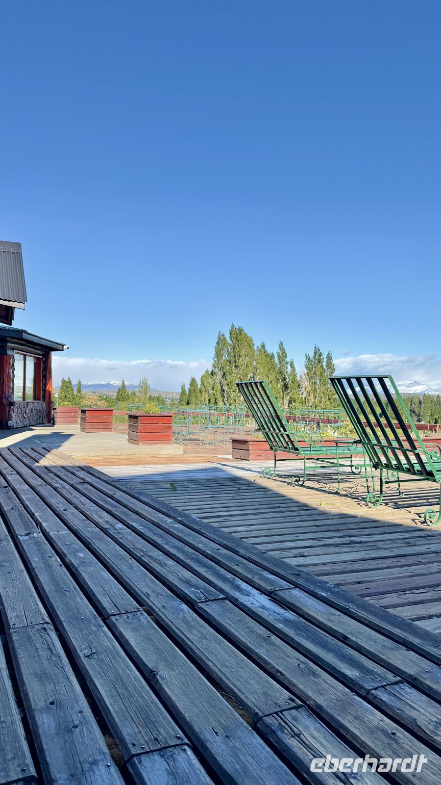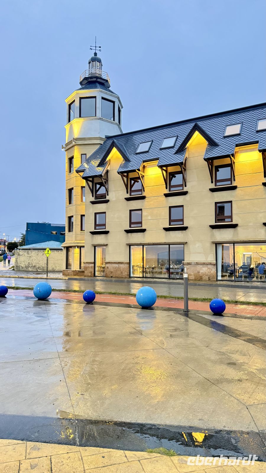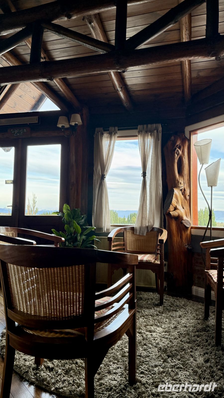 Wir verbrachten einen ruhigen Tag, für viele eine ersehnte Ruhe in einer perfekten Umgebung: ein wunderschöner dekorierter Salon, sanfte Musik im Hintergrund, zusätzlich zu den zeitweise heftiger werdenden Winden. Die Regentropfen, die gegen die Fenster schlugen, verschmolzen mit den Umgebungsgeräuschen und meinen Gedanken. Der Tag verging langsam, nach und nach gewannen wir unsere Kräfte zurück. Das Grau des Himmels blieb eine Konstante, die Kälte draußen kommt nicht über die Türschwelle herein. Eine warme und tröstliche Atmosphäre lud zum Nachdenken ein, ein leichtes Gespräch mit einem Reisegast, der zu einem Freund wurde, da man so viel miteinander teilte. Der Kamin im Hintergrund, die schöne Landschaft hinter den großen Fenstern, die Struktur aus wunderschön polierten Stämmen, die ihre ursprünglichen Formen zeigen und noch lebendig erscheinen, verliehen dem großen Raum Gefühl. So verging der Beginn dieses Montags, der uns dem Ende unserer Reise näher brachte.
