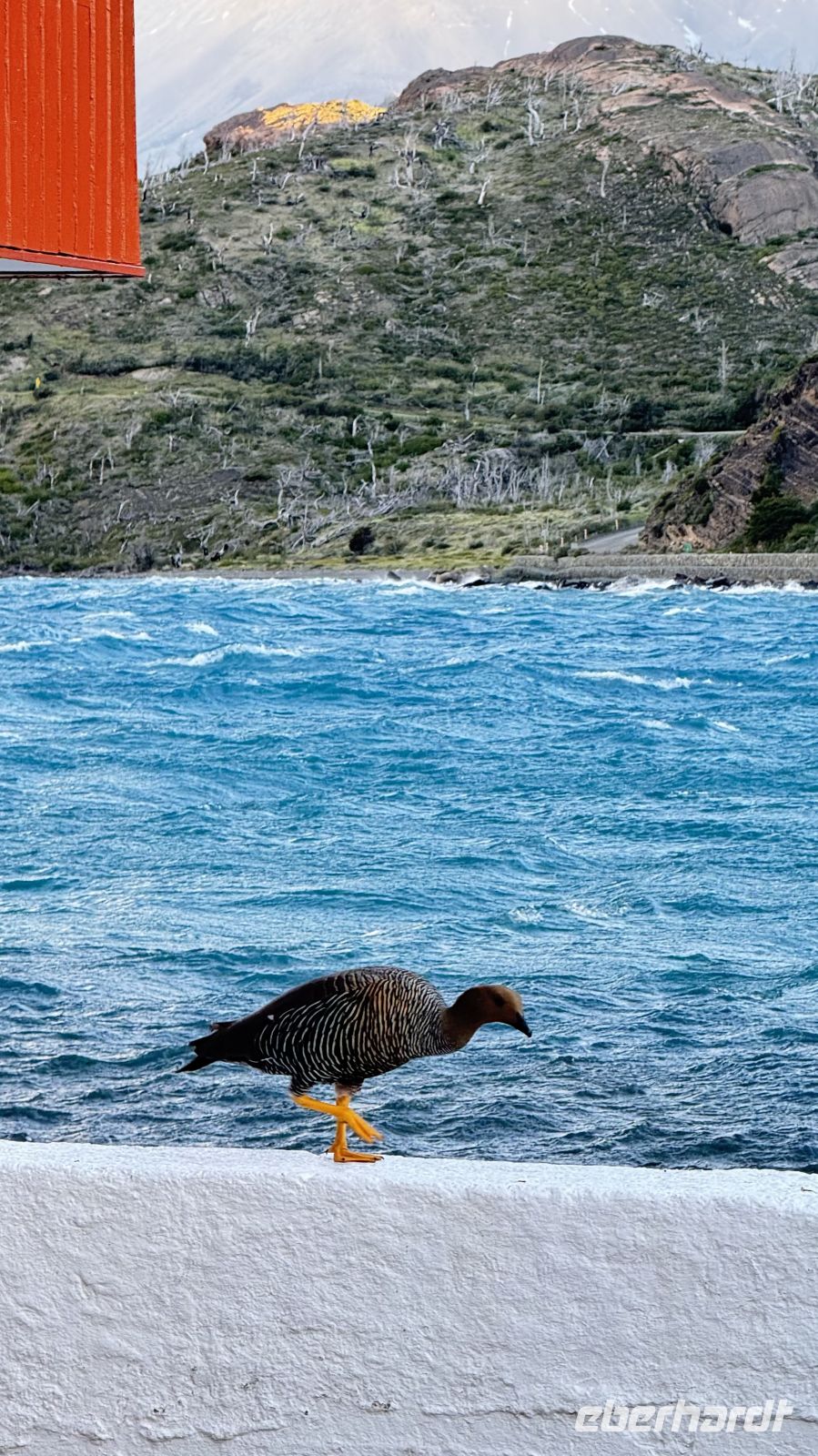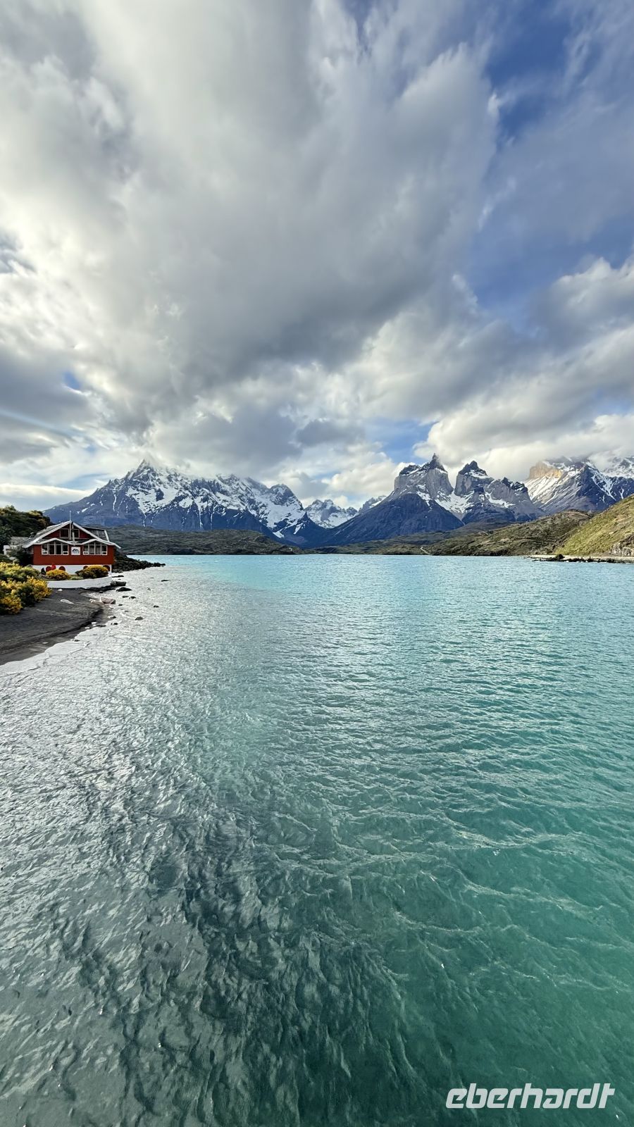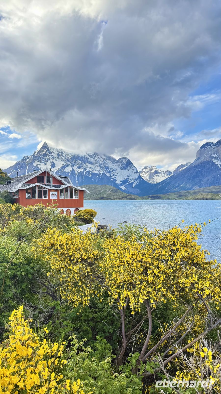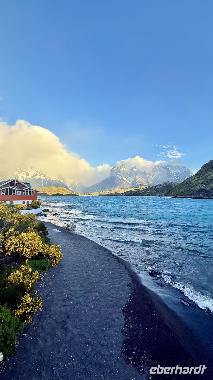 Bitte langsam, keine Eile, wir sind bereits im Paradies angekommen. Diese Gedanken kamen mir in dem Moment in den Sinn, in dem ich das Kunstwerk enthüllte, was sich hinter den Vorhängen meines Fensters verbarg. Ein einzigartiger Ausblieck: der Lago Pehoé von tiefblauem Blau, die Sonnenstrahlen, die in jeder Ritze, jedem Felsen, jedem Strauch Kontraste schafften. Der Sturm hob den Schnee an, der die Gipfel der imposanten Torres del Paine bedeckt. Ihre Hörner, die an den Gipfeln hervorkommen, als wollten sie in einer letzten Anstrengung den Himmel spalten, bevor sie in der Zeit eingefroren bleiben. Mit scharfen Kanten scheinen die Berge noch Bewegung zu haben, als wären sie erst vor Augenblicken direkt aus den Eingeweiden des Globus aufgetaucht.