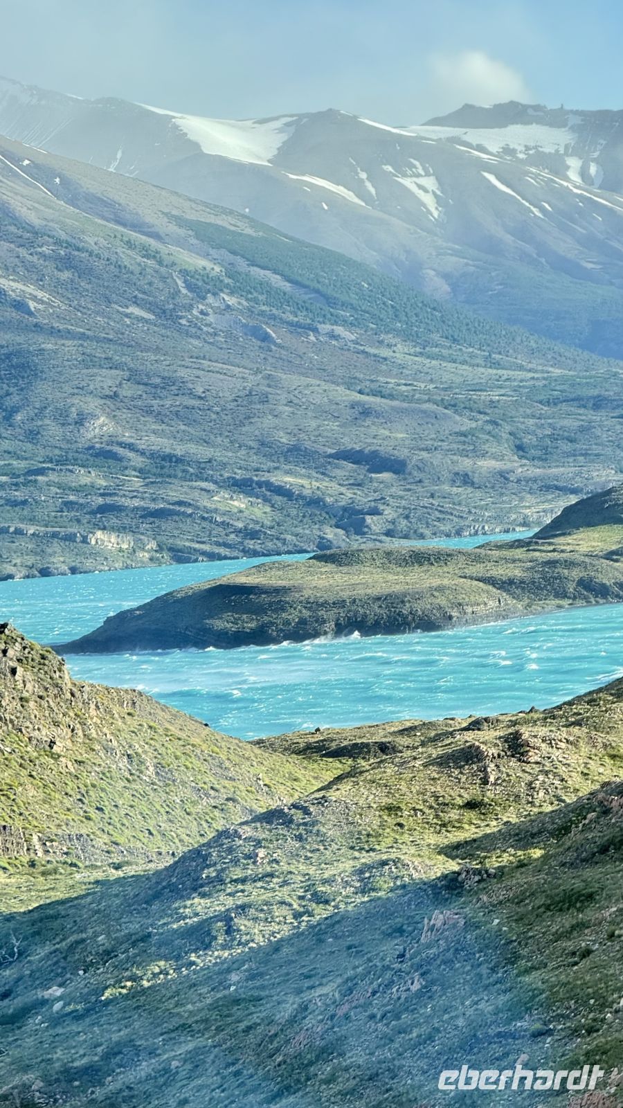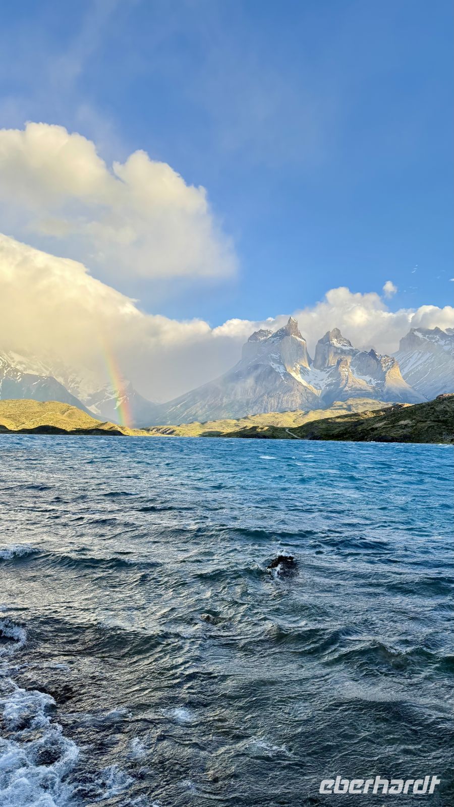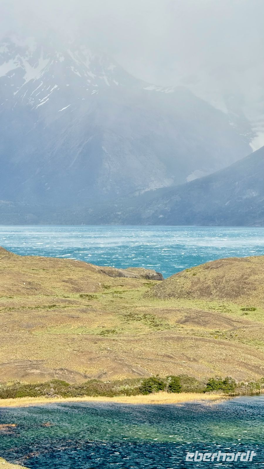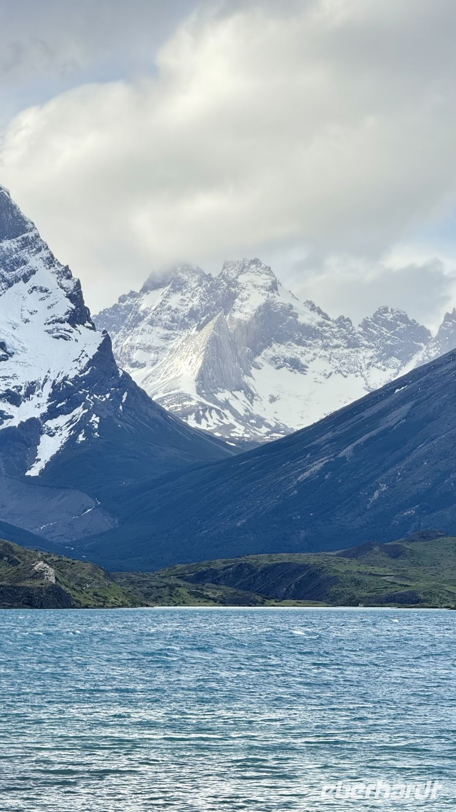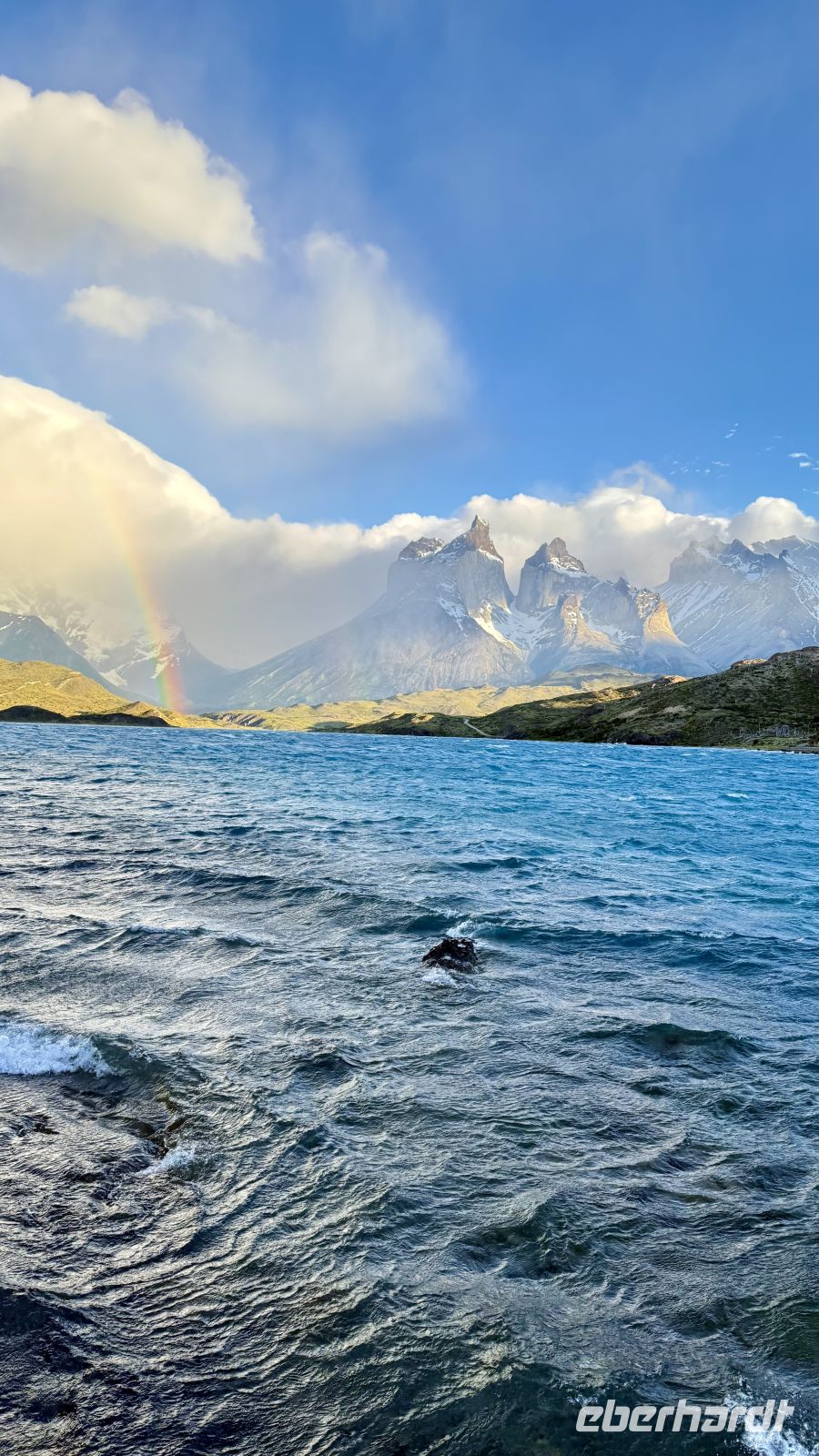Bitte langsam, keine Eile, wir sind bereits im Paradies angekommen. Diese Gedanken kamen mir in dem Moment in den Sinn, in dem ich das Kunstwerk enthüllte, was sich hinter den Vorhängen meines Fensters verbarg. Ein einzigartiger Ausblieck: der Lago Pehoé von tiefblauem Blau, die Sonnenstrahlen, die in jeder Ritze, jedem Felsen, jedem Strauch Kontraste schafften. Der Sturm hob den Schnee an, der die Gipfel der imposanten Torres del Paine bedeckt. Ihre Hörner, die an den Gipfeln hervorkommen, als wollten sie in einer letzten Anstrengung den Himmel spalten, bevor sie in der Zeit eingefroren bleiben. Mit scharfen Kanten scheinen die Berge noch Bewegung zu haben, als wären sie erst vor Augenblicken direkt aus den Eingeweiden des Globus aufgetaucht.