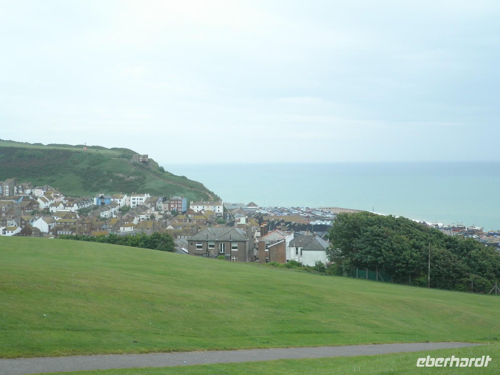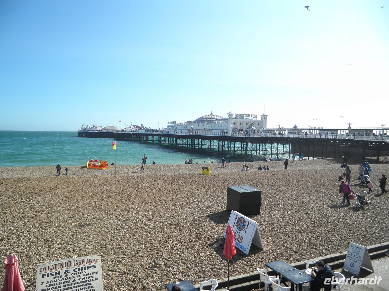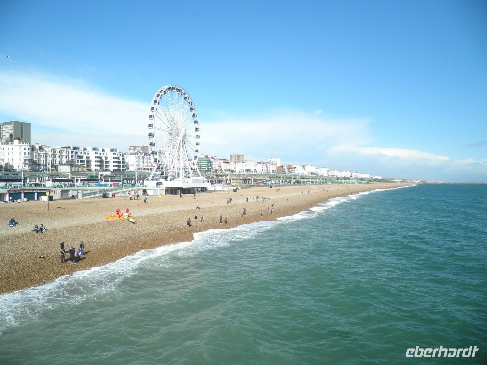 Leeds Castle war unser erster Höhepunkt des Tages. Ein Schloss wie im Märchen, dass sich malerisch aus dem Wasser zu erheben scheint und darin spiegelt. Um die Gebäude herum hat man wunderschöne Garten- und Parkanlagen angelegt. Ein weißer Pfau schien extra für uns sein prächtiges Rad zu schlagen. Wir nahmen Abschied von Leeds Castle, um nach Scotney Castle zu fahren. Wieder erwartete uns ein herrlicher Garten mit wunderschönen Schlossgebäuden, saftigen Wiesen und farbenprächtig blühenden Rhododendronbüschen. Das alte Schloss den Hügel hinab erhebt sich hinter einem Seerosenteich. Wir standen und staunten. Hastings, die Hafenstadt mit dem berühmten Namen, erwartete uns mit Regenwetter. Davon ließen wir uns jedoch nicht abhalten, die Stadt mit dem Namen der berühmten Schlacht des Normannen William the Conquerer 1066 gegen die Angelsachsen, zu erkunden. Einige fuhren mit einer der Standseilbahnen hinauf, um den Ausblick über den Hafen und die Stadt zu genießen, andere bummelten durch die Geschäftsstraßen und zwischen den Netshops hindurch, andere wiederum wagten sich trotz des nassen und windigen Wetters hinunter zum Strand, um den Wellen zu lauschen. Am Abend bezogen wir unser Hotel direkt an der Seepromenade in Brighton, dem königlichen Bad aus victorianischer Zeit.