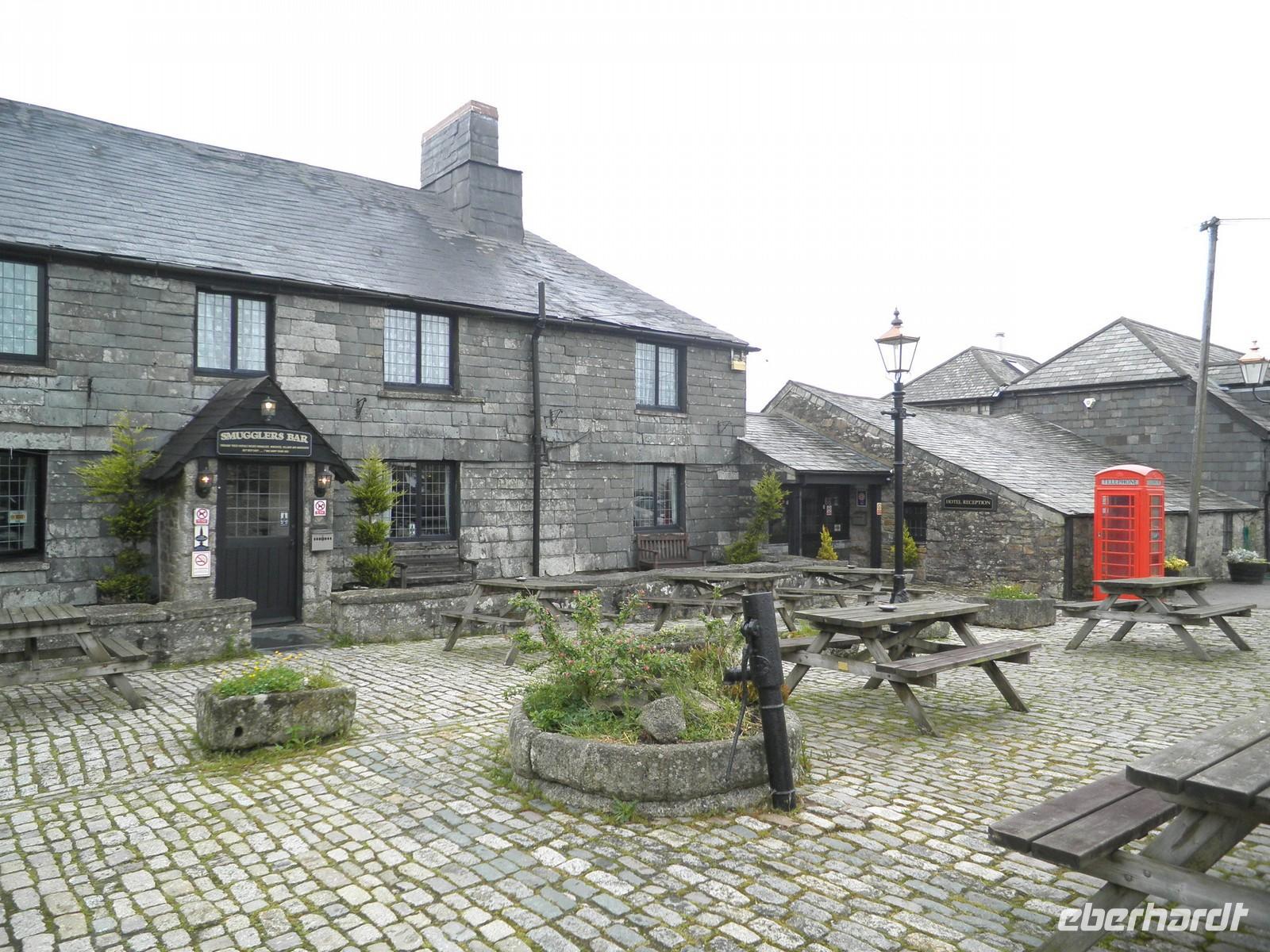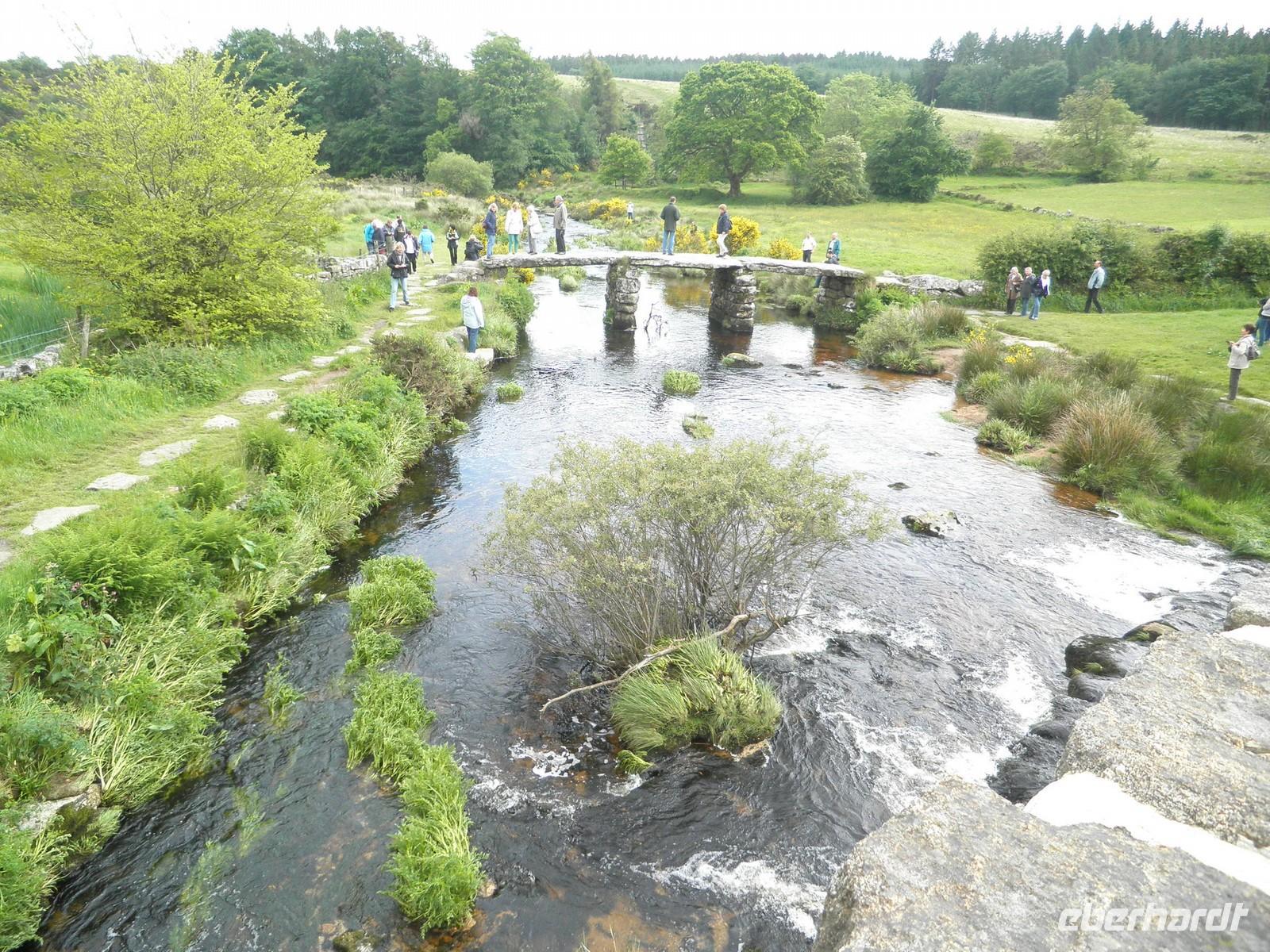 Nun aber wurde es richtig mystisch, das Dartmoor empfing uns mit karger Landschaft, schroffen Felsen und den Geschichten um riesige Hunde mit glühenden Augen. Wir sahen keine der Bestien, dafür aber eine sogenannte Clapper Bridge, die wir sogar zu Fuß benutzten, um den Fluss zu überqueren. Die Brücke stammt bereits aus dem 12. Jahrhundert und besteht aus lose aufeinander gelegten großen schweren Granitplatten. Die Ponys im Dartmoor sind wohl oft darüber getrappelt, von den Geräuschen der Hufe soll der Name „Clapper“ herrühren. In Princetown stiegen wir gegenüber des berühmt-berüchtigten Gefängnisses aus, wir fotografierten und versetzten uns in die Zeit zurück, als französische Kriegsgefangene selbst ihr späteres Gefängnis bauen mussten.