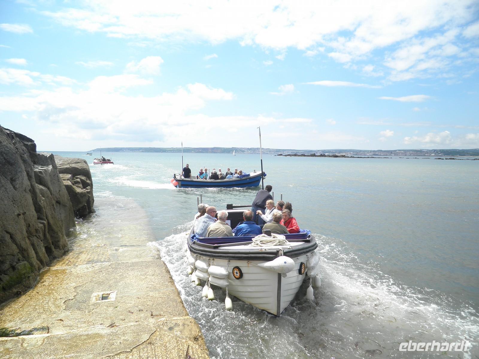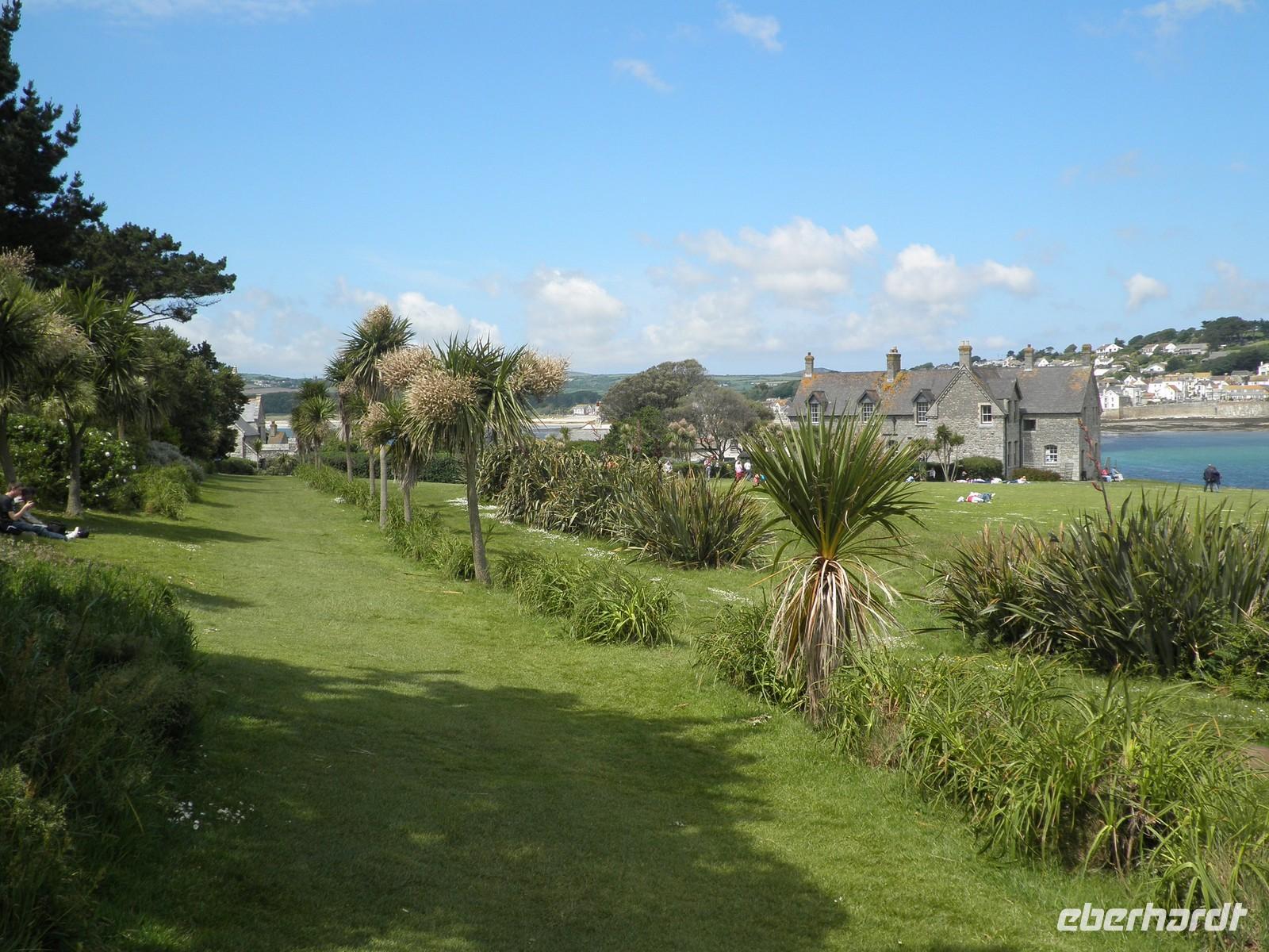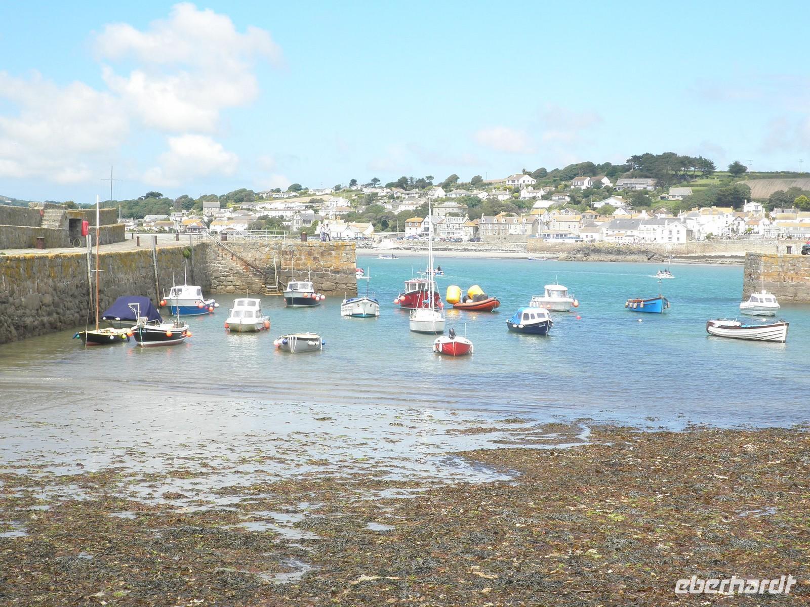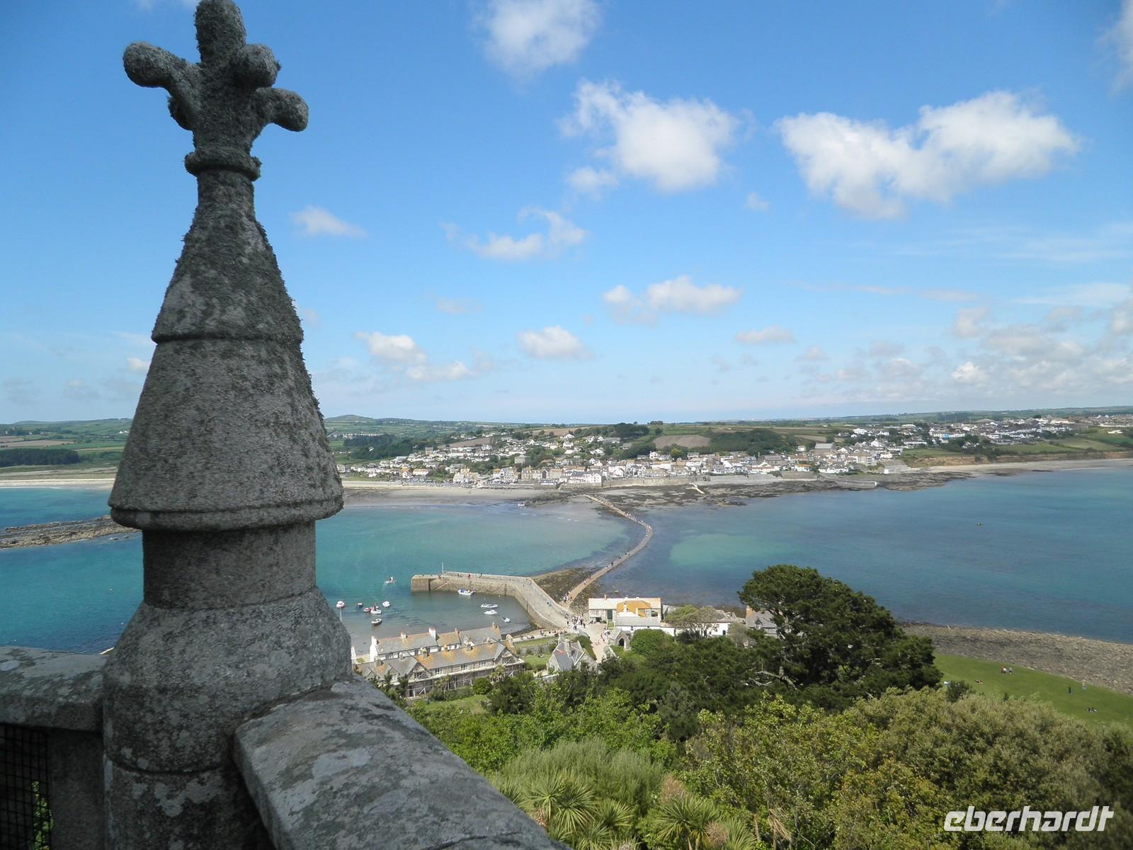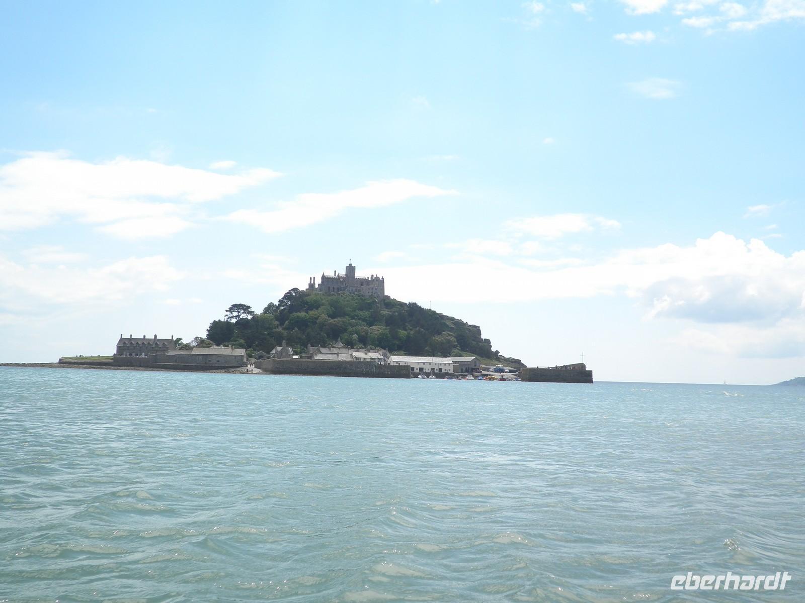 In Marazion kann man hinüber blicken zum St. Michael’s Mount, einer Gezeiteninsel in Cornwall. Wir fuhren mit dem Boot hinüber, um das Castle auf dem Hügel und die Gärten zu besichtigen. Am Ende unseres Besuches konnten wir trockenen Fußes zum Festland zurücklaufen, denn die einsetzende Ebbe hatte inzwischen dafür gesorgt, dass sich das Wasser soweit zurückgezogen hatte, dass wir über den dafür angelegten gepflasterten Weg zurück in Richtung Bus laufen konnten.