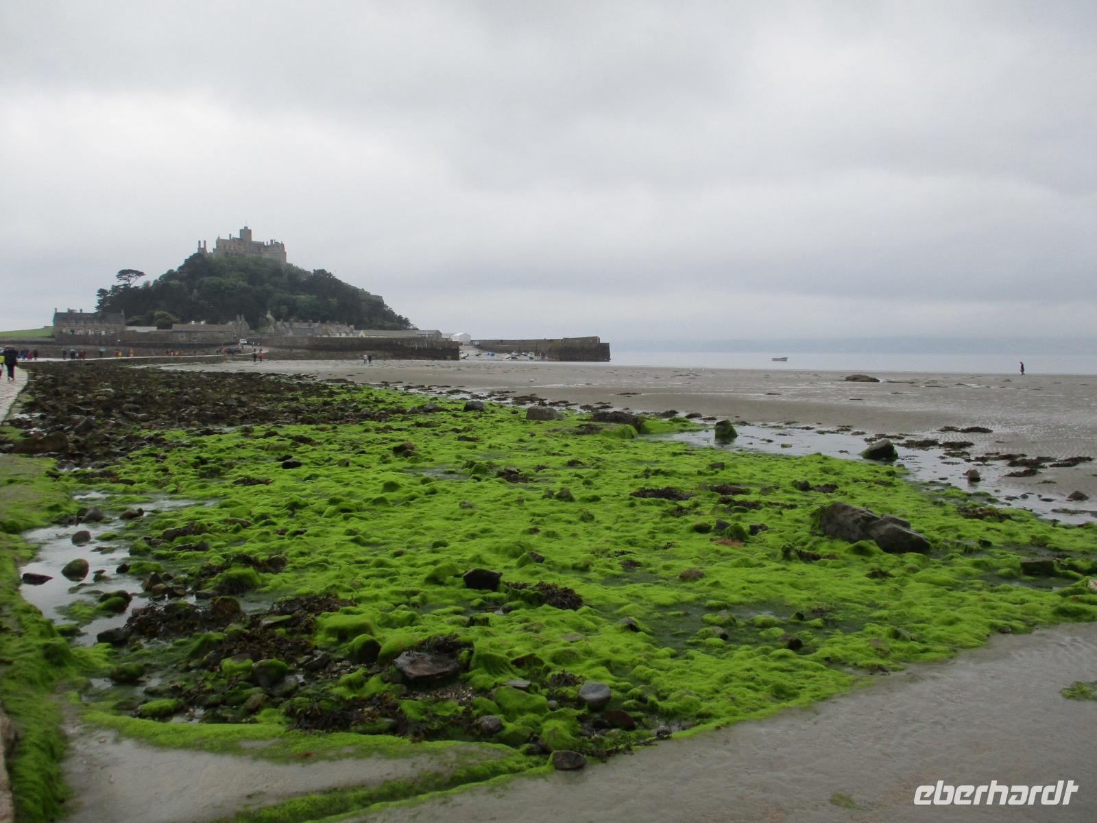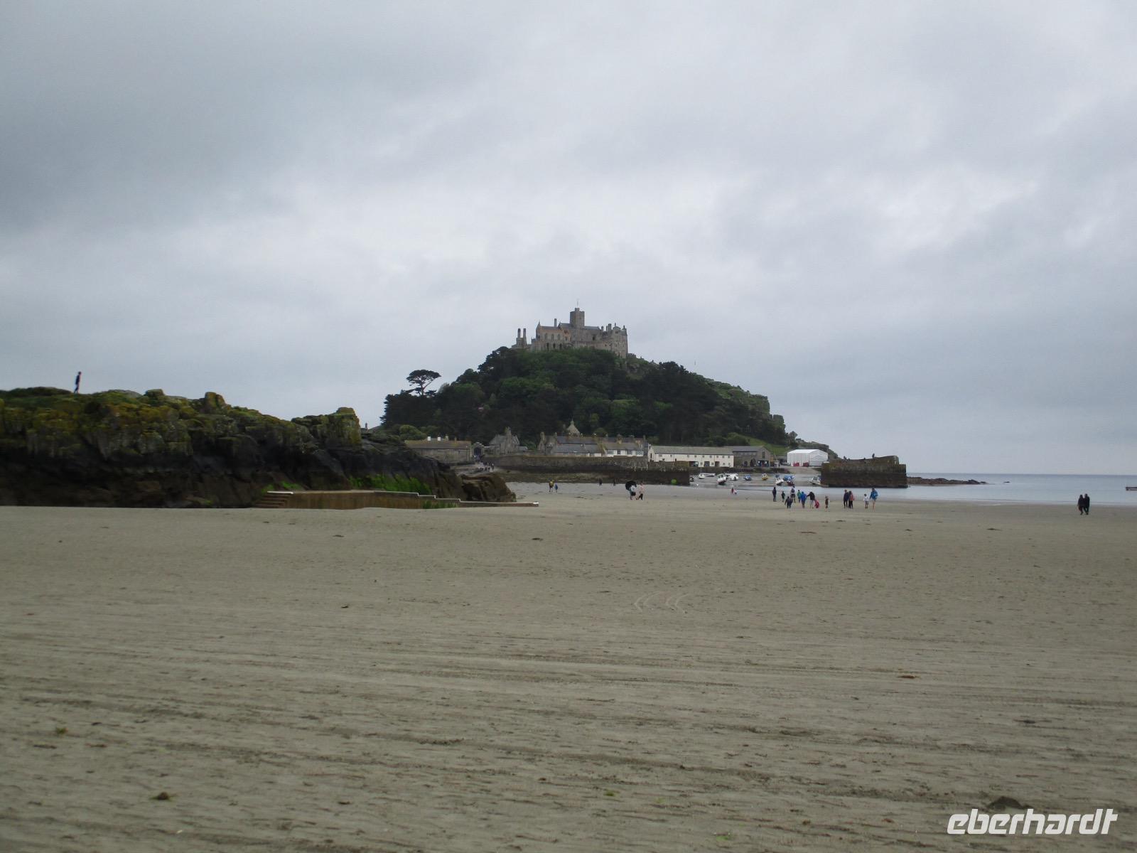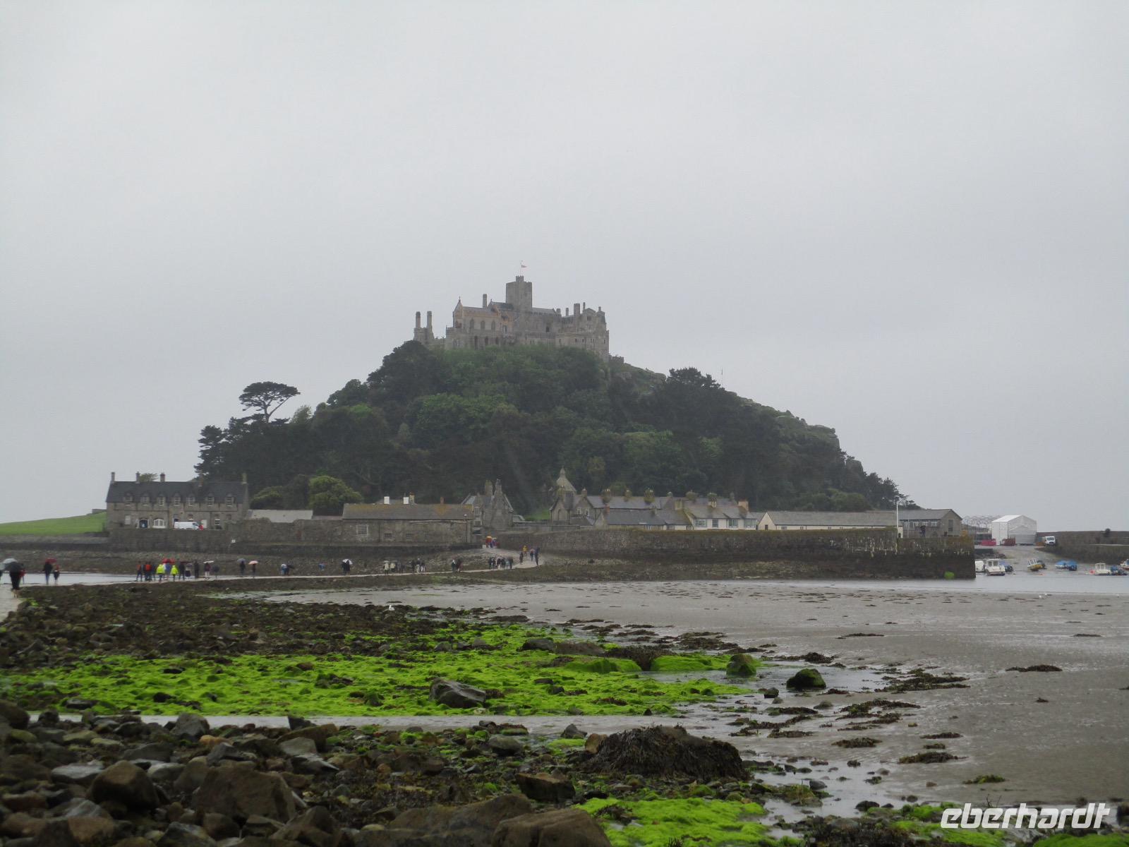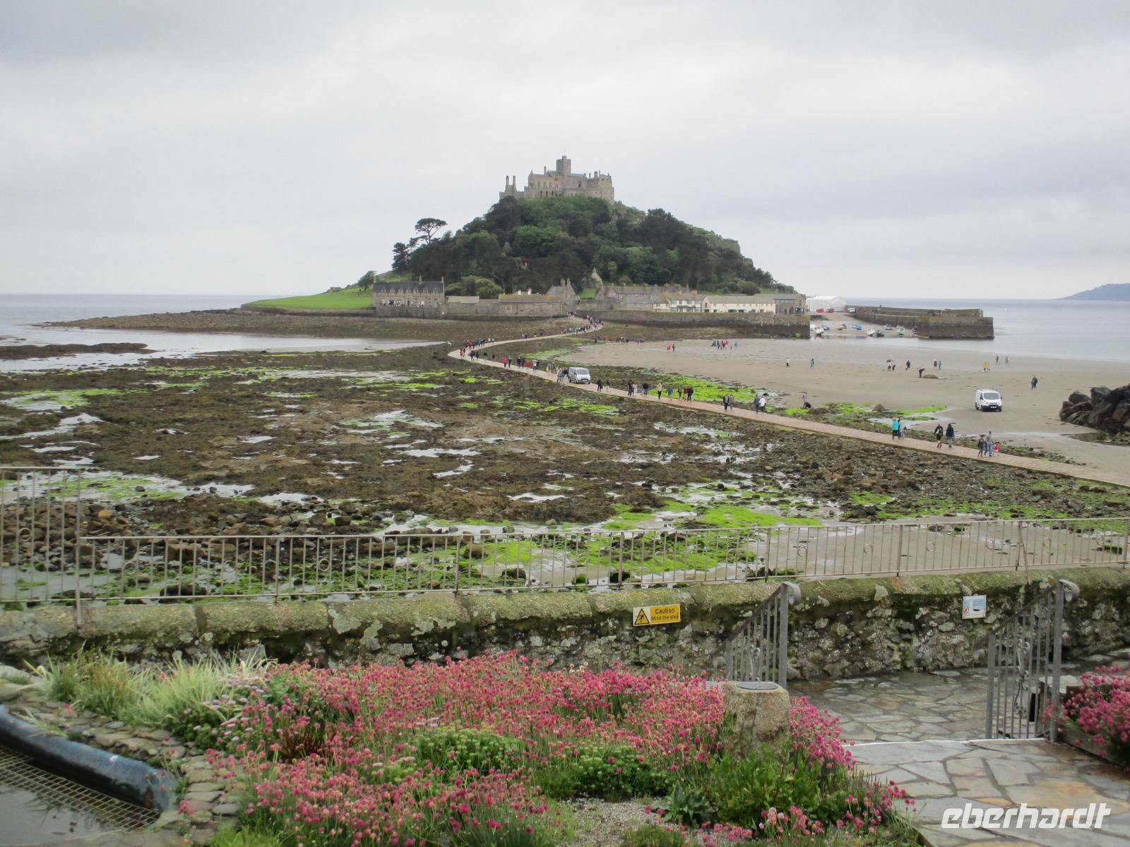 Gleich am Morgen machten wir uns auf und fuhren in Richtung Südwesten. Zunächst erreichten wir das Ende der Welt Cornwalls und Englands. Land's End erwartete uns mit einigen Regenschauern. Wir spazierten einen Weg hinunter zum letzten Aussichtspunkt vor den Klippen, machten zahlreiche Fotos und sahen auch den Wegweiser, auf dem die Entfernung bis New York angezeigt wird. Einige erstanden Postkarten und ließen sich den begehrten Lands-End-Poststempel darauf drucken. In Marazion, unserem nächsten Halt, kann man hinüber blicken zum St. Michael's Mount, einer Gezeiteninsel. Weil Ebbe war, konnten wir auf dem Causeway zu Fuß spazieren, um das Castle auf dem Hügel oder die herrlichen Felsengärten zu besichtigen. Leider kamen während unseres Aufenthaltes auch hier immer wieder Regenschauer, so dass der Schirm unser ständiger Begleiter war. Danach fuhren wir in die Nähe von Falmouth und besuchten Trebah Garden, einen Schluchtengarten mit unzähligen verschiedenfarbig blühenden Rhododendronpflanzen, mit Baumfarnen, farbenfrohen Etagenprimeln und einem idyllischen Bächlein. Auch hier mussten wir immer wieder Regenschauer hinnehmen. Dennoch genossen wir diesen aussergewöhnlichen Garten, zu dem sogar ein Stück Strand gehört.