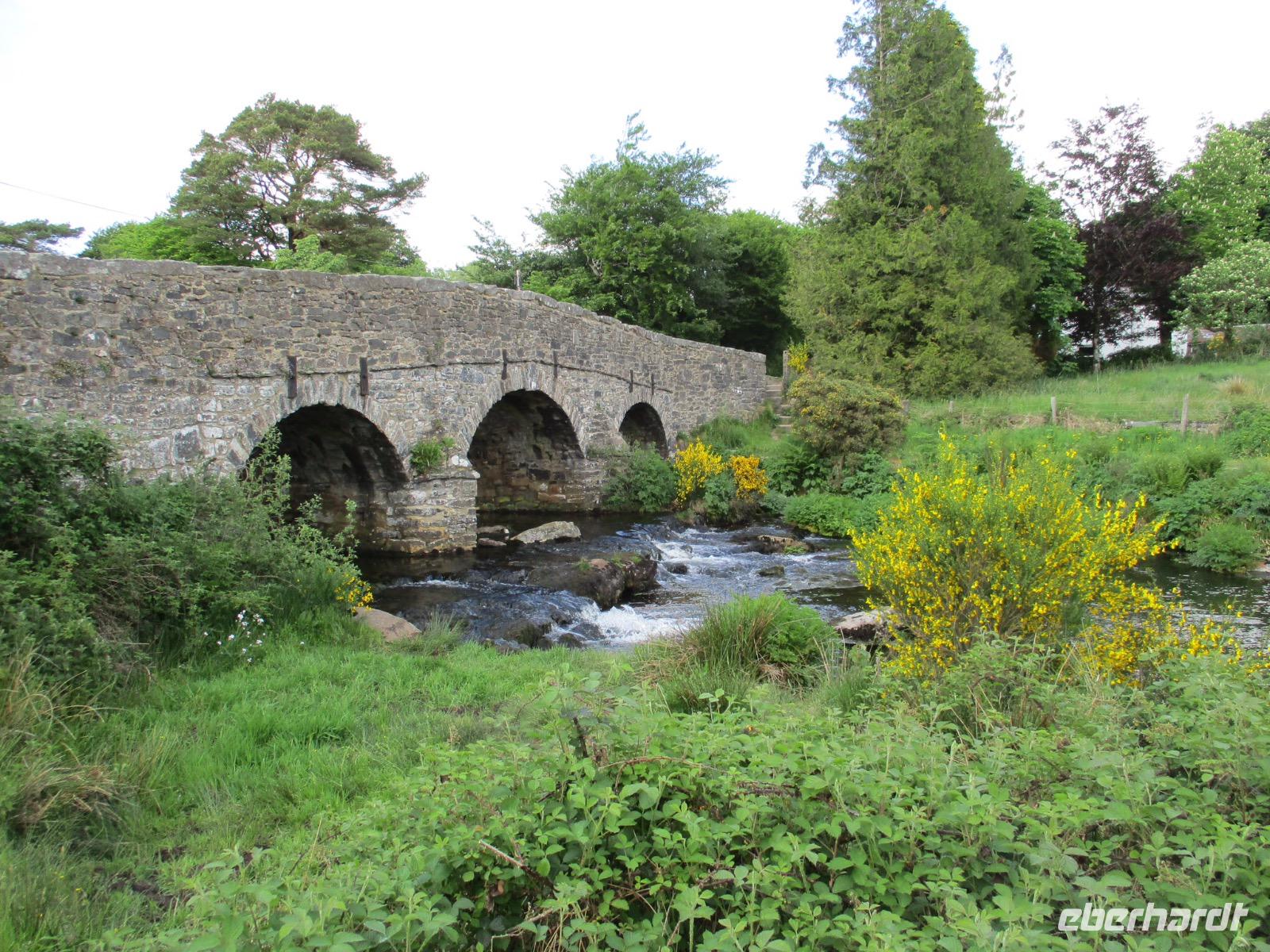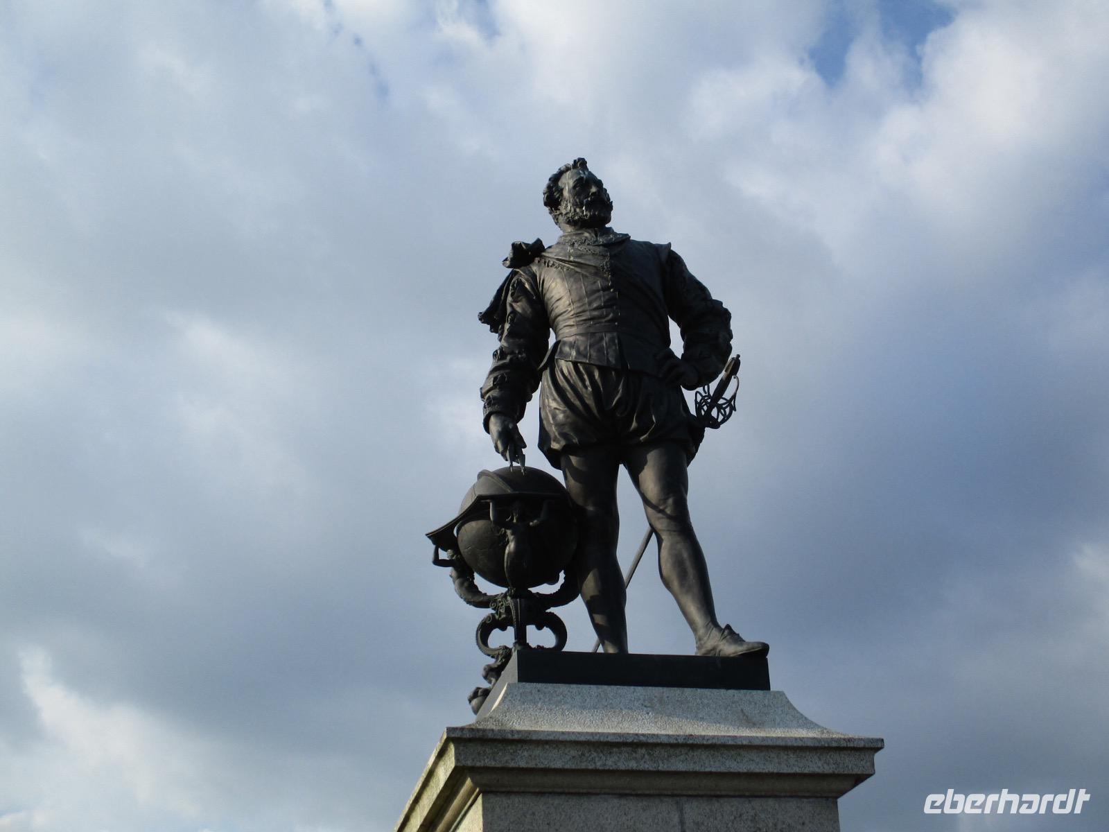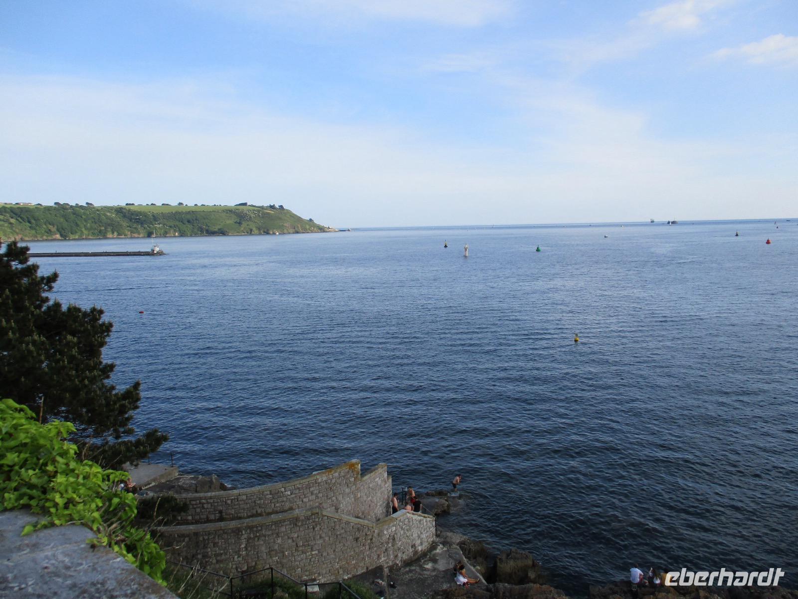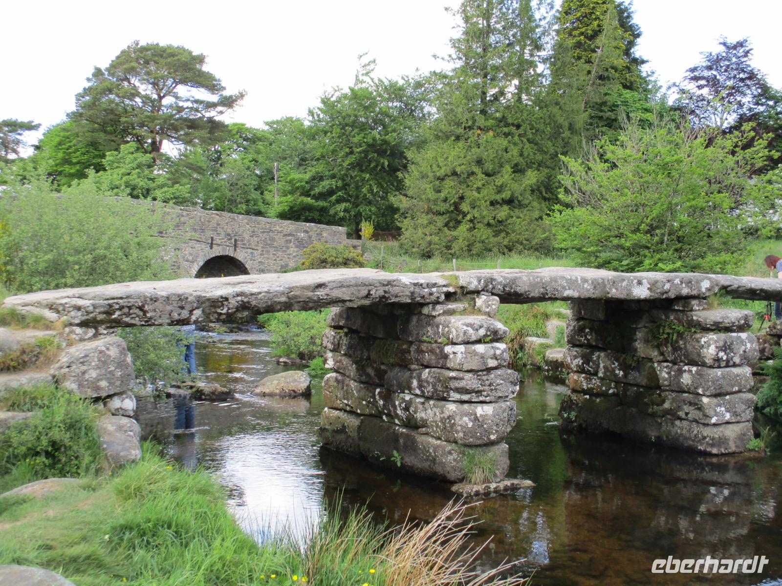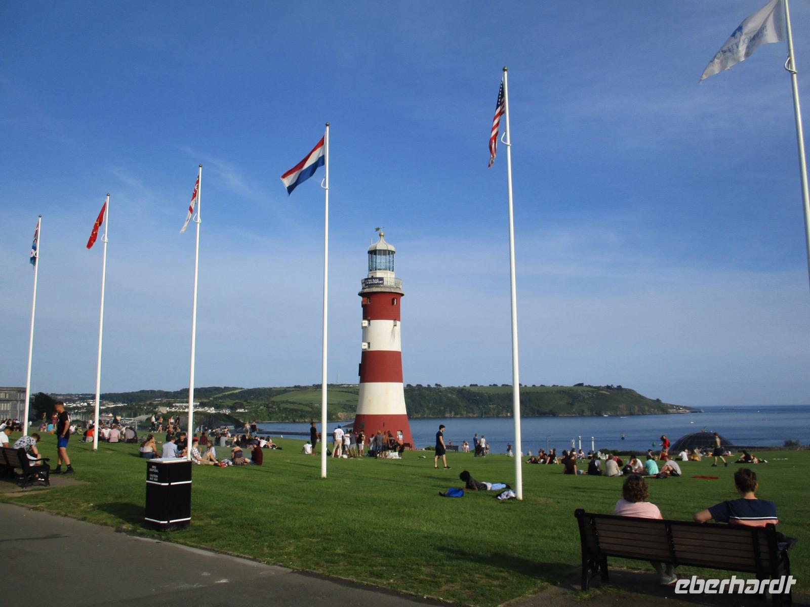 Dann aber wurde es etwas mystisch, das Dartmoor empfing uns mit karger Landschaft, Dartmoor-Ponys, schroffen Granitfelsen, die auch Tors genannt werden, und den Geschichten um schwarze Hunde mit glühenden Augen, wie sie im „Hund von Baskerville" beschrieben werden. Wir sahen keine der Bestien, dafür aber eine sogenannte Clapper Bridge, die wir sogar zu Fuß benutzten, um den Fluss zu überqueren. Die Brücke stammt bereits aus dem 12. Jahrhundert und besteht aus lose aufeinander gelegten großen schweren Granitplatten. Die Ponys im Dartmoor sind wohl oft darüber getrappelt, von den Geräuschen der Hufe soll der Name „Clapper" herrühren. Den Abend beschlossen wir in Plymouth bei einem gemeinsamen Abendessen in unserem zentral gelegenen Hotel Jurys Inn. Aufgrund der Lage des Hotels in der Nähe des Hafens konnten wir Plymouth noch auf eigene Faust auf einem abendlichen Spaziergang erkunden. Manche gingen bis hinauf zu The Hoe, wo heute noch Francis Drake auf einem Sockel stehend die Hafeneinfahrt überblickt, als erwarte er immer noch die spanische Armada, die er im 16. Jahrhundert erfolgreich geschlagen hat.