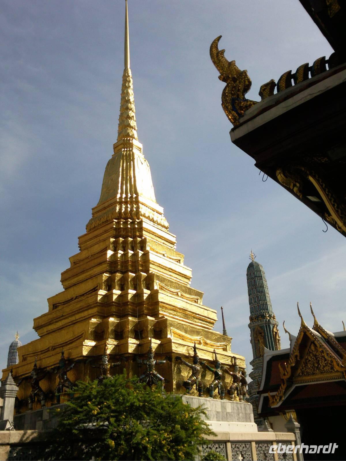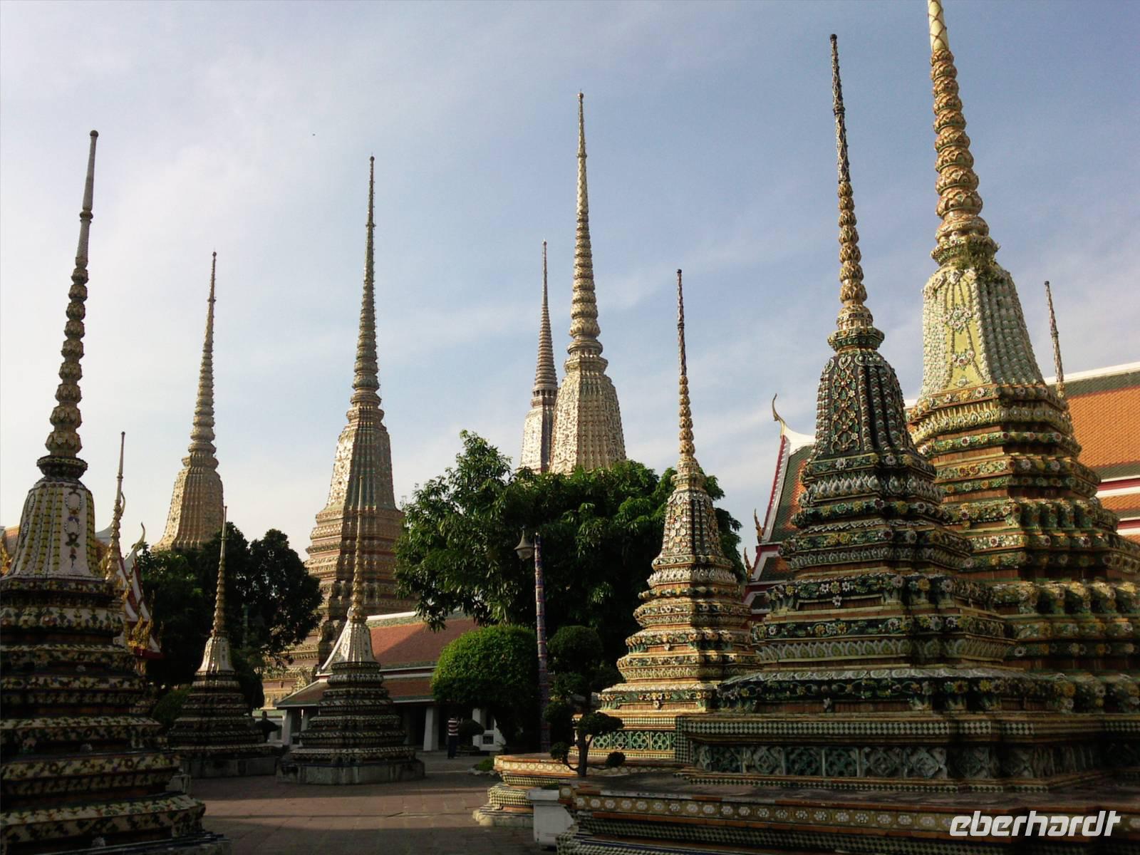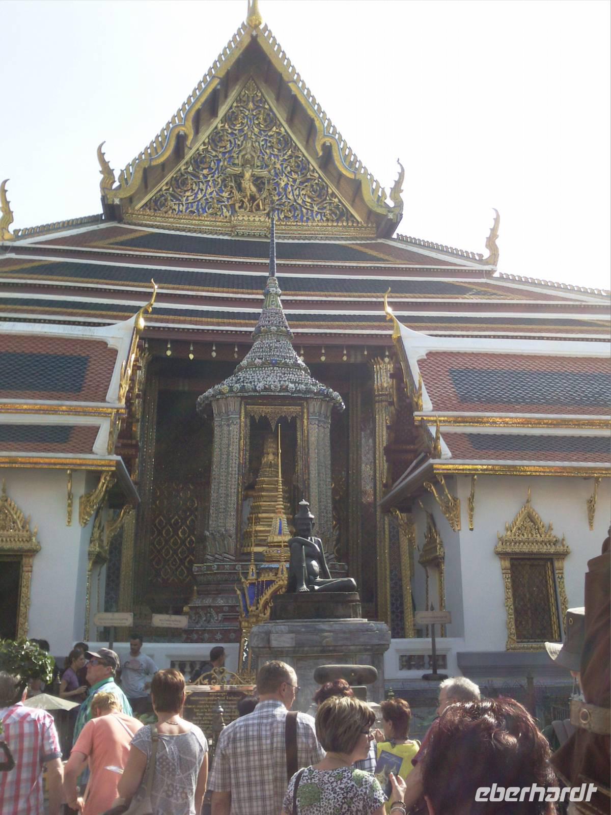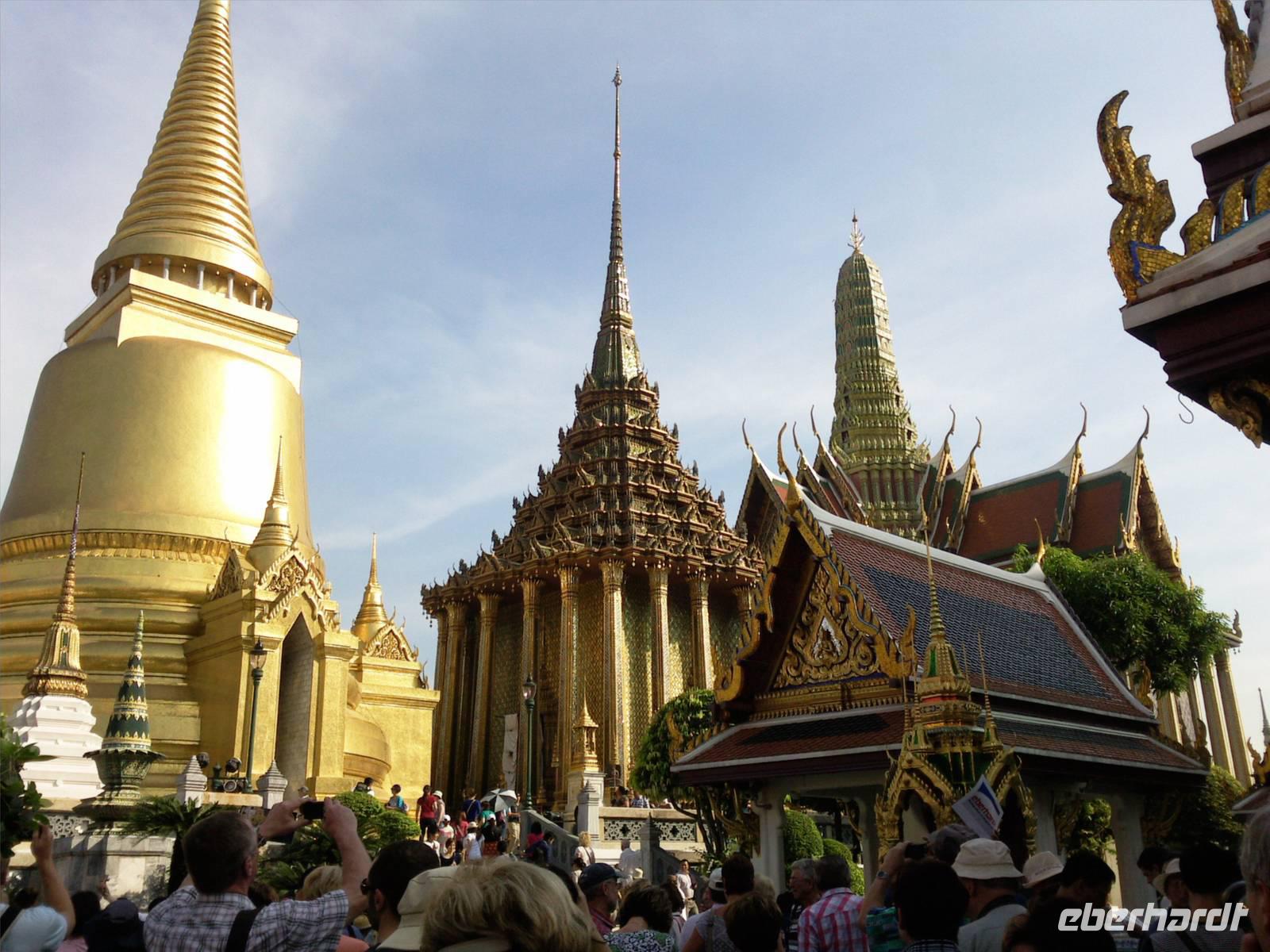 Unsere erste Besichtigung ist der Wat Pho mit der 184 Meter langen Statue des liegenden Buddhas. An seinen Fußsohlen sind die 108 Tugenden des Buddhismus abgebildet. Der Königspalast beeindruckte uns mit seiner Vielzahl von Tempeln uns verzierten Stupas - ein Meisterstück asiatischer Baukunst. Im Wat Pra Keao, offiziell Wat Phra Sri Rattana Satsadaram, bestaunen wir den Smaragd-Buddha. Die kleine Statue sitzt auf einem goldenen Thron, der bereits während der Zeit des Königs Rama I. hergestellt wurde. Um seine Bedeutung zu unterstreichen setzte man ihn zusätzlich auf eine Basis von 11 Meter Höhe.