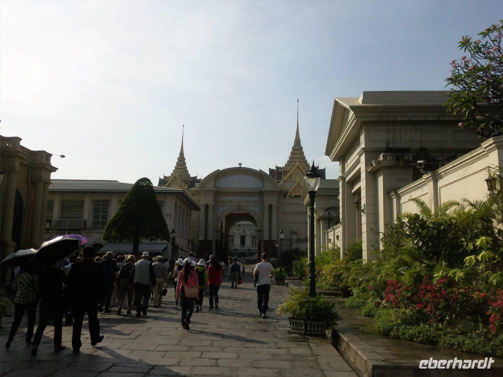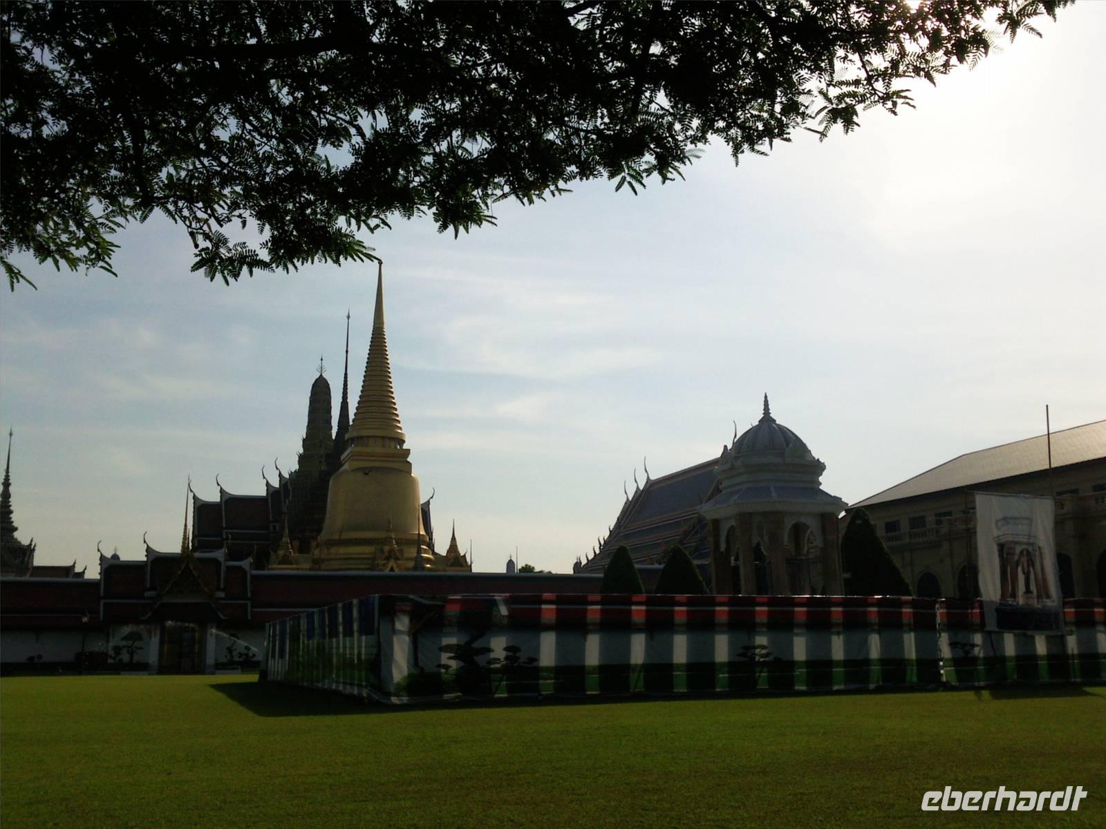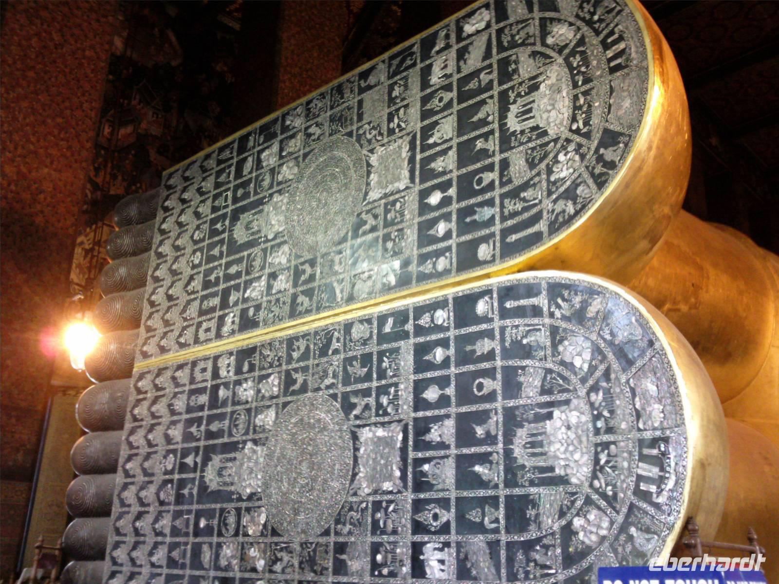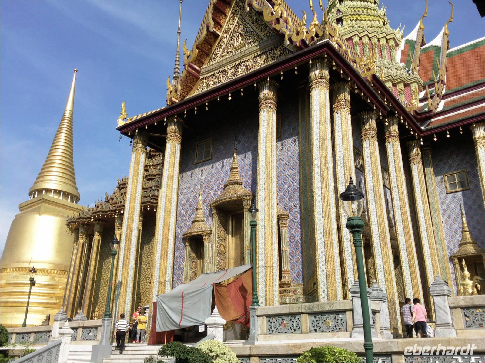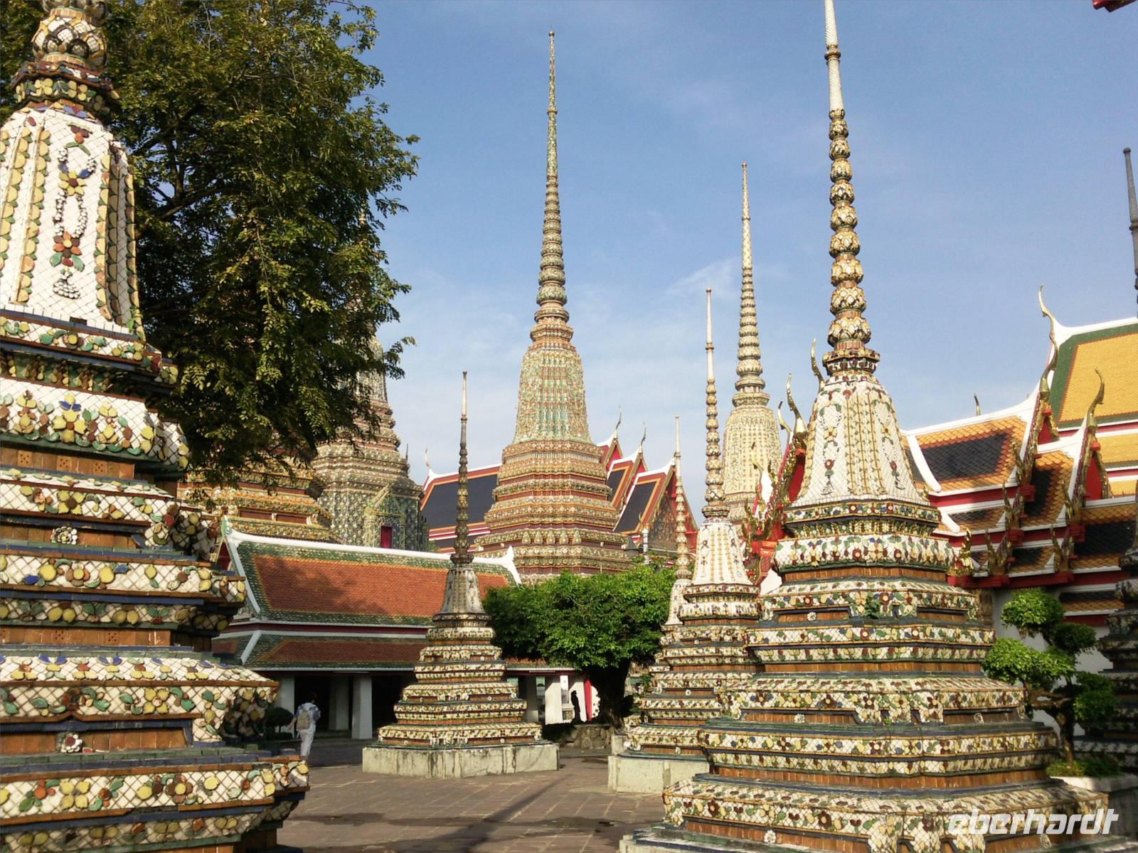 Unsere erste Besichtigung ist der Wat Pho mit der 184 Meter langen Statue des liegenden Buddhas. An seinen Fußsohlen sind die 108 Tugenden des Buddhismus abgebildet. Der Königspalast beeindruckte uns mit seiner Vielzahl von Tempeln uns verzierten Stupas - ein Meisterstück asiatischer Baukunst. Im Wat Pra Keao, offiziell Wat Phra Sri Rattana Satsadaram, bestaunen wir den Smaragd-Buddha. Die kleine Statue sitzt auf einem goldenen Thron, der bereits während der Zeit des Königs Rama I. hergestellt wurde. Um seine Bedeutung zu unterstreichen setzte man ihn zusätzlich auf eine Basis von 11 Meter Höhe.