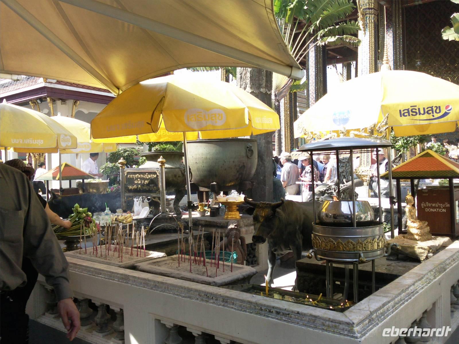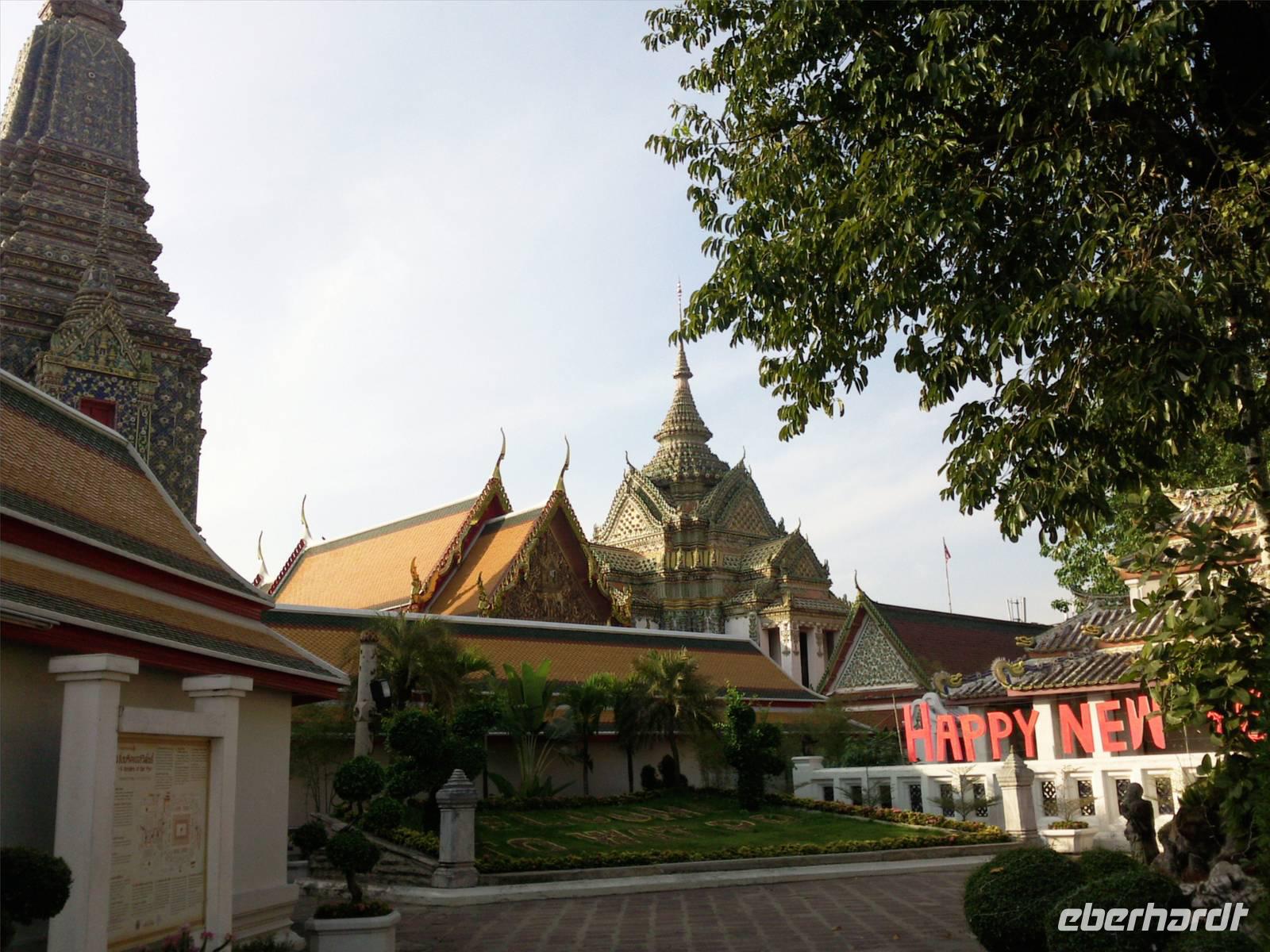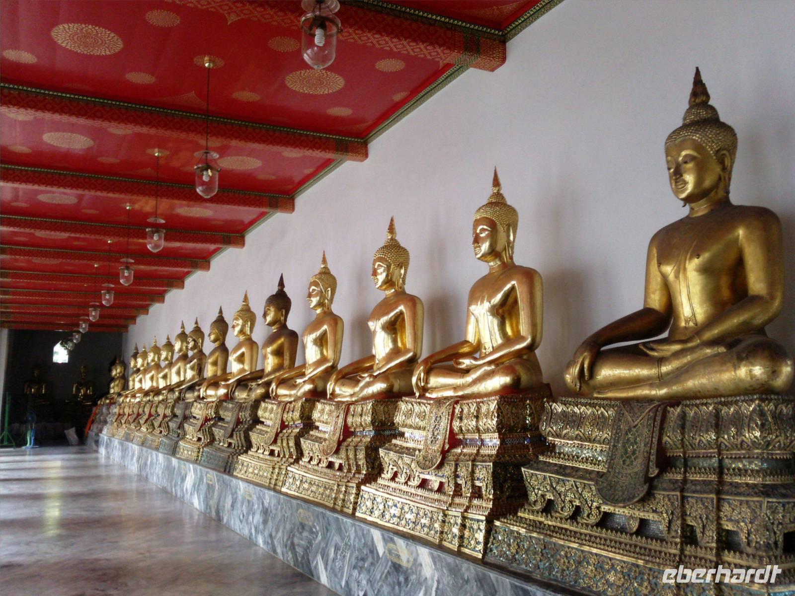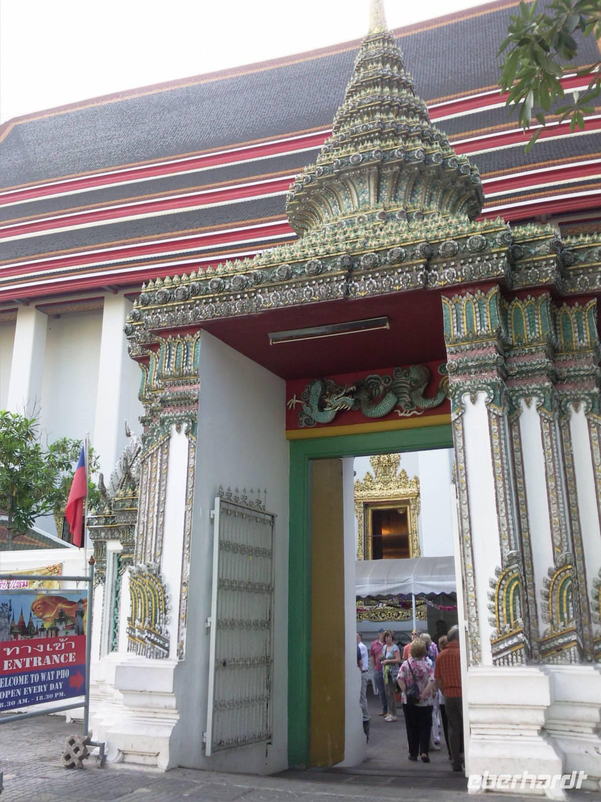 Unsere erste Besichtigung ist der Wat Pho mit der 184 Meter langen Statue des liegenden Buddhas. An seinen Fußsohlen sind die 108 Tugenden des Buddhismus abgebildet. Der Königspalast beeindruckte uns mit seiner Vielzahl von Tempeln uns verzierten Stupas - ein Meisterstück asiatischer Baukunst. Im Wat Pra Keao, offiziell Wat Phra Sri Rattana Satsadaram, bestaunen wir den Smaragd-Buddha. Die kleine Statue sitzt auf einem goldenen Thron, der bereits während der Zeit des Königs Rama I. hergestellt wurde. Um seine Bedeutung zu unterstreichen setzte man ihn zusätzlich auf eine Basis von 11 Meter Höhe.