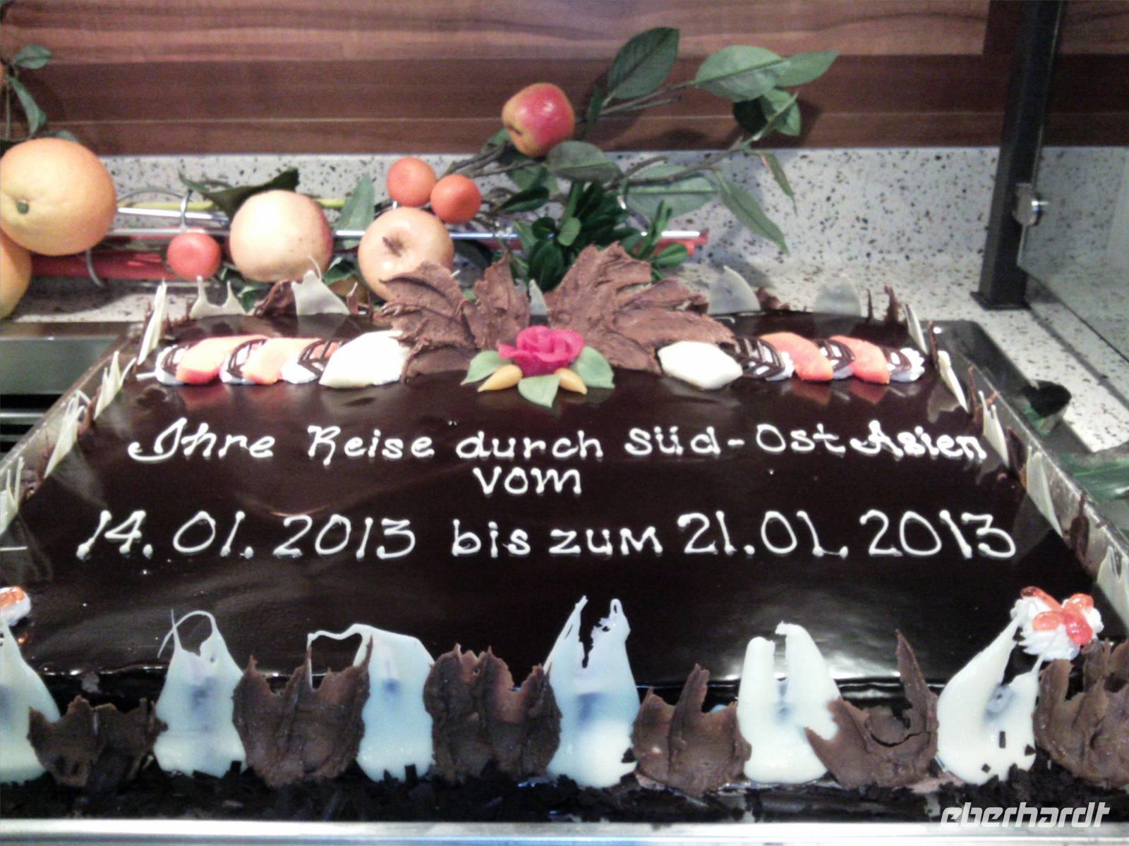 Nach mehr als 3.500 nautischen Meilen erreichen wir am Morgen den Hafen von Laem Chabang. Da unser Flug erst in der Nacht von Bangkok startet, bleibt uns noch ein ganzer Tag an Bord. Jeder geht noch einmal zu seinem Lieblingsplatz, probiert was er/sie in den letzten Tagen nicht geschafft hat und ruht sich vor dem Flug noch einmal richtig aus. Am Nachmittag finden sich alle in der Anytime Bar ein, um die Schnappschüsse, die während der Reise entstanden sind, gemeinsam anzusehen und auf die gelungene Reise anzustoßen. Vollgepackt mit großartigen Erlebnissen und Erinnerungen nehmen wir Abschied von Südostasien. Hoffentlich heißt es bald wieder „Auf AIDA seh'n!"
