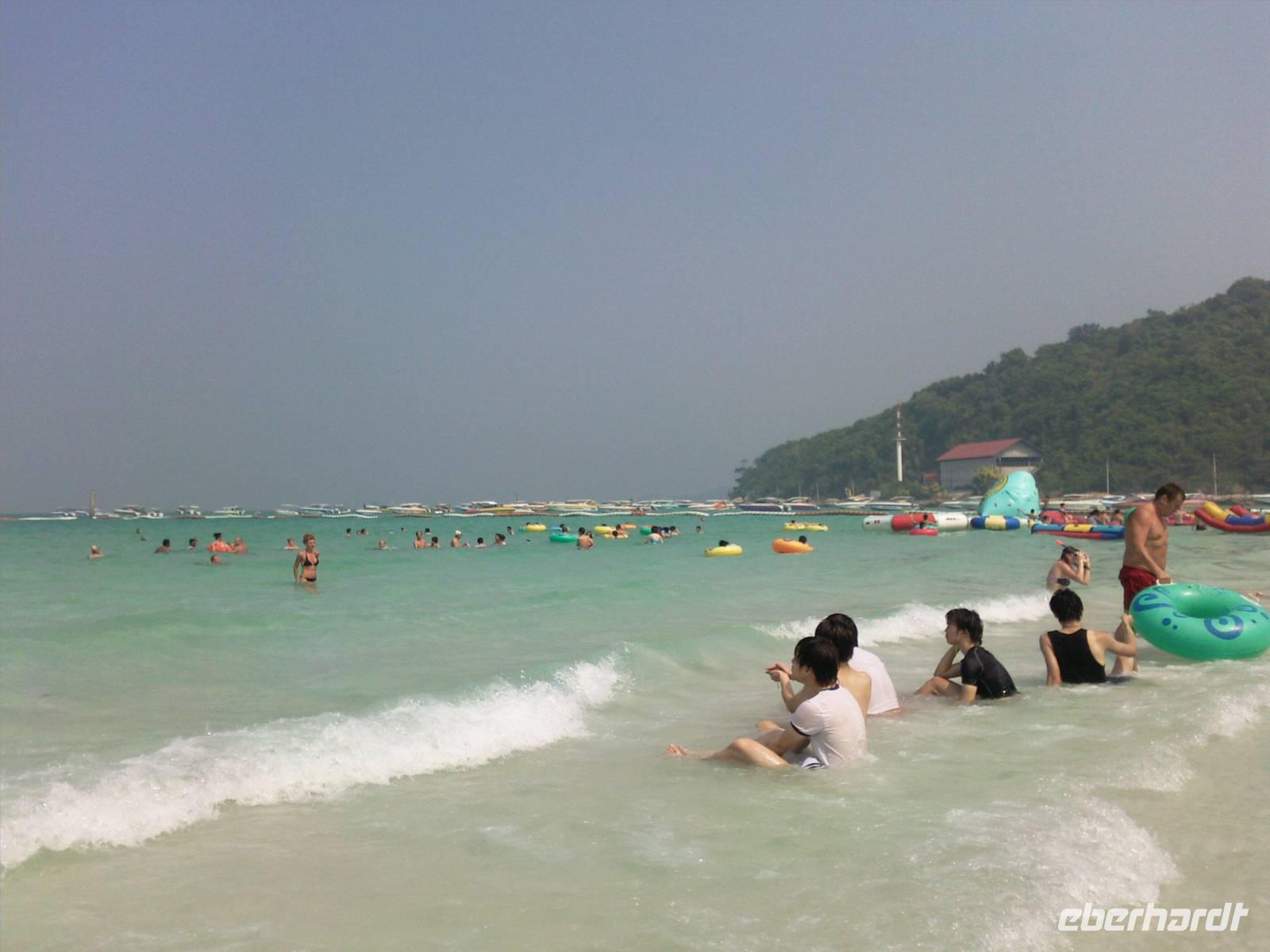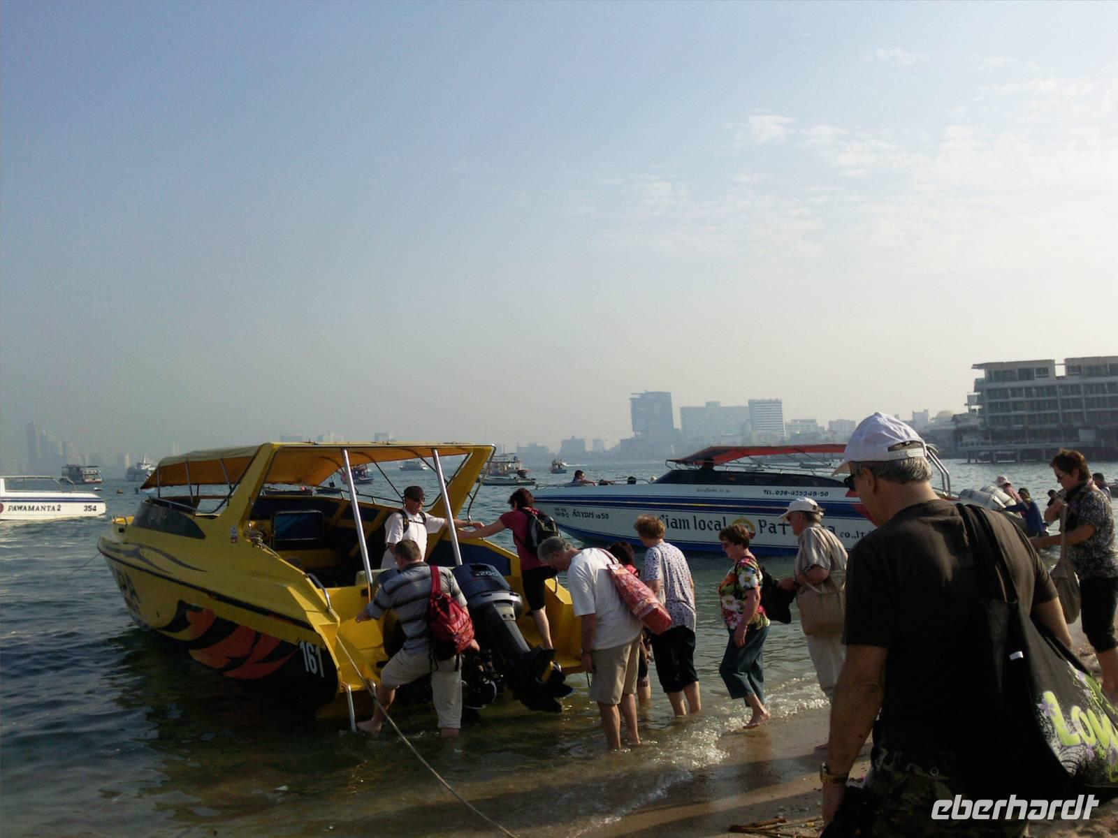 Wir freuen uns alle auf einen entspannten Tag am Meer und es scheint nichts auszumachen, dass es doch schon 07:45 Uhr losgeht. Mit dem Bus fahren wir nach Pattaya. Hier wechselten wir das Beförderungsmittel und stiegen um auf ein Speedboot, das uns auf die Insel Koh Larn bringt. Auf den Liegen am feinen weißen Sandstrand machen wir es uns gemütlich. Das kristallklare Wasser lädt zum Baden ein oder man lässt sich für wenige Baths massieren und verwöhnen. Einige Gäste gehen noch etwas spazieren in die umliegenden, fast unberührten Wälder. Am Nachmittag geht es wieder zurück an Bord der „AIDAdiva". Bevor unser Schiff aber ablegen kann, müssen alle an der Seenotrettungsübung teilnehmen. Danach darf in den drei verschiedenen Restaurants „Marktrestaurant", „Weite Welt Restaurant" und „Bella Vista" mit einer eigenen Pizzeria geschlemmt werden. Nun heißt es „Schiff ahoi!"