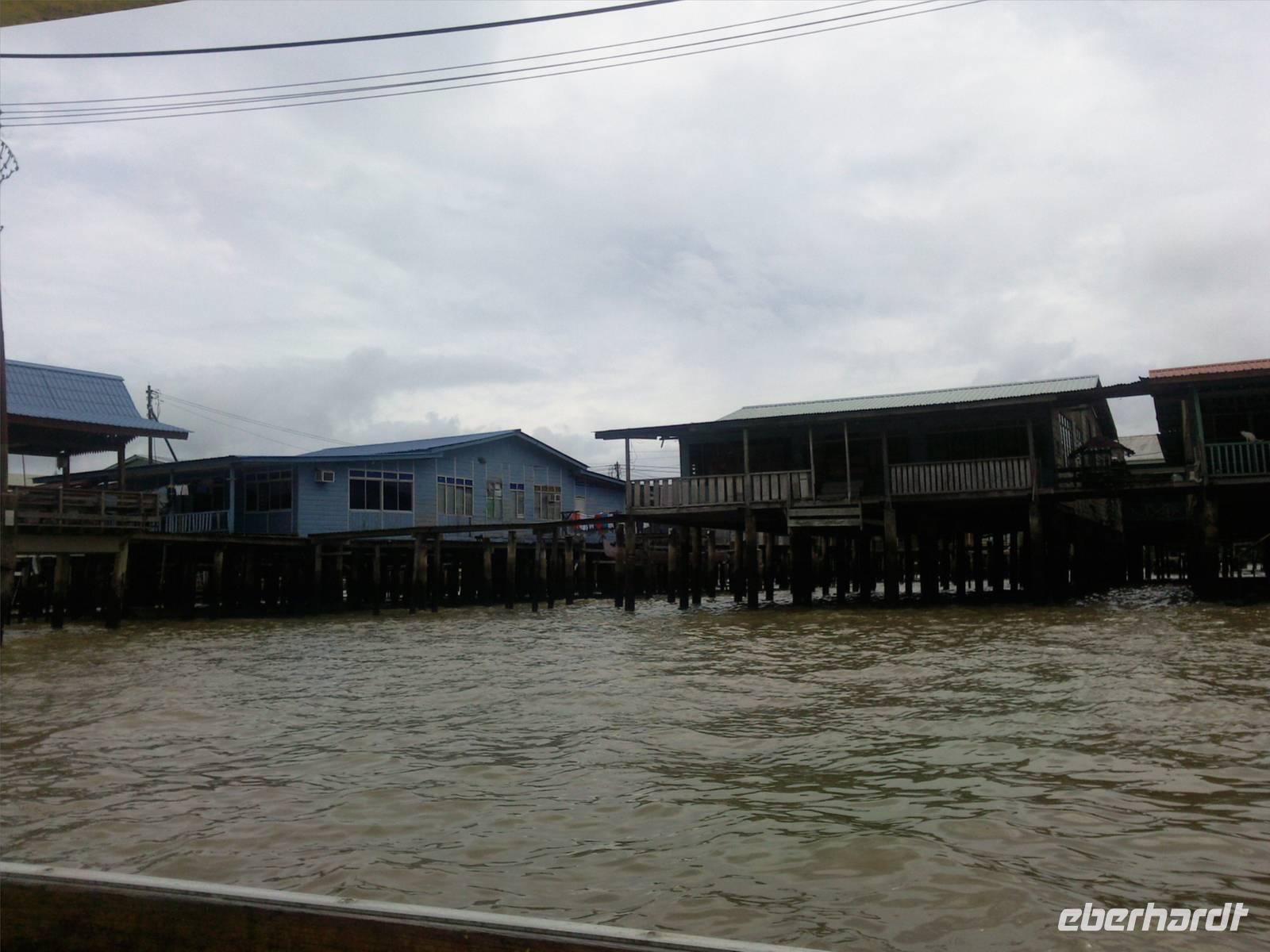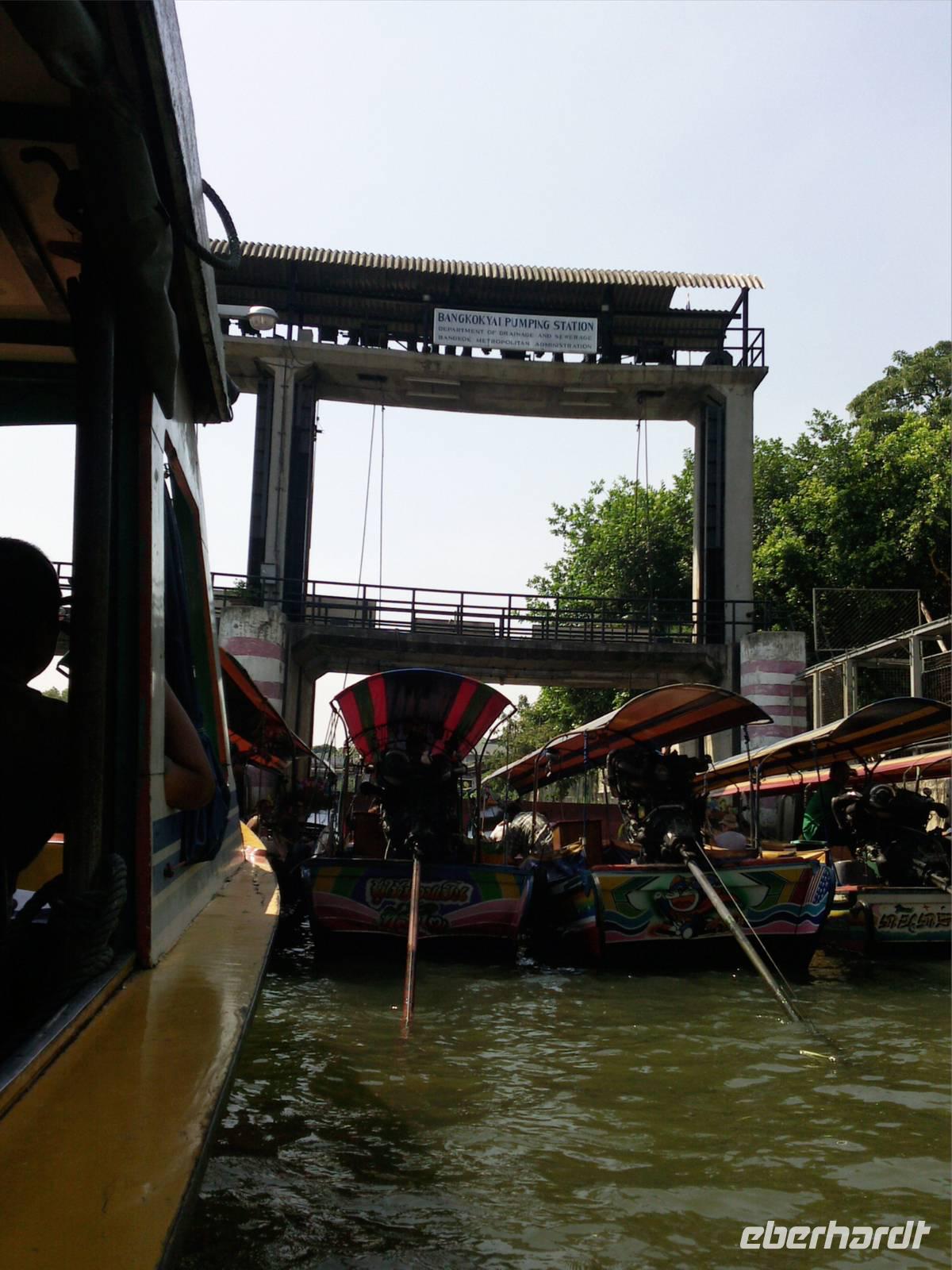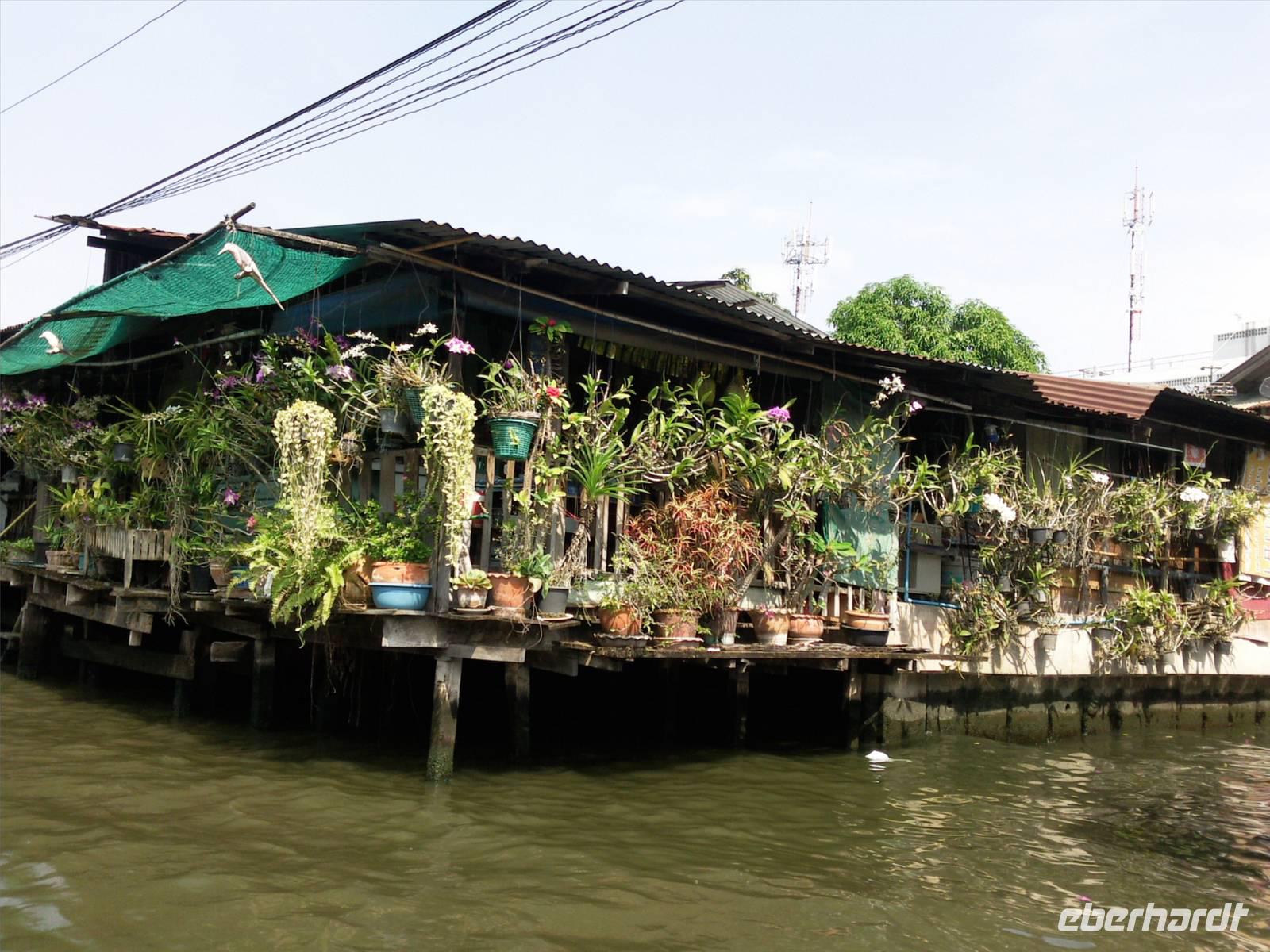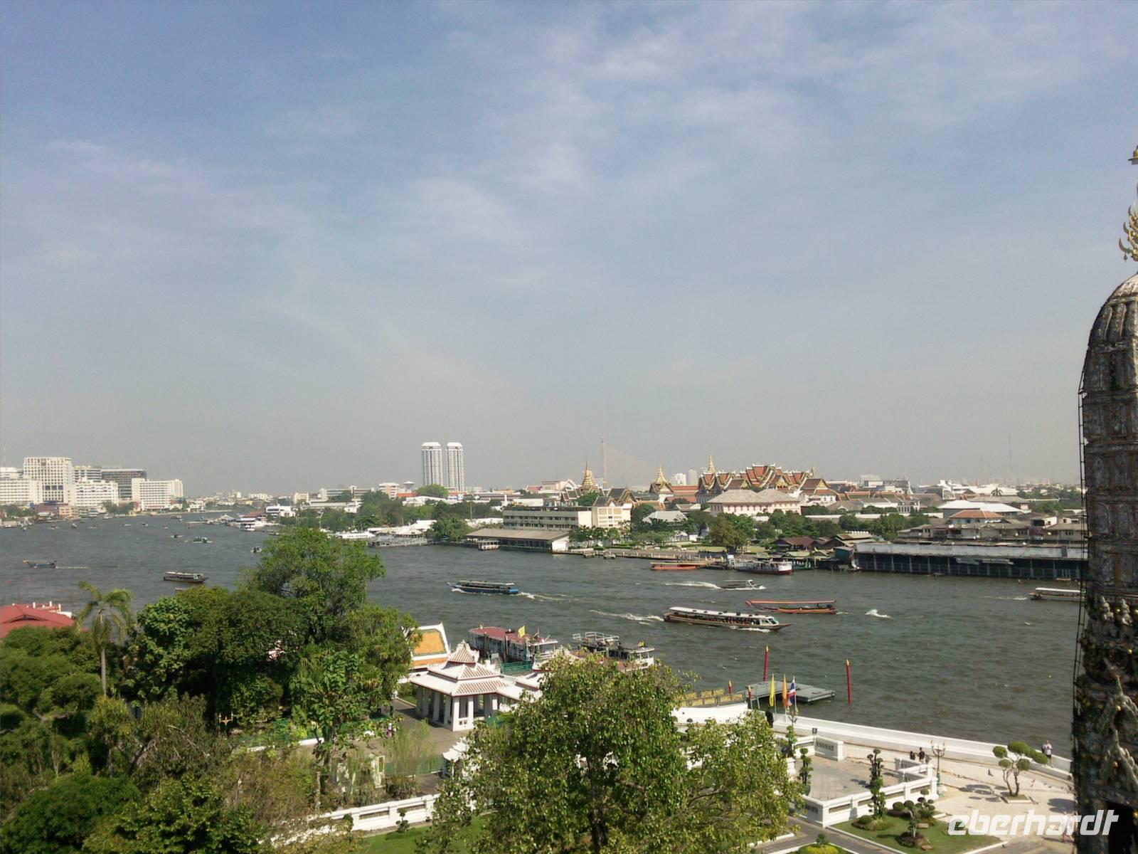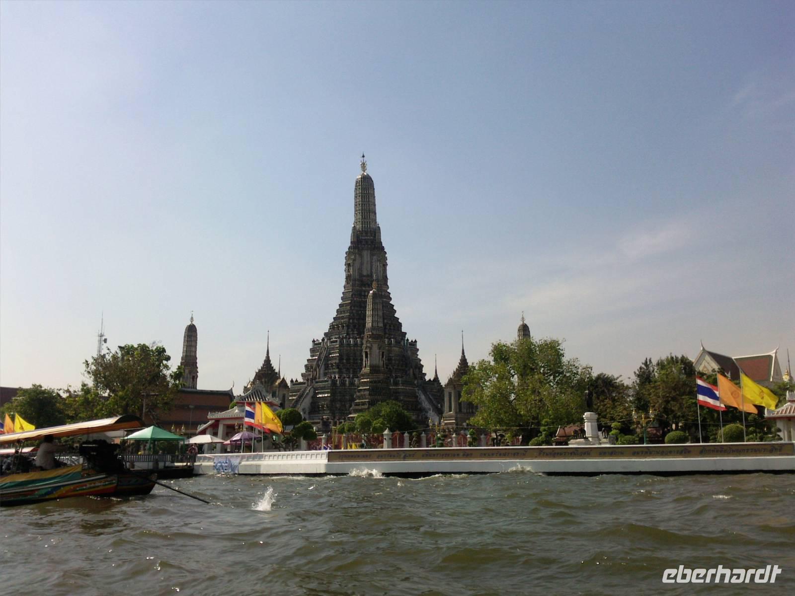 Schließlich geht es mit dem Boot zum Wat Arun. Wer die vielen schmalen Stufen nach oben überwindet, wird mit einem herrlichen Blick auf die Umgebung am Fluss belohnt. Weiter geht es mit dem kleinen Boot durch die Klongs (Kanäle) der Stadt. So gewinnen wir einen Einblick in das Leben der Thais am Ufer des Flusses. Die Häuser sind meist aus Holz und auf Pfählen im Fluss gebaut, oft in sogenannten „Bretterbuden". Für Europäer sehen Sie weniger wohnlich aus, doch die Menschen scheinen mit dem zufrieden zu sein, was sie haben und winken uns freundlich zu.