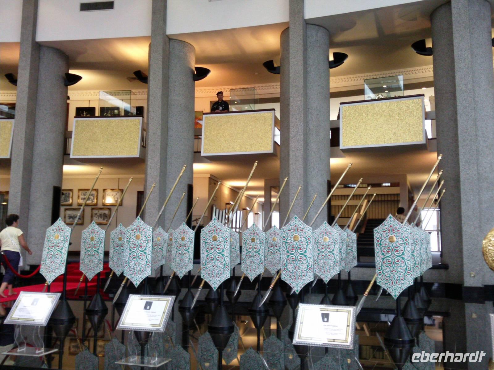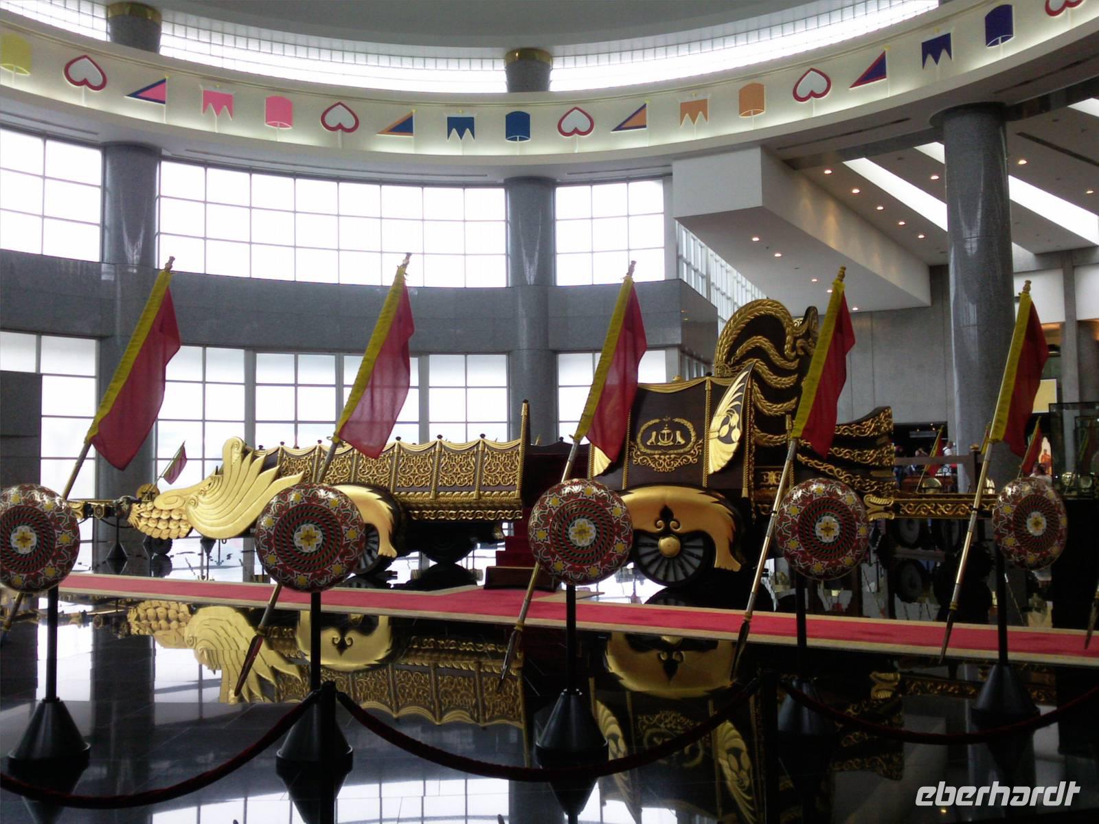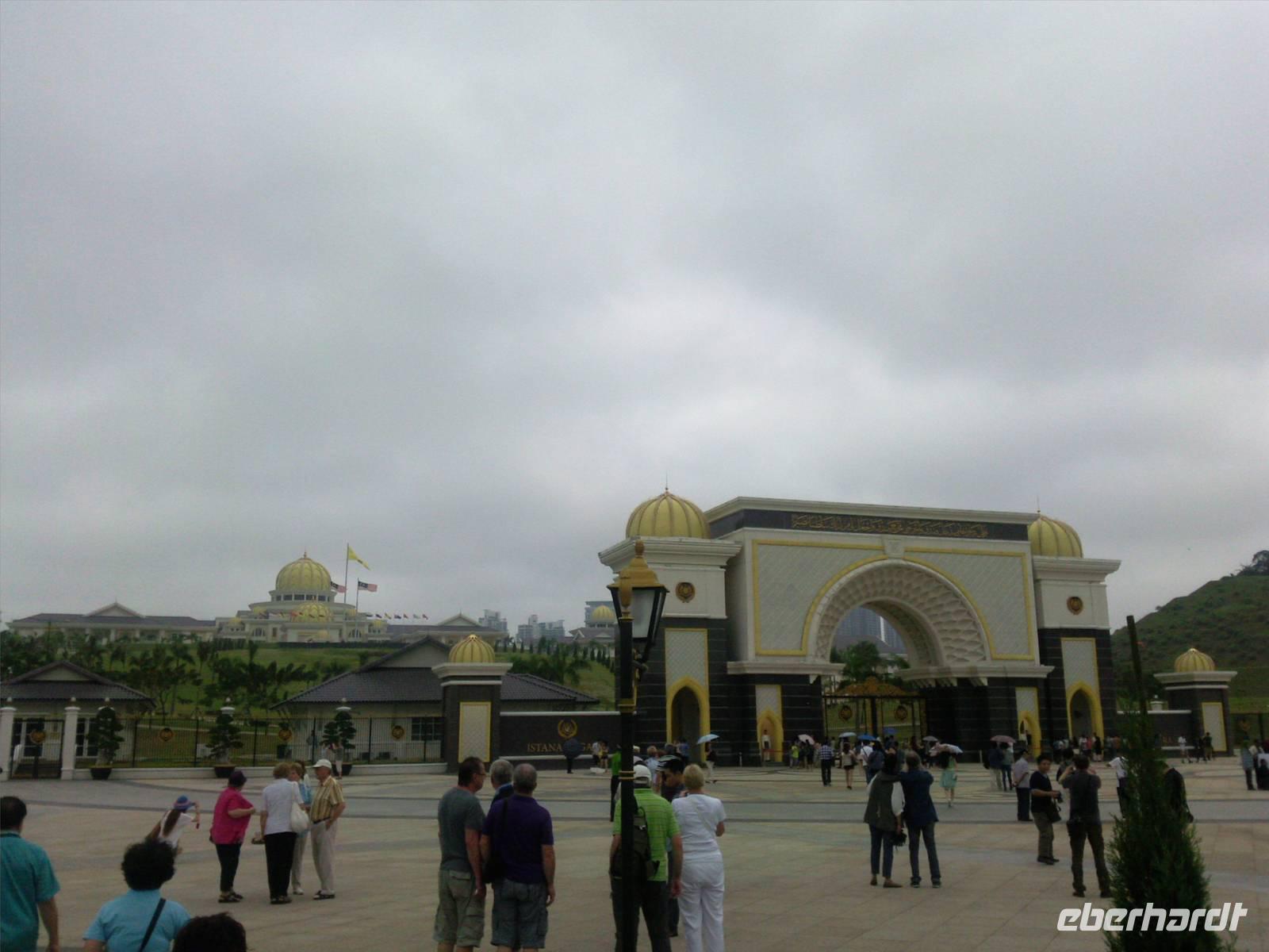 Wir erreichen am frühen Morgen das Sultanat Brunei, amtlich Negara Brunei Darussalam. Brunei ist zwar eines der kleinsten, aber auch eines der reichsten Länder der Welt. Sein Reichtum ist vor allem den Erdöl- und Erdgasvorkommen zu verdanken. Vom Hafen Muara fahren wir in die Hauptstadt Bandar Seri Begawan. Der erste Stopp ist das Nationalmuseum „Royal Regalia". Unsere Reiseleiterin weiht uns in die Kostbarkeiten des Sultans ein und erzählt uns Interessantes über das Leben der Königsfamilie. Wie wir von unserer Reiseleiterin erfahren haben ist der Sultan zweifach geschieden, Vater von zwölf Kindern und inzwischen 65 Jahre alt. Sein Palast besitzt 1700 Zimmer. Unter der Erde sammelt er 500 Mercedes, über 300 Ferraris, 20 Lamborhini und viele weitere „große Spielzeuge". Ein weiteres Hobby ist der Polosport. Mit einem Holzboot setzen wir unsere Erkundungen fort und fahren zu dem Wasserdorf, dem größten der Welt. Unzählige Häuser aus Holz stehen auf Pfählen im Fluss. Bei einer einheimischen Familie sind wir zum Tee und Gebäck eingeladen. Der Gastwirt stellt uns sein Zuhause vor. In der Wohnstube hängen große Bilder der Königsfamilie, die im ganzen Land verehrt wird. Weiter geht es zur prachtvollen Jame' Asri Hassanil Bolkiah-Moschee des Königs. Diesen hat er sich selbst zum Geburtstag errichten lassen. Mit 29 Türmen aus überwiegend italienischem Mamor und Swarovski-Kristalle aus Österreich sowie Mosaike aus Shanghai ragt er prunkvoll empor. Außer den goldenen Moscheen und dem Wasserdorf ist auch der unberührte Urwald ein Erlebnis. Einige unserer Gäste haben den Ausflug in die Natur mit AIDA unternommen und sind begeistert von der Flora und Fauna Bruneis.