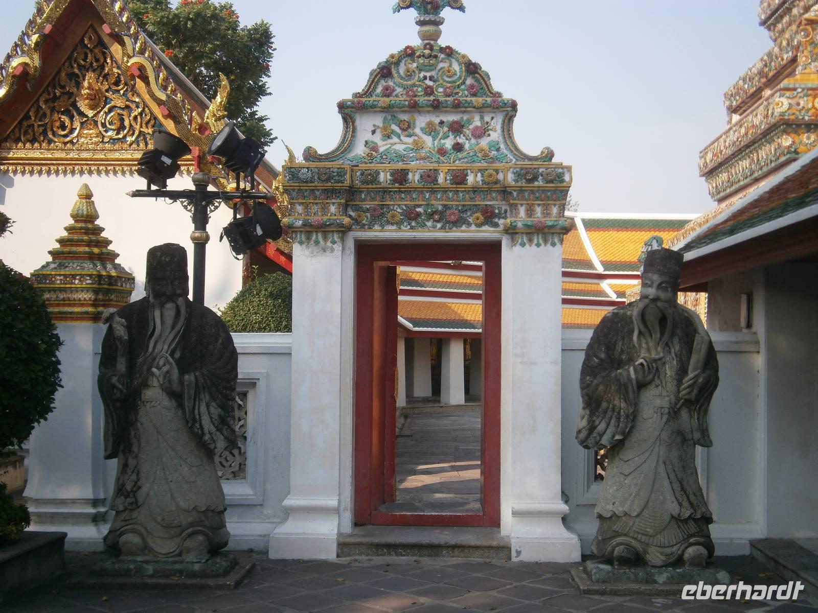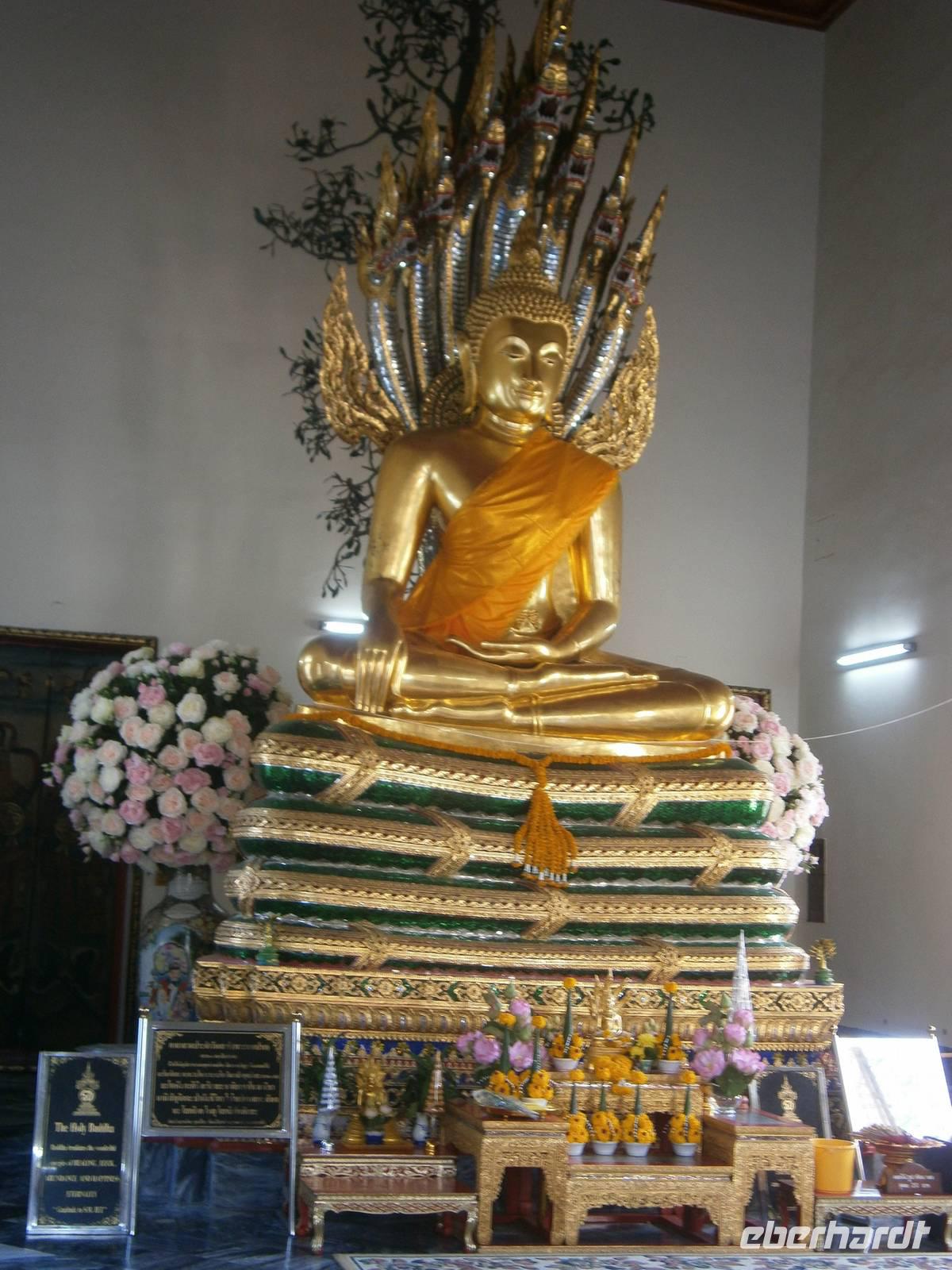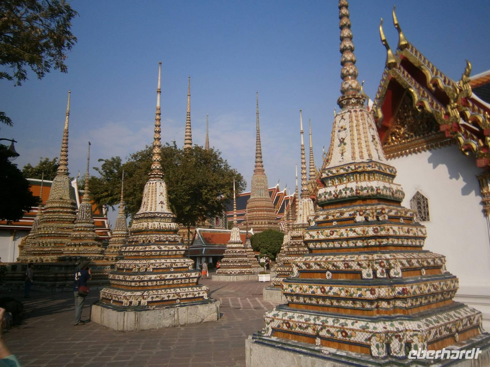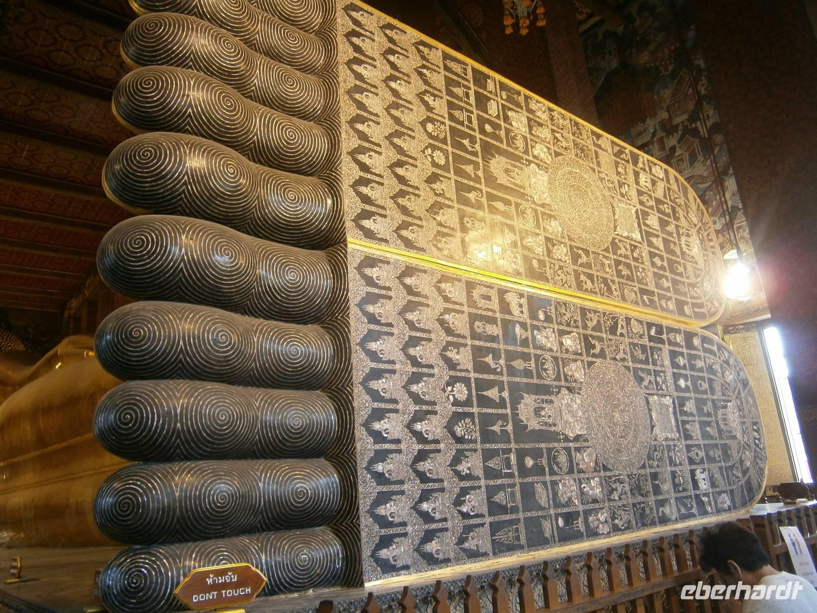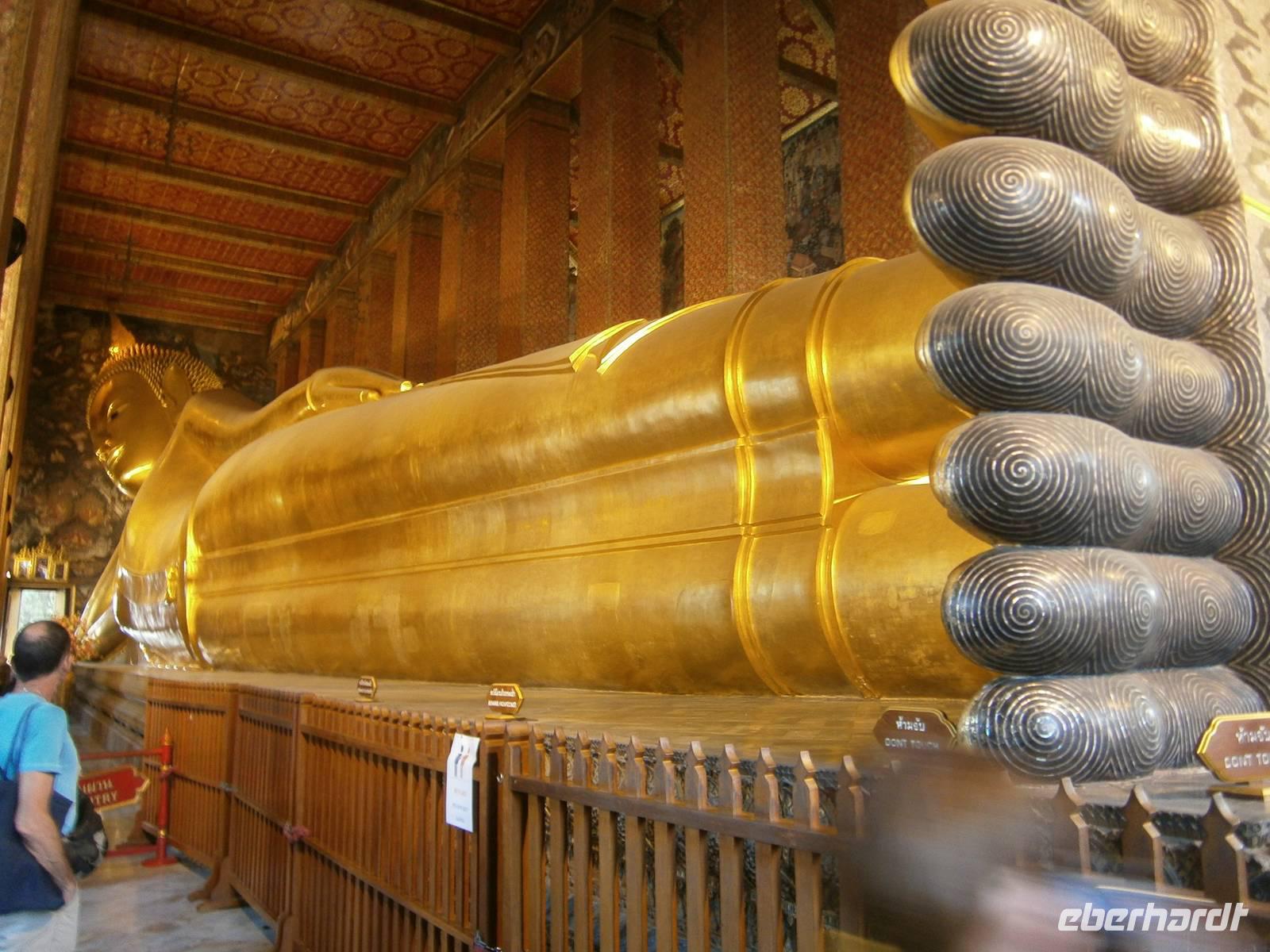 Unsere erste Besichtigung ist der Tempel Wat Pho. Die vergoldete, 45 m lange, liegende Statue symbolisiert Buddha bei seinem Eintritt ins Nirvana. An den mächtigen Fußsohlen stellen 108 Tafeln aus Perlmutt die Tugenden eines wahrhaften Buddhisten dar.