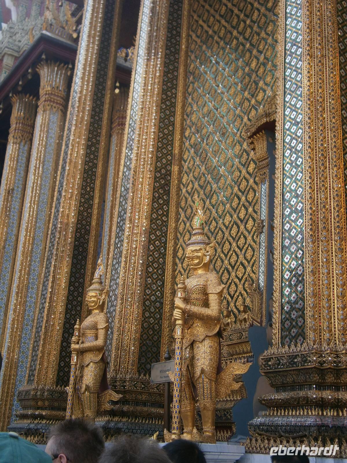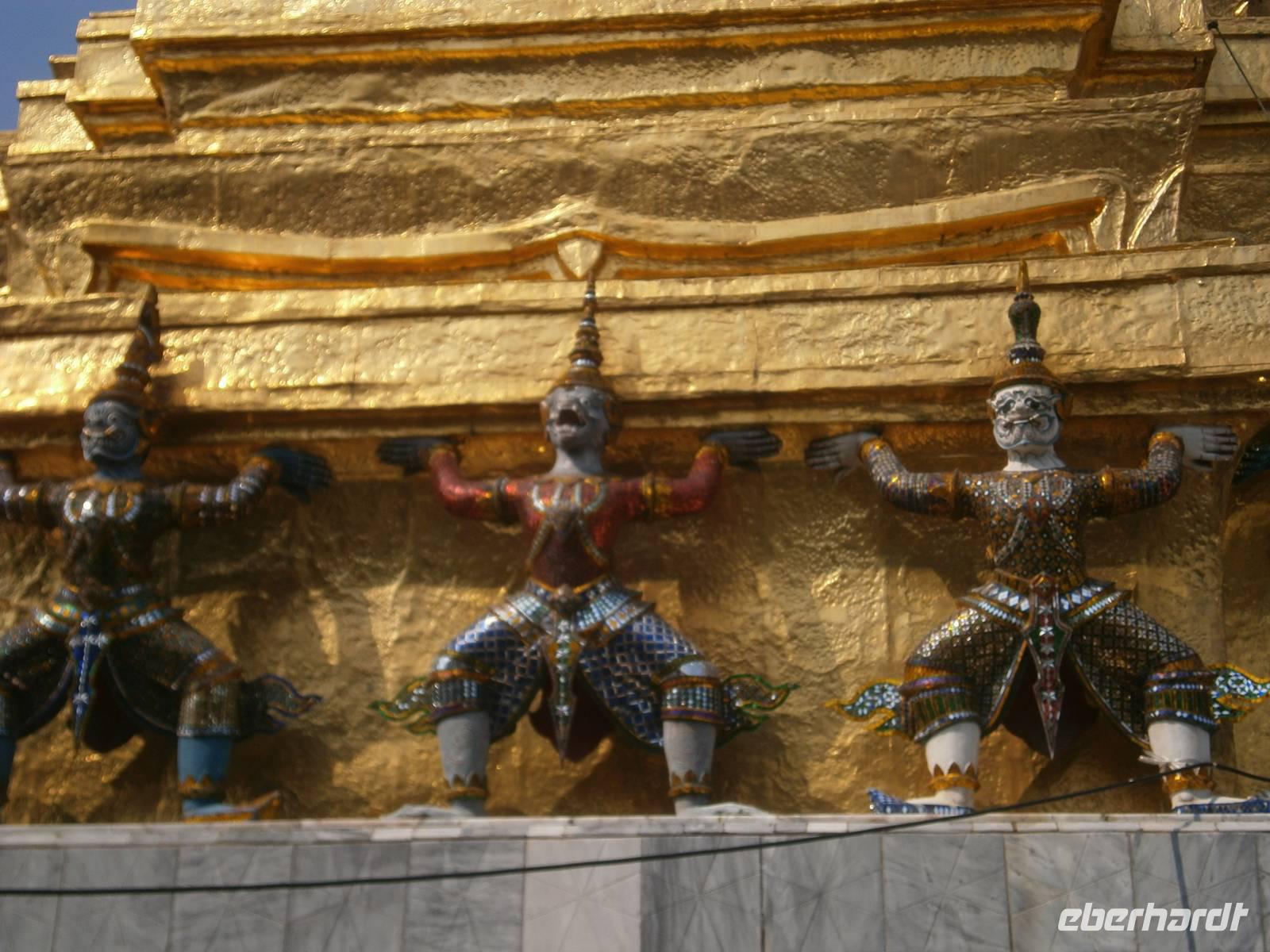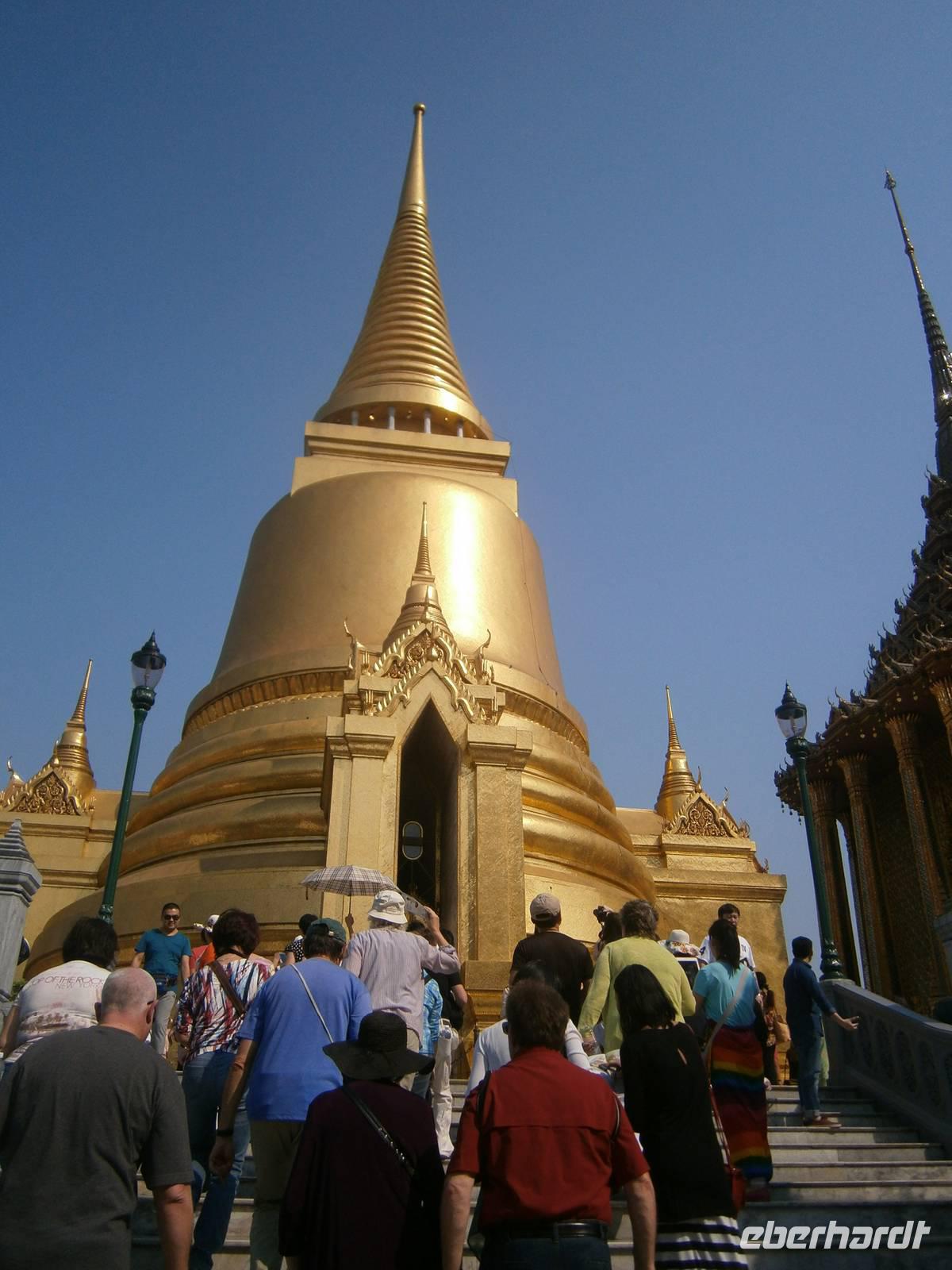 Im Tempel Wat Phra Keao, offiziell Wat Phra Sri Rattana Satsadaram, bestaunen wir den Smaragd-Buddha. Die kleine Statue sitzt auf einem goldenen Thron, der bereits während der Zeit des Königs Rama I. hergestellt wurde. Um seine Bedeutung zu unterstreichen, setzte man ihn zusätzlich auf eine Basis von 11 Meter Höhe.